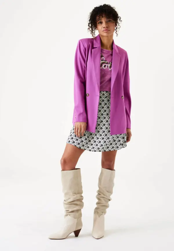Combinando a história dos fundadores da Garcia Jeans, Maurizio e Isabella Gracia, as suas coleções produzem uma seleção forte de roupas de dia a dia que inspirou o amor do fundador de fazer com que as meninas parecessem mais bonitas no seu dia-a-dia. Assim é este blazer rosa traçado da Garcia. Com gola de virados, mangas compridas, bolsos e botões. Combina para parte de baixo com calça mas dentro do mesmo estilo. A modelo está a vestir o tamanho S.