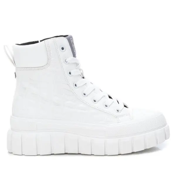 Conhecida por seu estilo urbano e design incomum, a Refresh incorpora detalhes inovadores. Combinados com silhuetas inspiradas em streetwear e uma estética jovial. Assim são estas botas brancas c/ reptil da Refresh. Apresenta uma sola de borracha e atacadores. Para parte de cima combina na perfeição com camisolas, mas dentro do mesmo estilo. O modelo está  no tamanho 37.