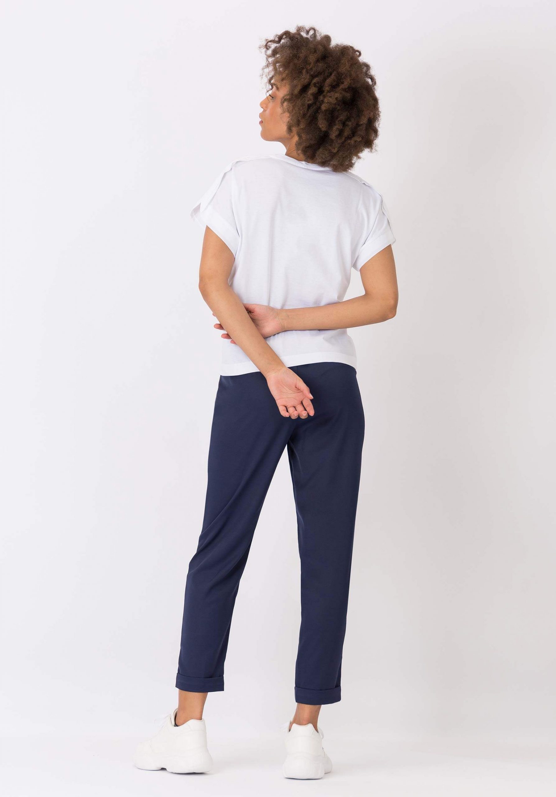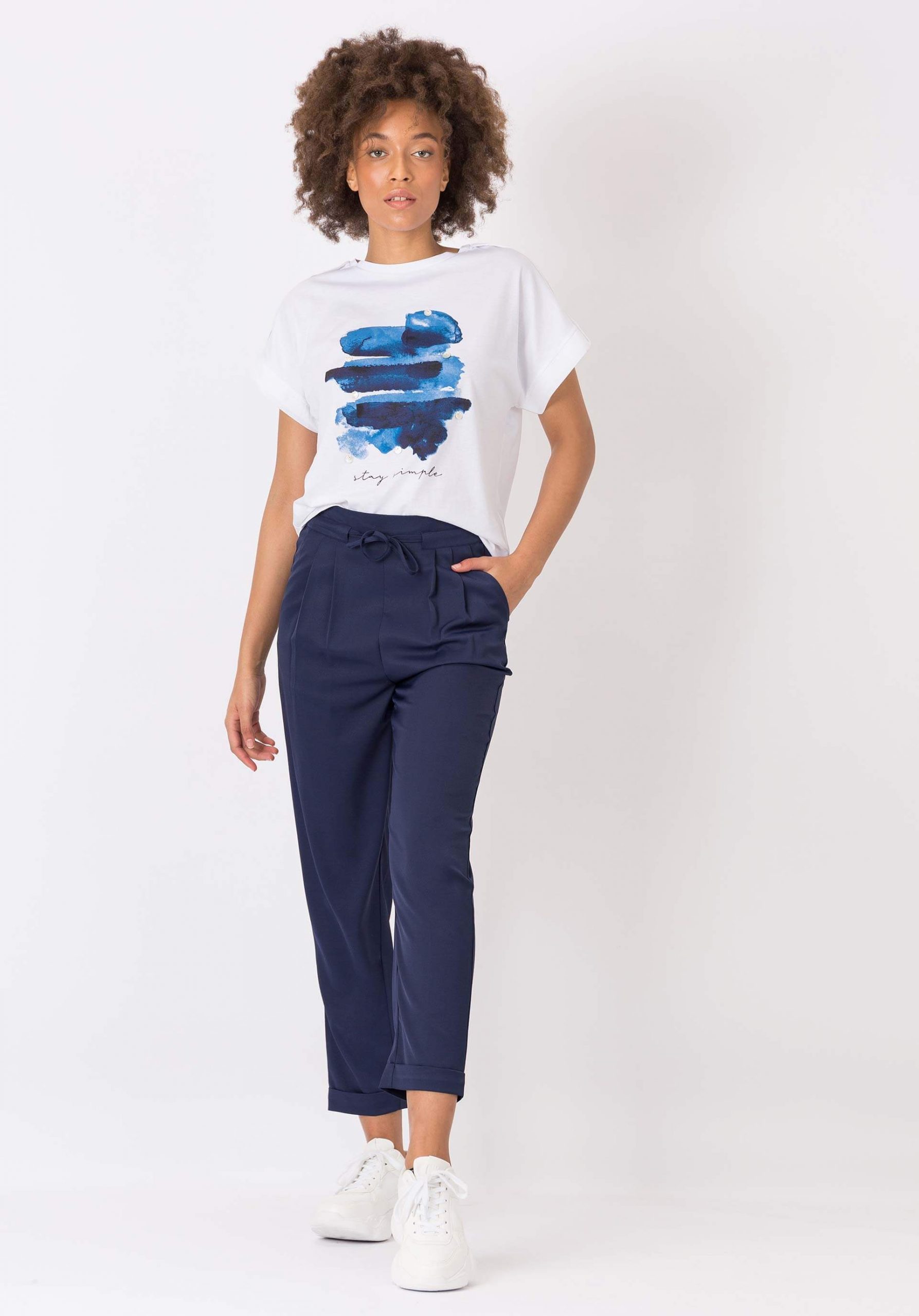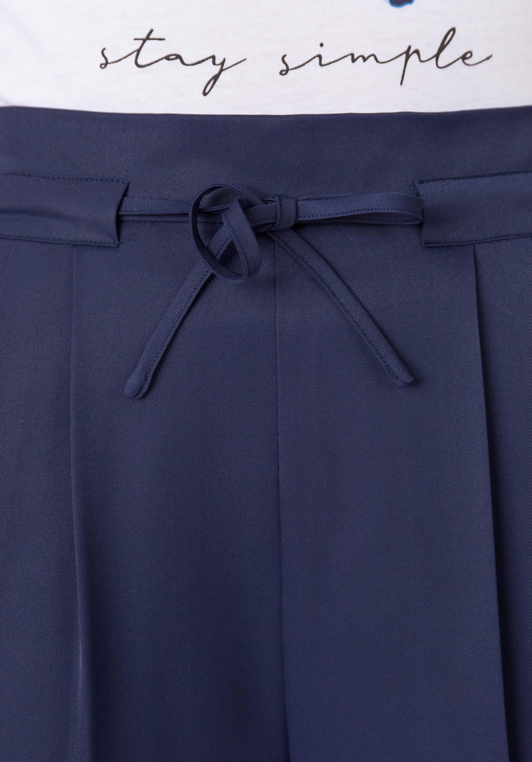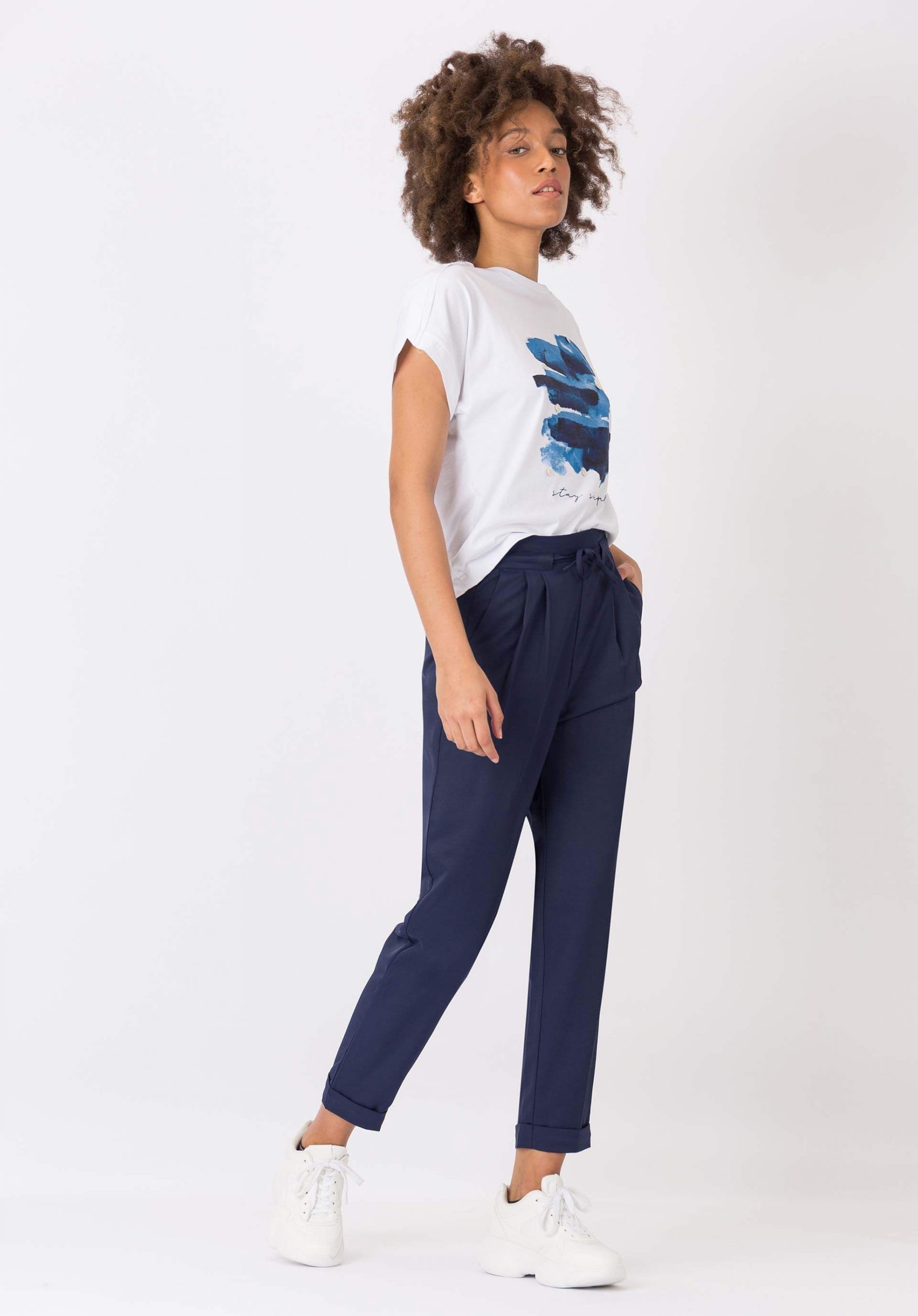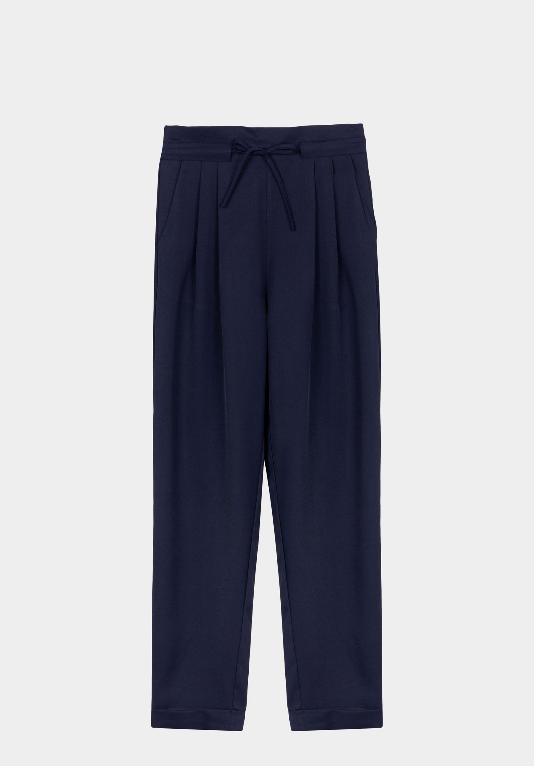 Pense em silhuetas dos anos 80, painéis pesados, denim super skinny e estampas de bandana. Pois bem essa era voltou aos dias de hoje. Assim são estas calças azuis c/ pregas da Tiffosi. Apresenta um cós com largo com elástico e laço, tem dois bolsos metidos nas laterais. Para parte de cima combina na perfeição com camisa ou camisola mas a dar com o tom. A manequim está a vestir o tamanho S.