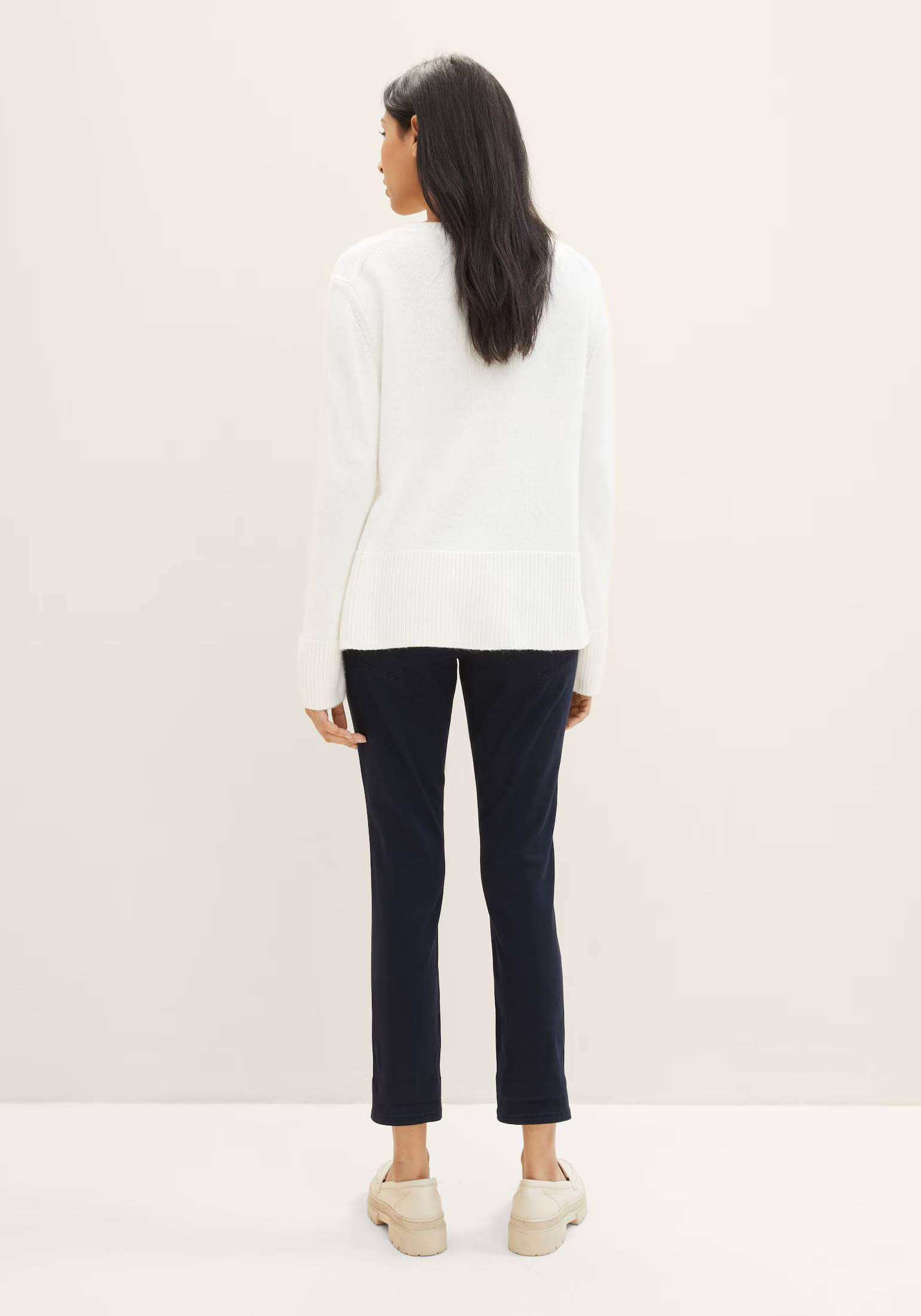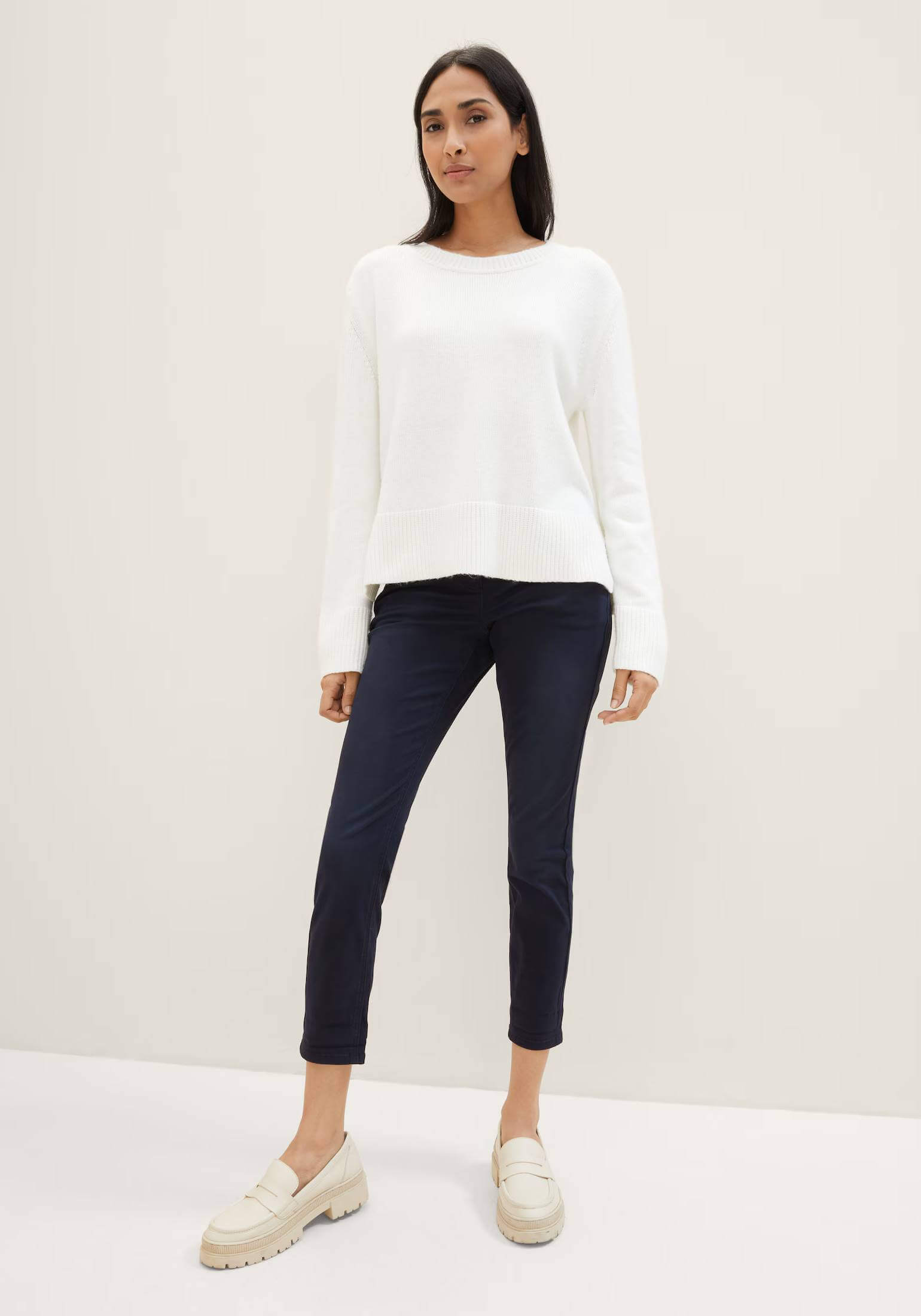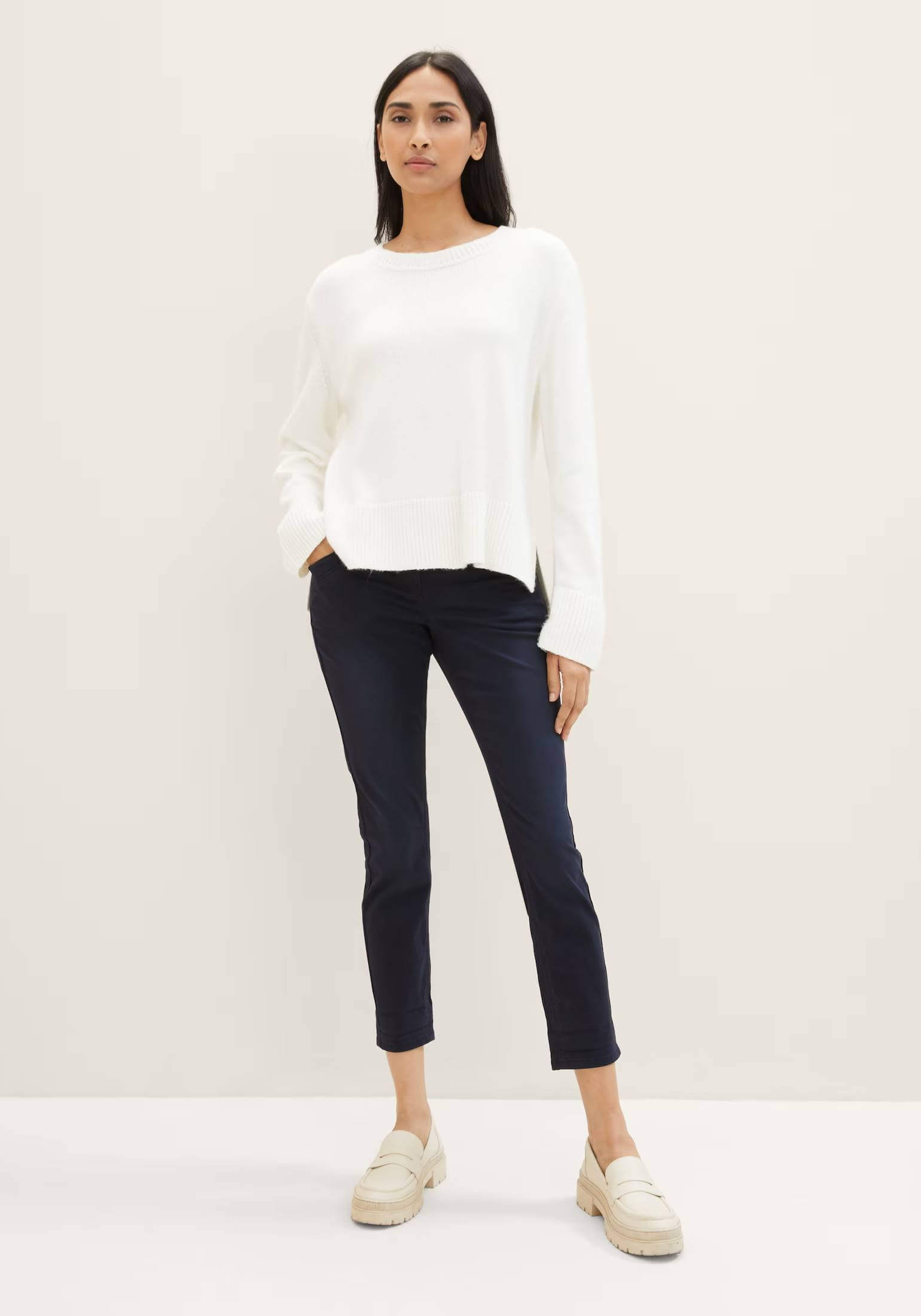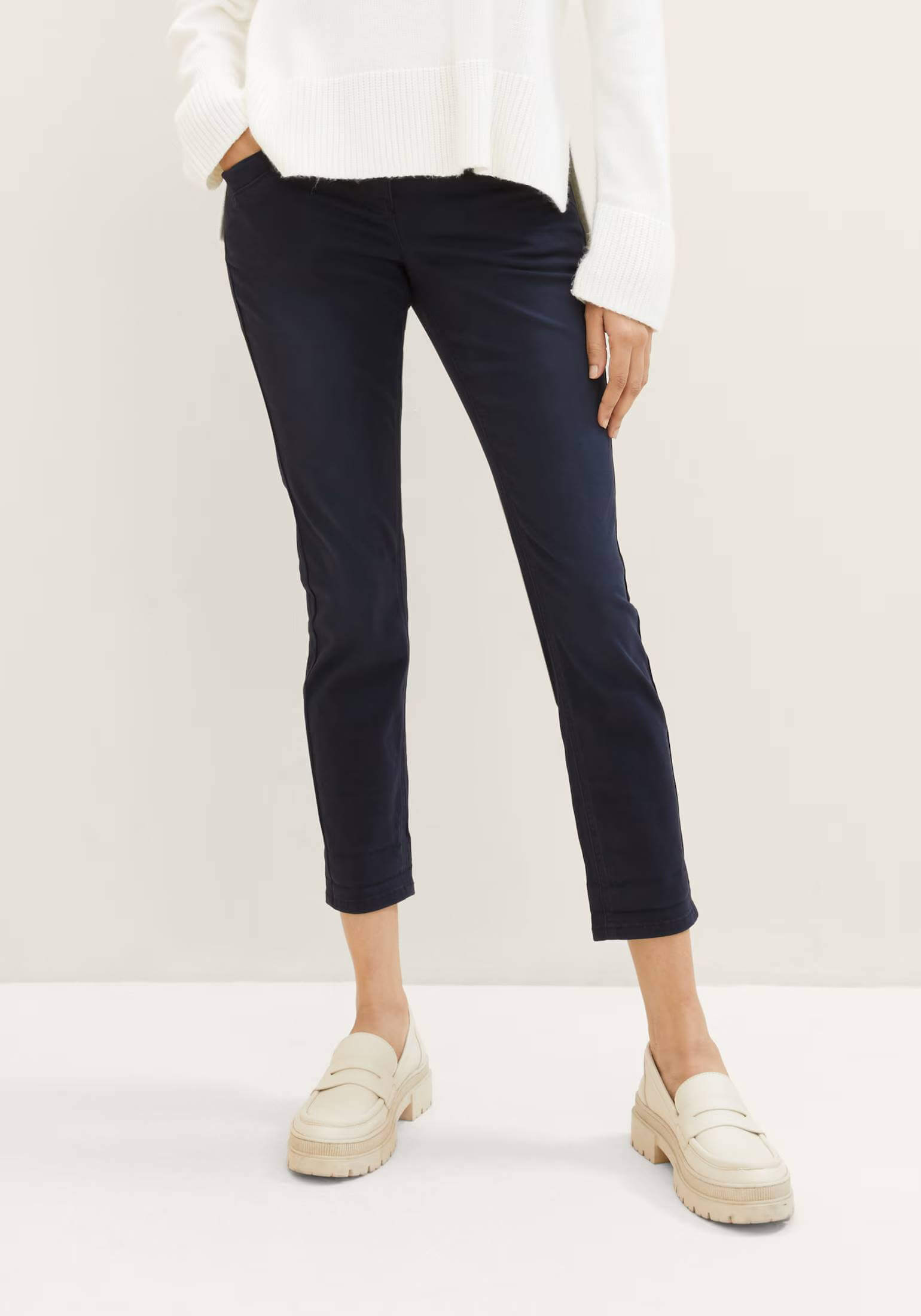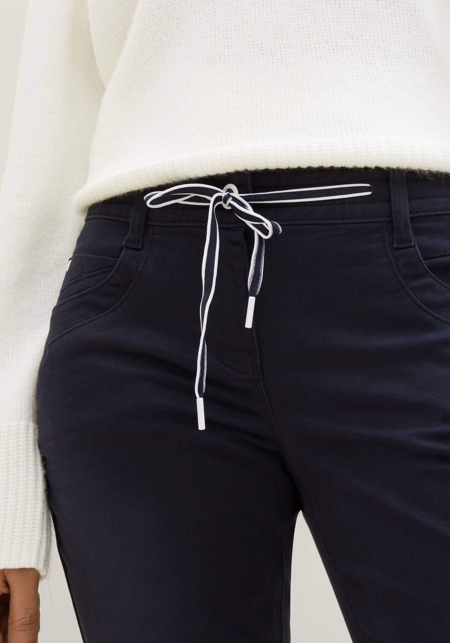 Conhecida por seu estilo urbano e design incomum, a Tom Tailor incorpora detalhes inovadores. Combinados com silhuetas inspiradas em streetwear e uma estética jovial. Assim são estas calças azuis tapered relaxed da Tom Tailor. Apresenta corte com 5 bolsos, tem cinto metido no cós. Para parte de cima combina na perfeição com casaco de ganga, mas dentro do mesmo estilo. A modelo está a vestir o tamanho 36.