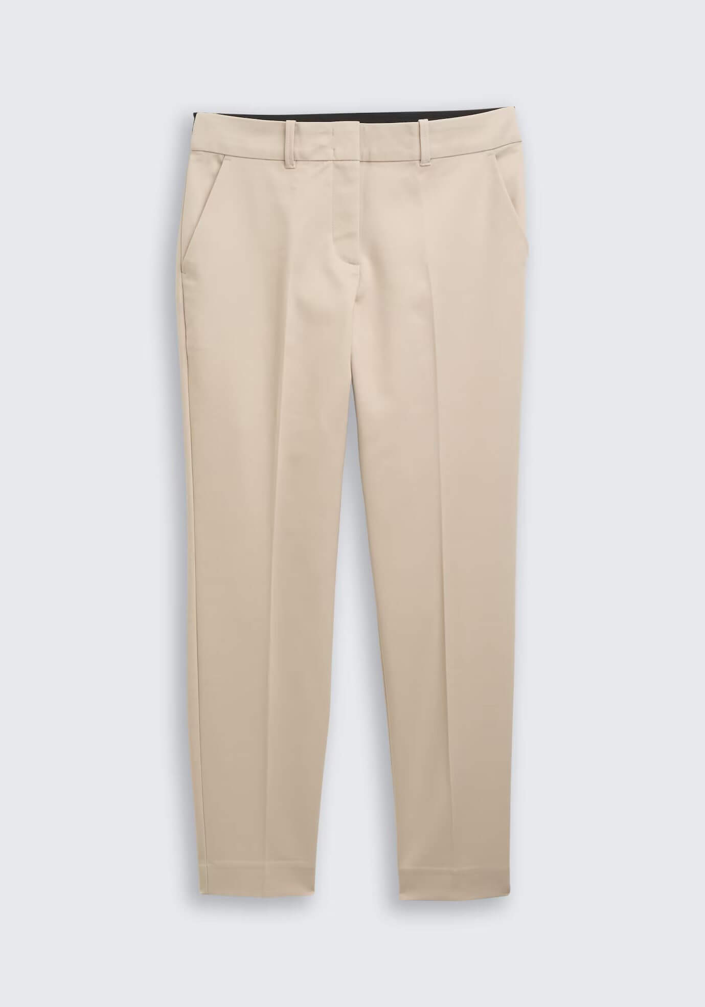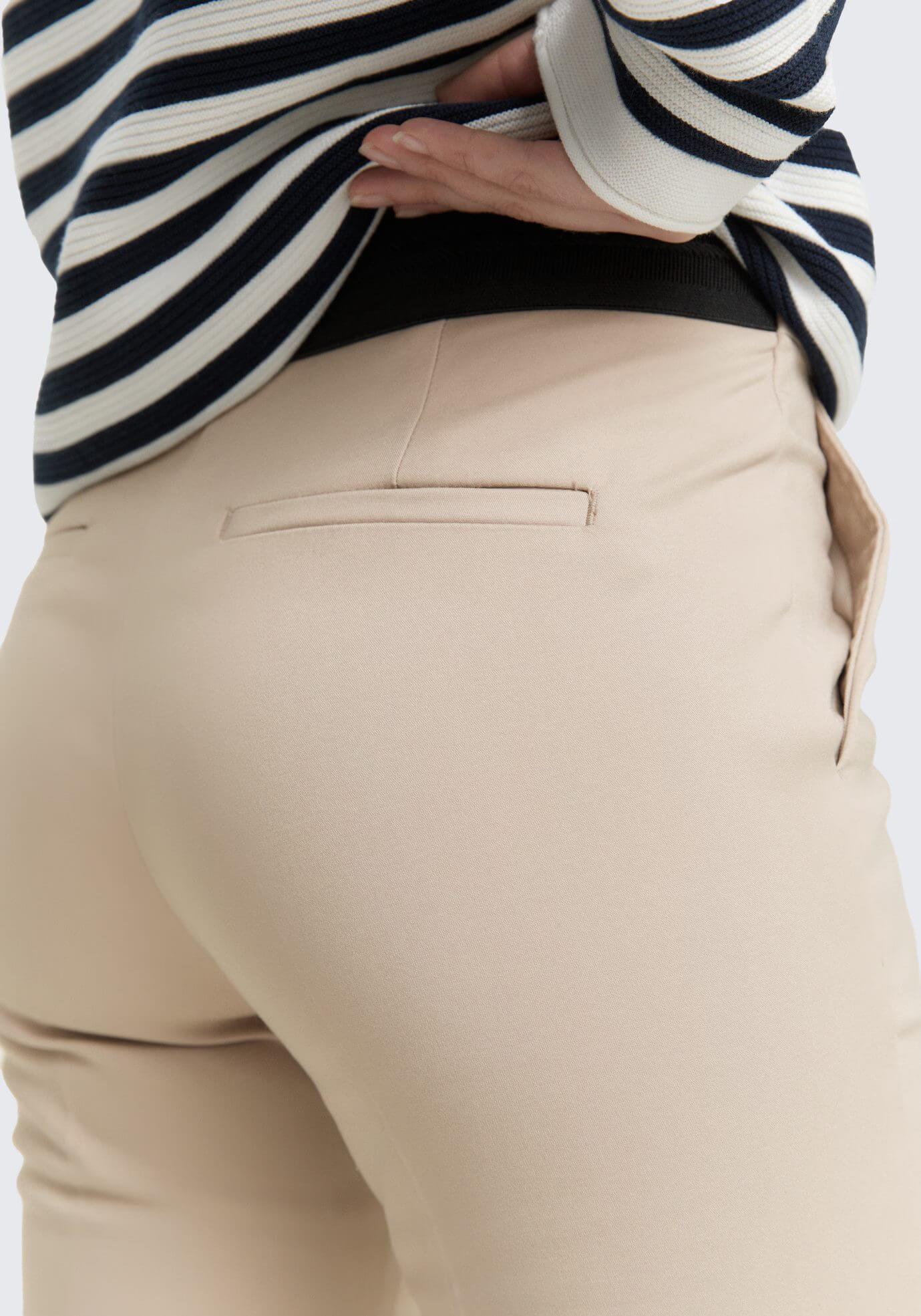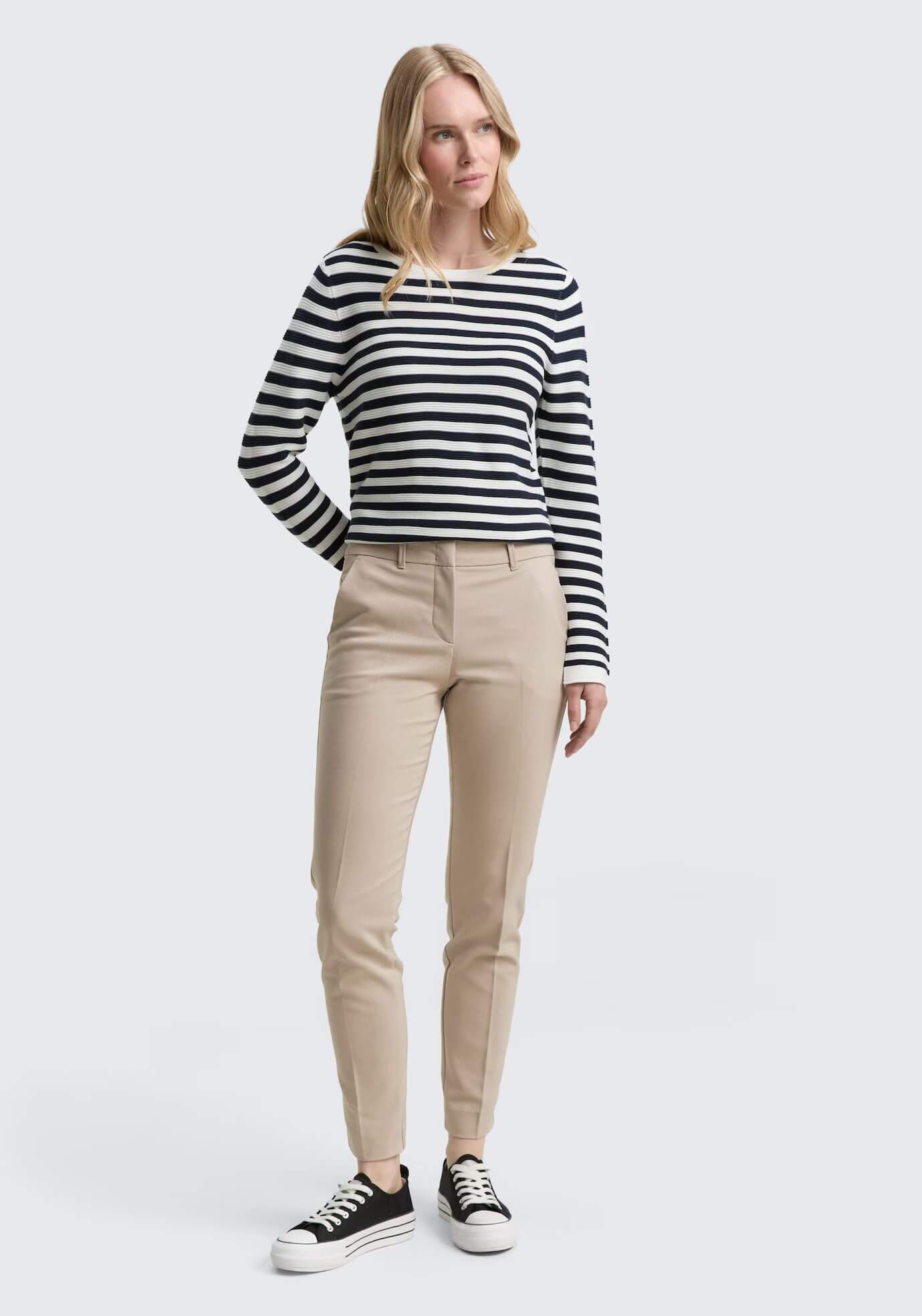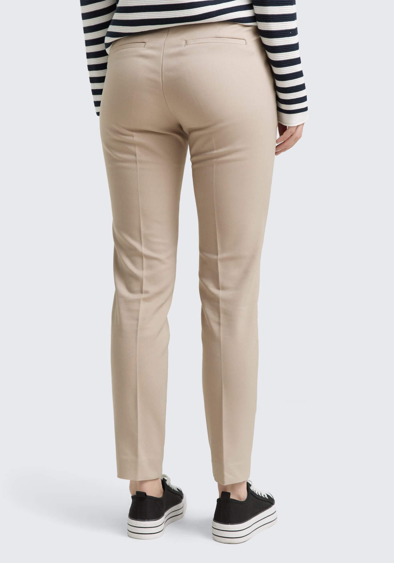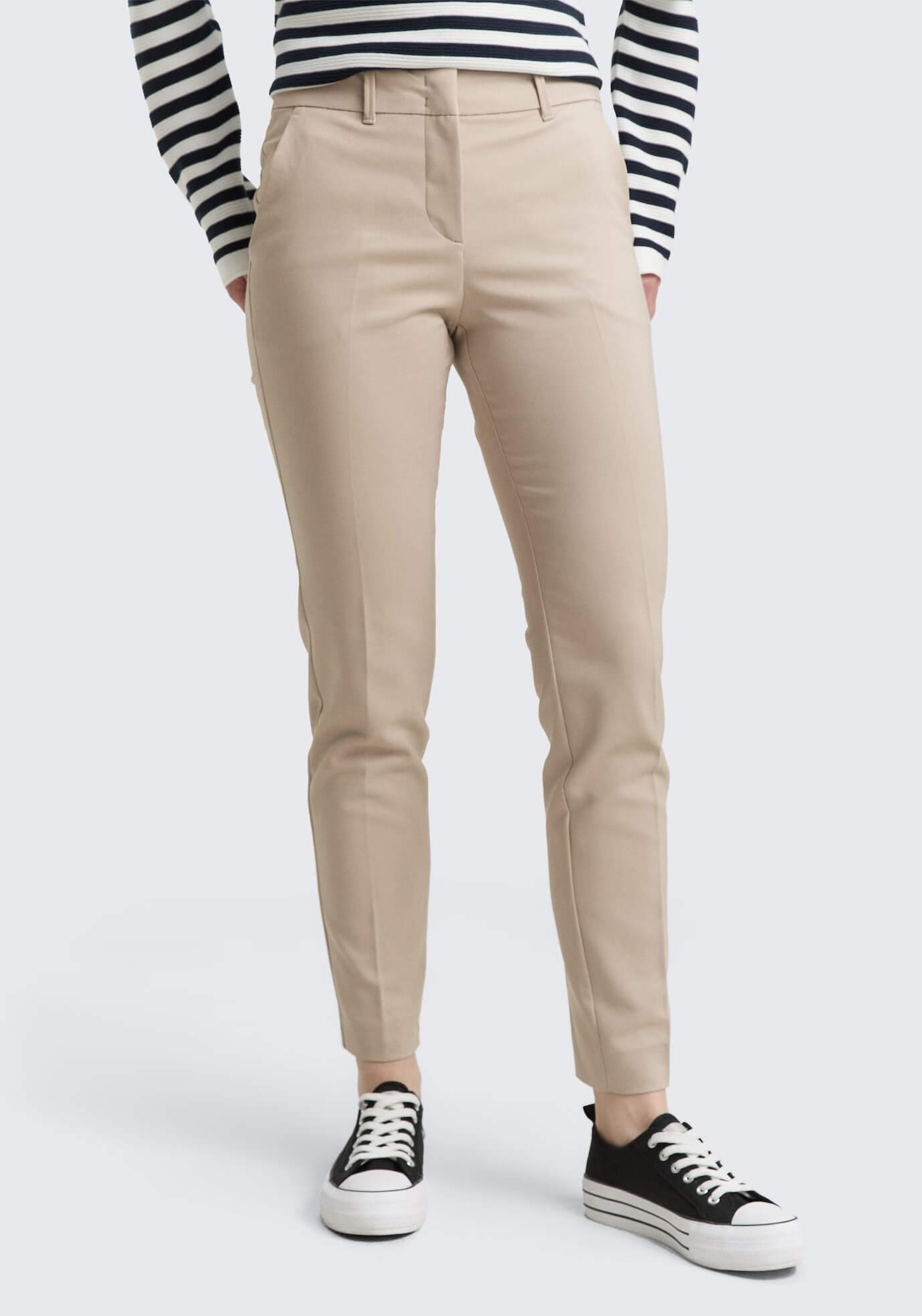 Conhecida por seu estilo urbano e design incomum, a Tom Tailor incorpora detalhes inovadores. Combinados com silhuetas inspiradas em streetwear e uma estética jovial. Assim são estas calças beges c/ perneira estreita da Tom Tailor. Apresenta bolsos metidos na frente e atrás, tem botão no cós. Para parte de cima combina na perfeição com casaco de ganga, mas dentro do mesmo estilo. A modelo está a vestir o tamanho 36.