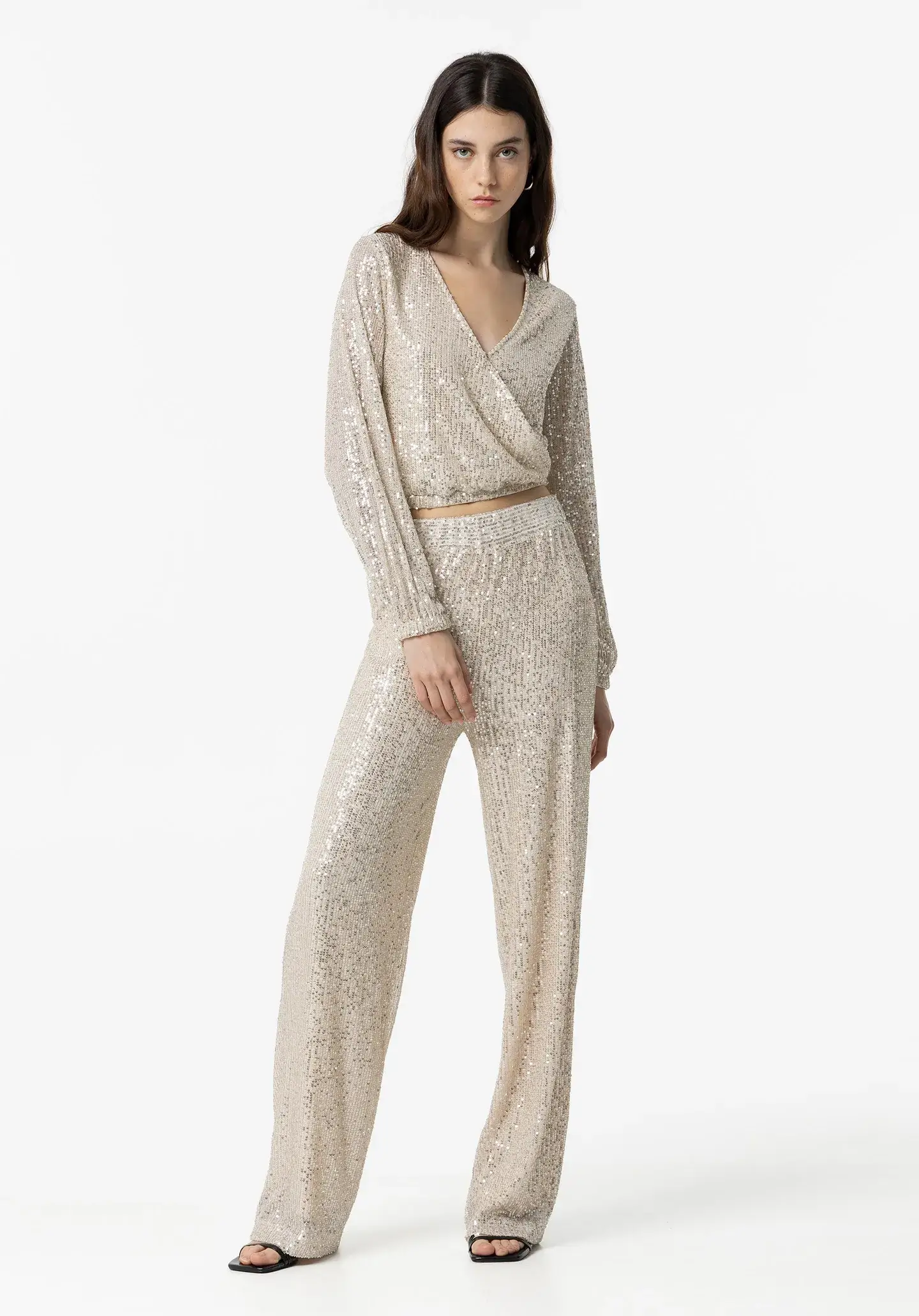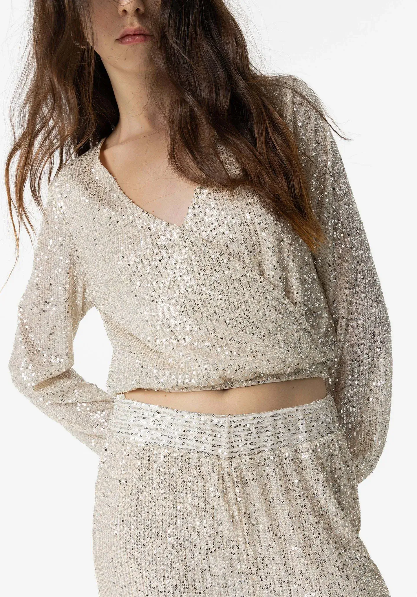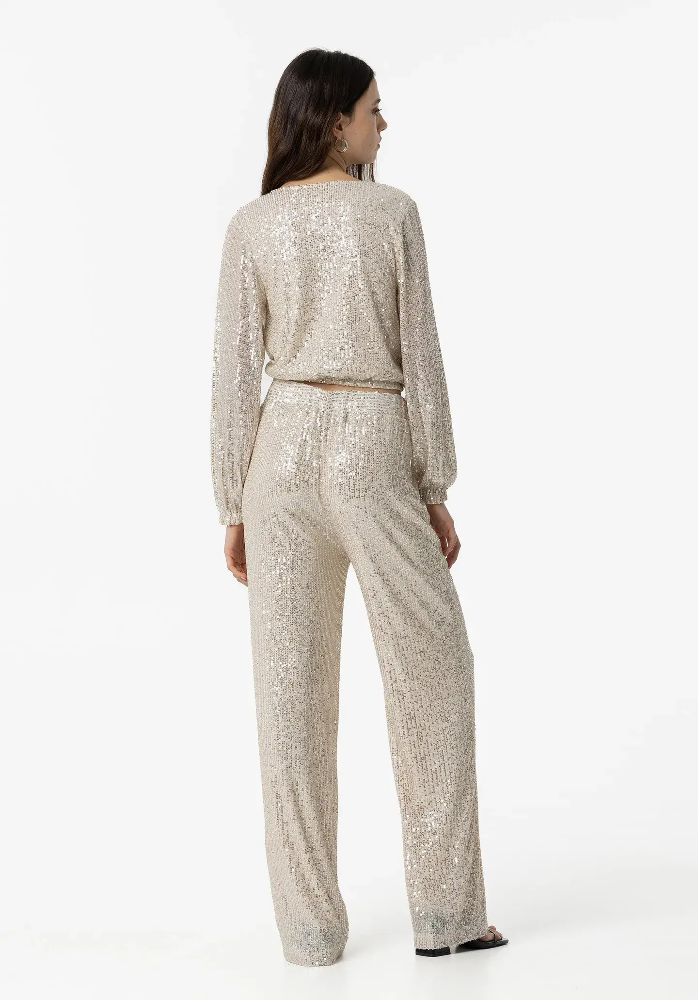Pense em silhuetas dos anos 80, painéis pesados, denim super skinny e estampas de bandana. Pois bem essa era voltou aos dias de hoje. Assim são estas calças douradas da Tiffosi. Apresenta elástico no cós e cintura alta. Para parte de cima combina na perfeição com camisola mas a dar com o tom. A manequim está a vestir o tamanho S.