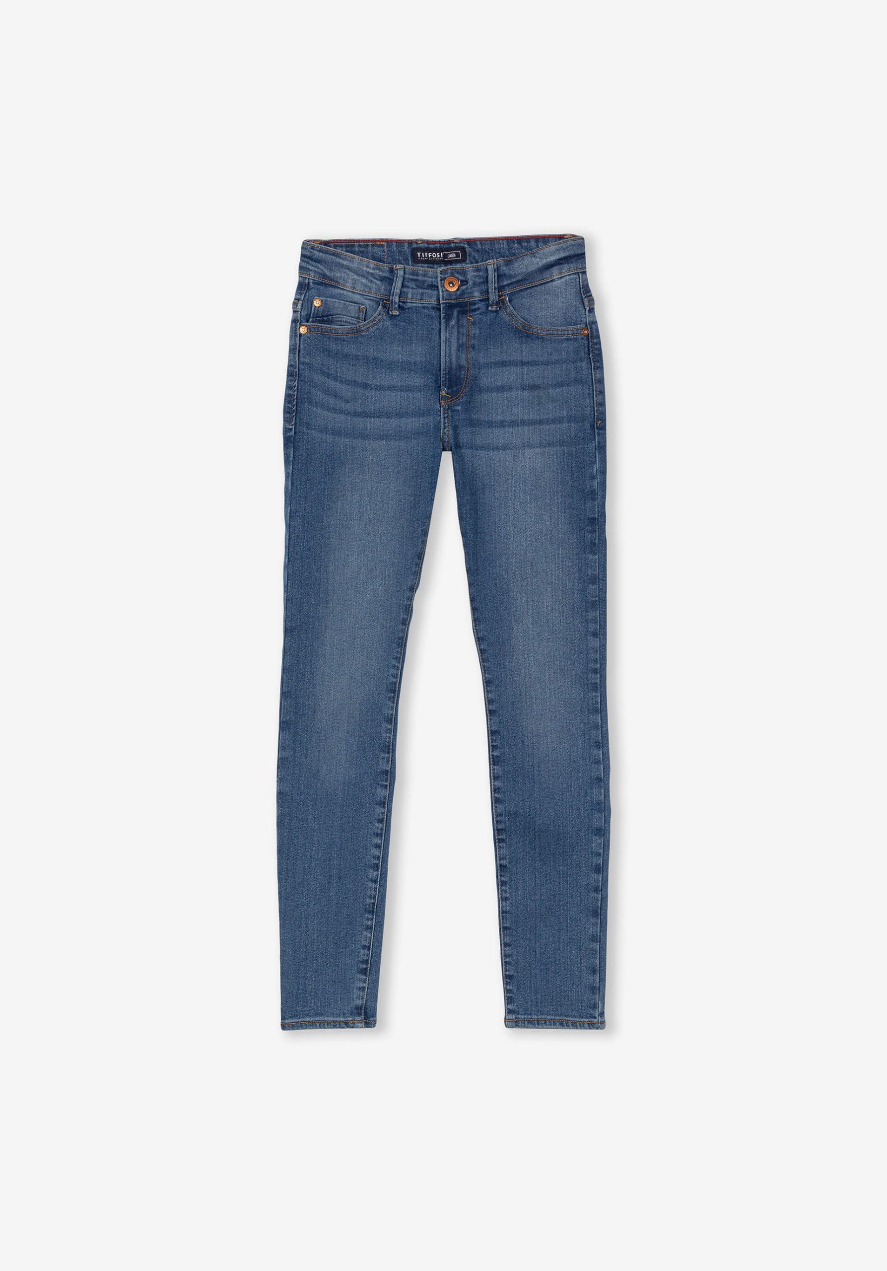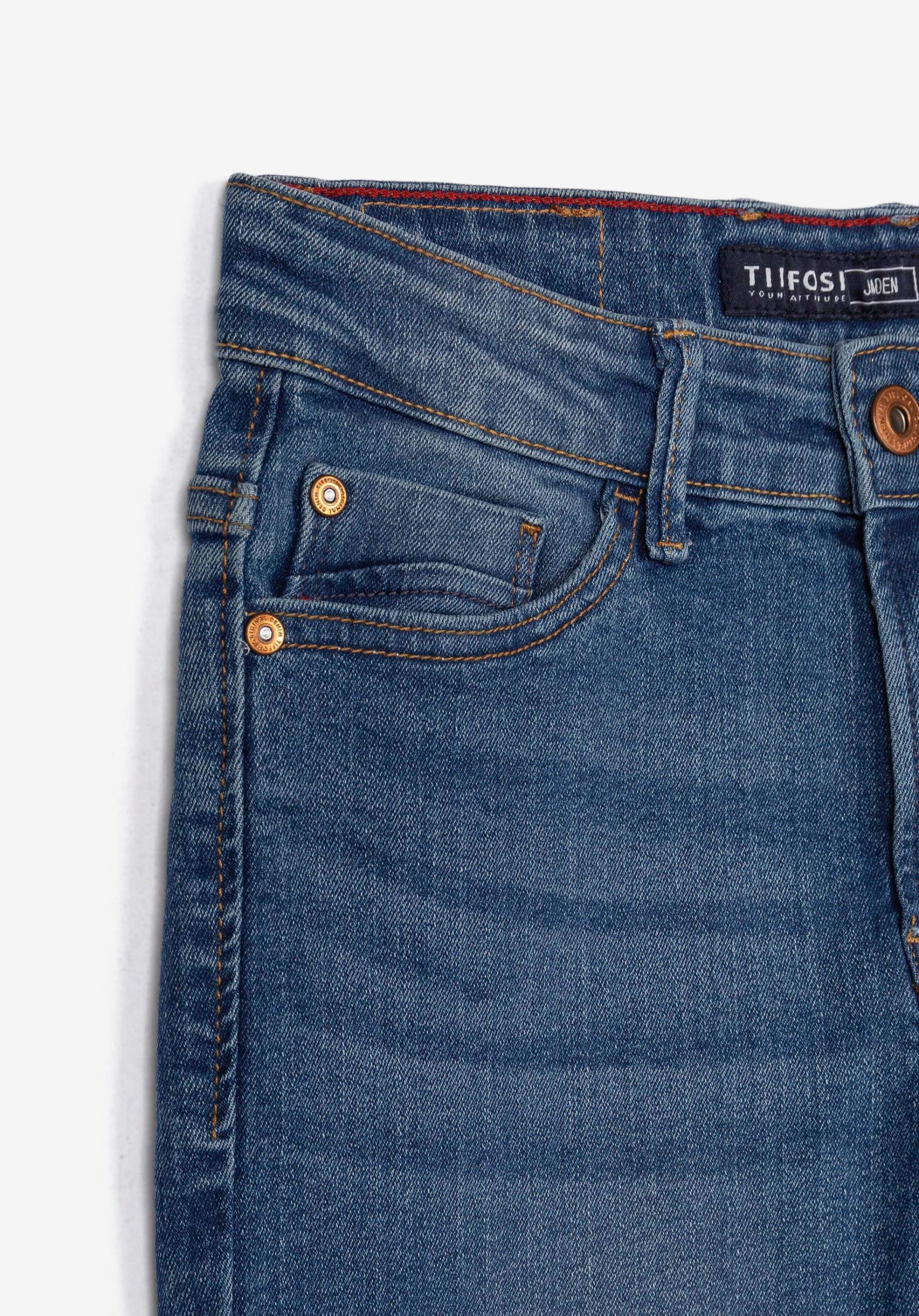 Pense em silhuetas dos anos 80, painéis pesados, denim super skinny e estampas de bandana. Pois bem essa era voltou aos dias de hoje. Assim são estas calças jaden de ganga da Tiffosi. Apresenta corte com 5 bolsos. Para parte de cima combina na perfeição com t-shirt mas a dar com o tom. O modelo está no tamanho 140 9/10.