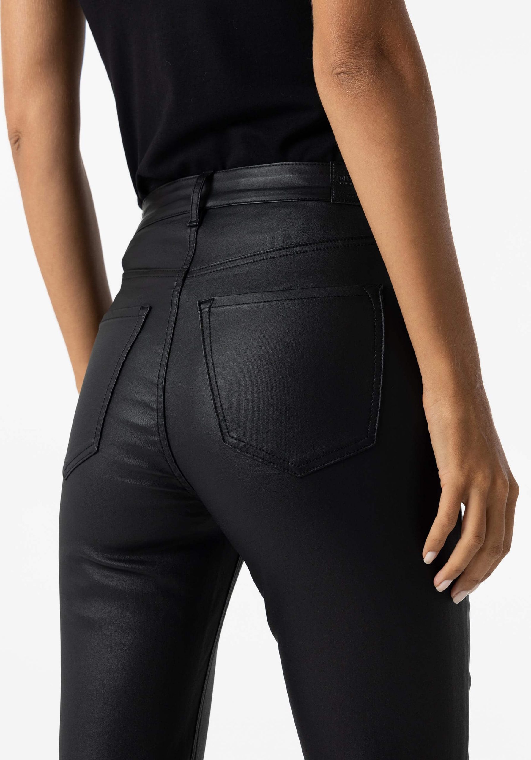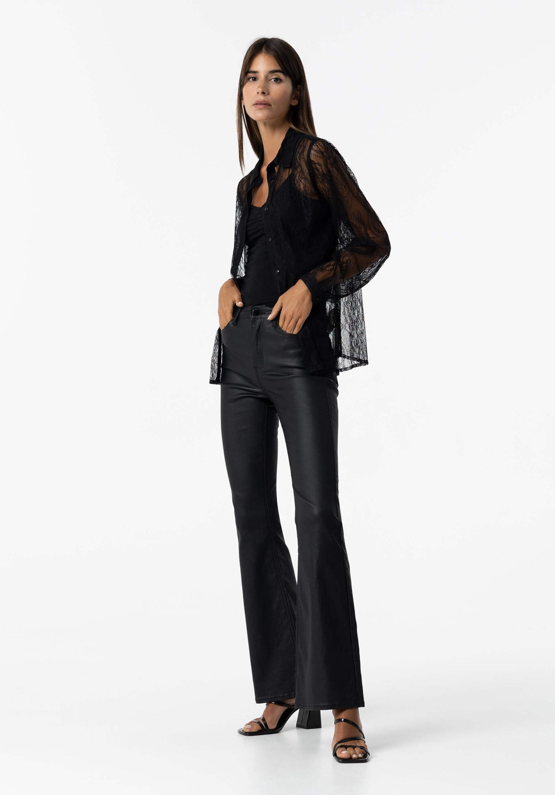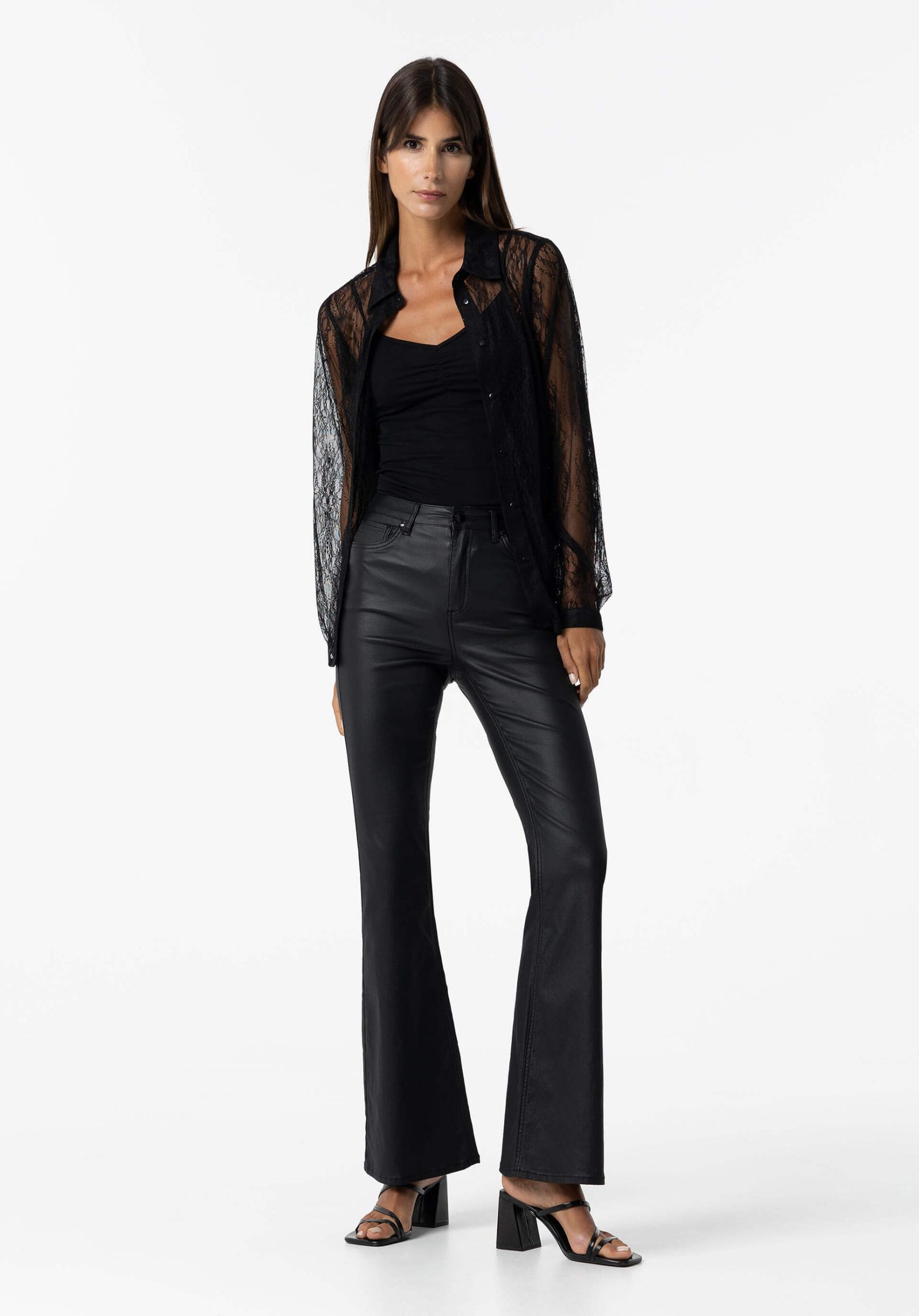 Pense em silhuetas dos anos 80, painéis pesados, denim super skinny e estampas de bandana. Pois bem essa era voltou aos dias de hoje. Conhecida por seu estilo urbano e design incomum, a Tiffosi incorpora detalhes nativos portugueses. Assim são estas calças pretas de napa à boca de sino da Tiffosi. Com cinco bolsos, fecho e presilhas. Pode combinar com malhas ou camisas para parte de cima. A modelo está a vestir o tamanho 34.
