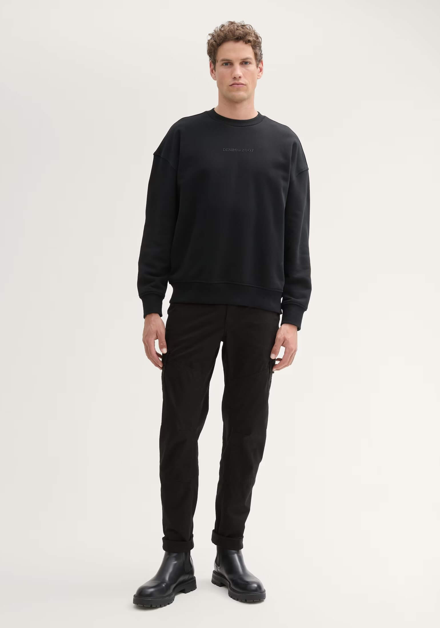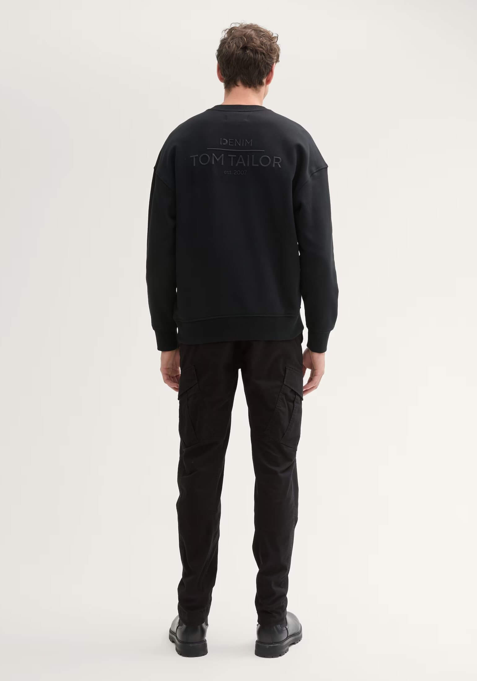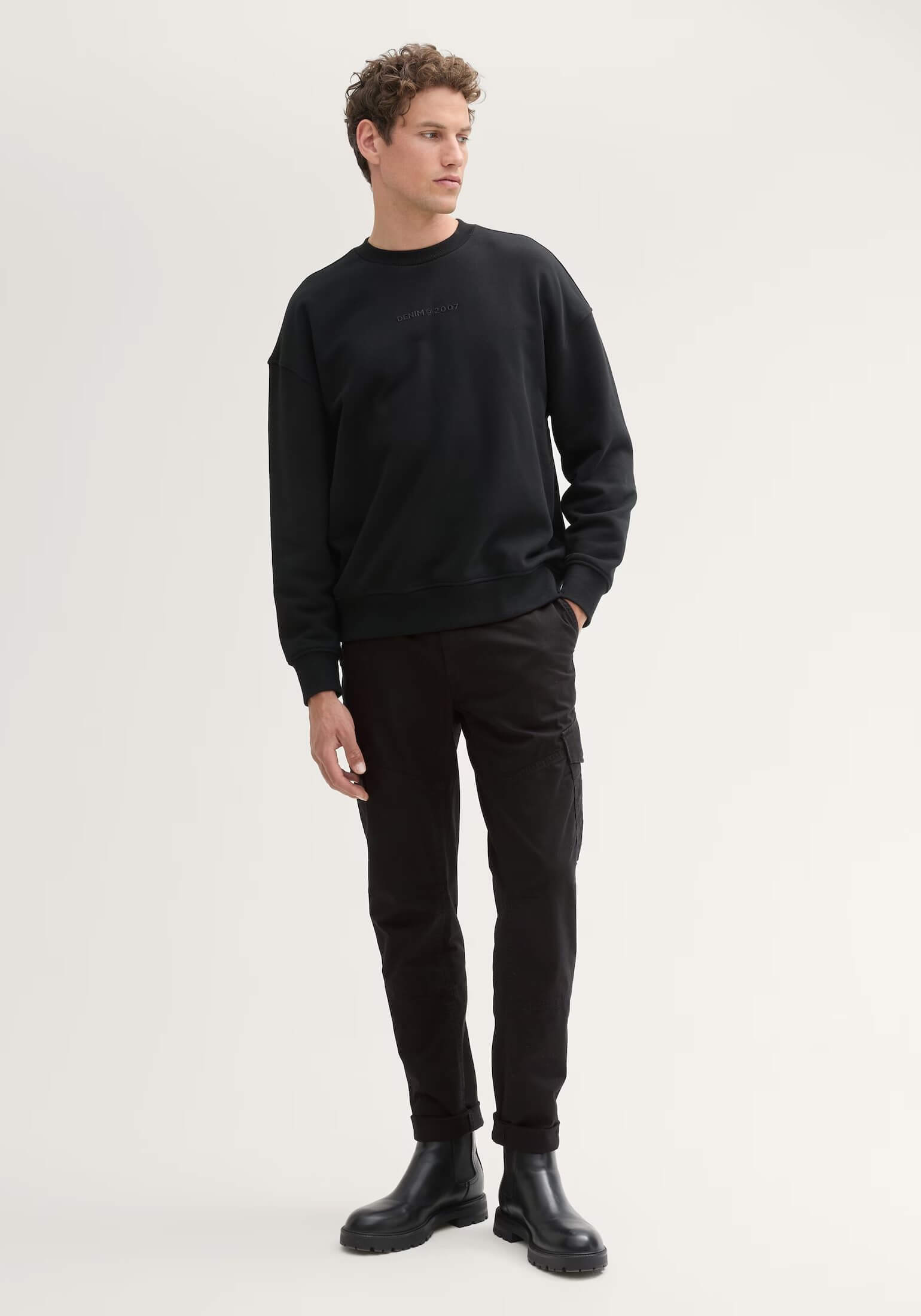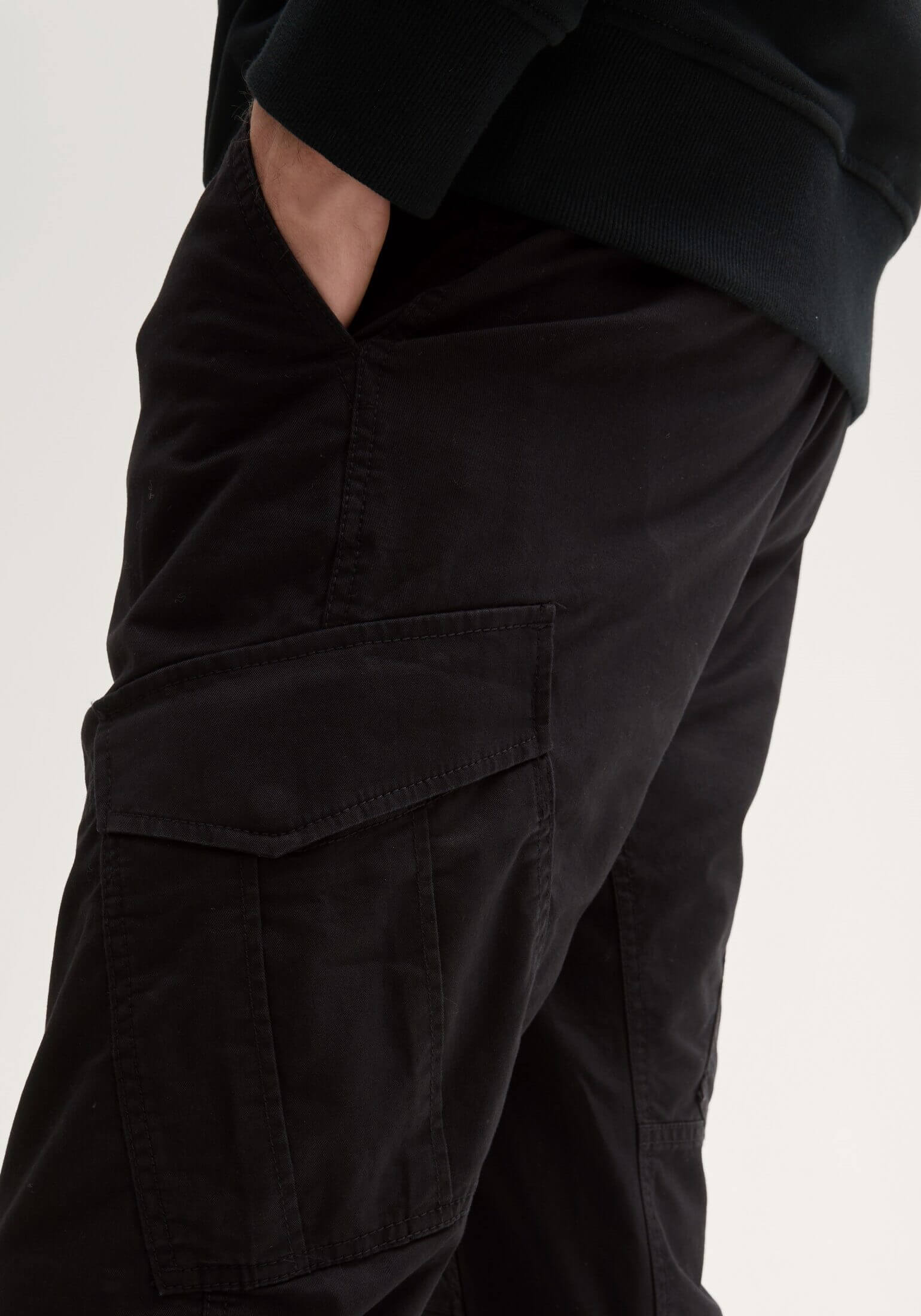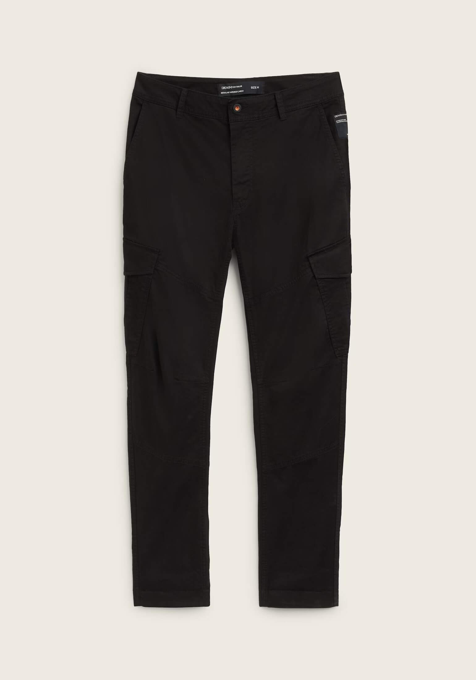 Conhecida por seu estilo urbano e design incomum, a Tom Tailor incorpora detalhes inovadores. Combinados com silhuetas inspiradas em streetwear e uma estética jovial. Assim são estas calças pretas regular tapered cargo da Tom Tailor. Apresenta corte com 6 bolsos e fecho metálico na carcela. Para parte de cima combina na perfeição com camisola, mas dentro do mesmo estilo. O modelo está a vestir o tamanho 38.