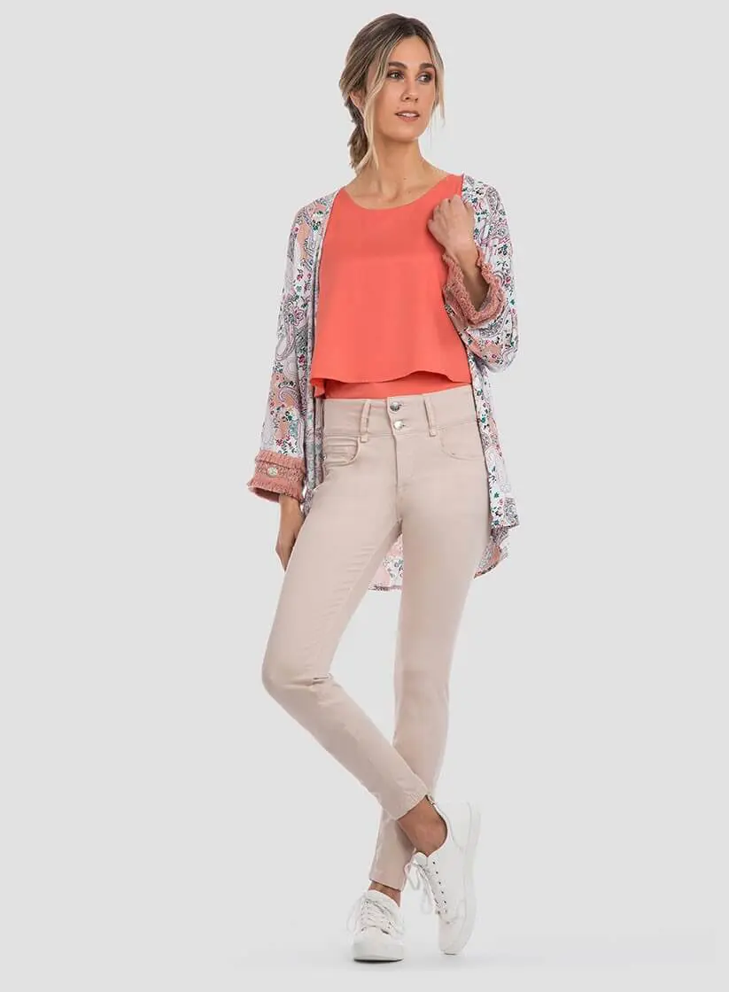 Pense em silhuetas dos anos 80, painéis pesados, denim super skinny e estampas de bandana. Pois bem essa era voltou aos dias de hoje. Conhecida por seu estilo urbano e design incomum, a Tiffosi incorpora detalhes nativos portugueses. Assim são estas calças sarja double up nude da Tiffosi. Apresentam presilhas para cinto, um botão e fecho de correr frontal, um design de cinco bolsos. Com um corte slim e cintura alta em sarja verde e um emblema da marca na parte das costas. Para parte de cima combina na perfeição com camisa ou camisola mas a dar com o tom. A manequim está a vestir o tamanho 36.