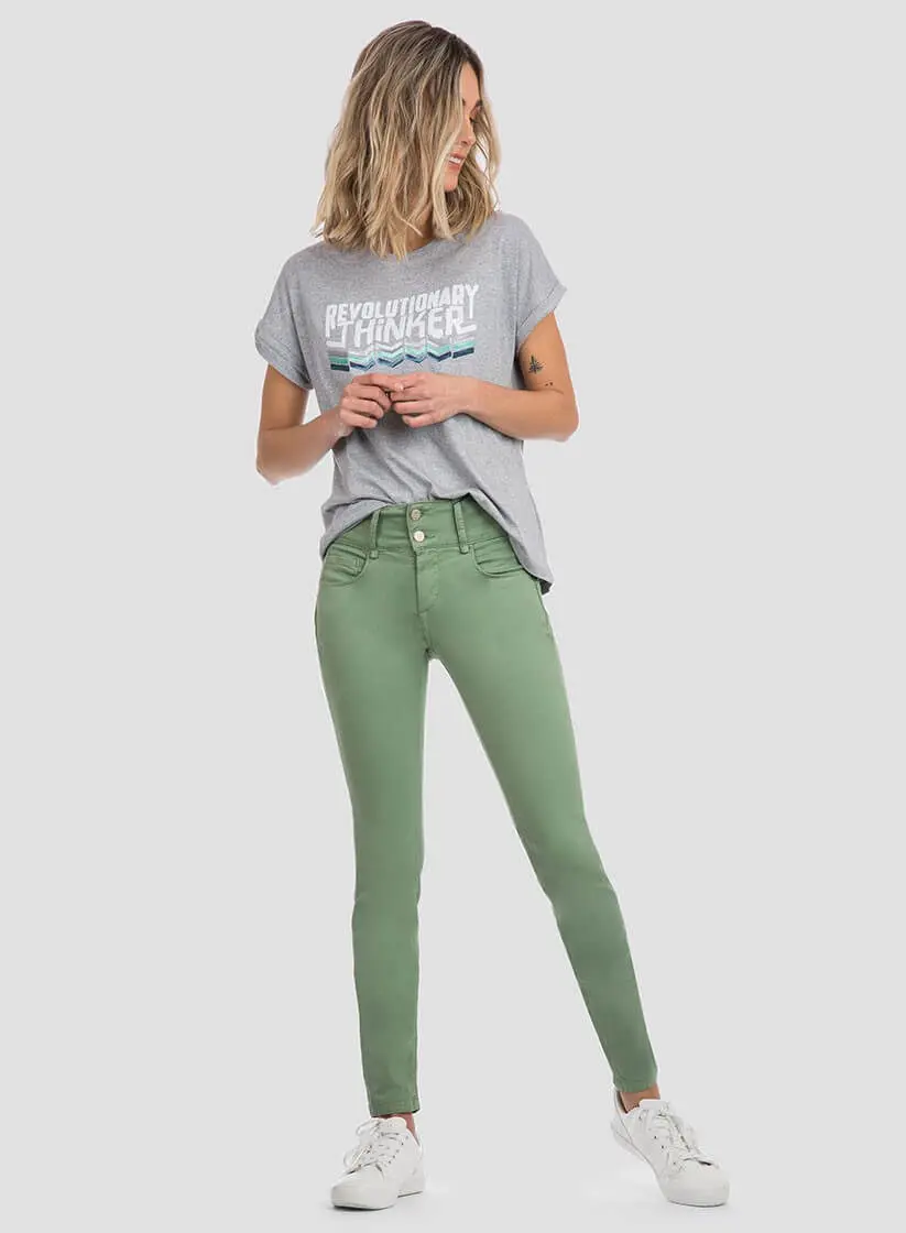 Pense em silhuetas dos anos 80, painéis pesados, denim super skinny e estampas de bandana. Pois bem essa era voltou aos dias de hoje. Conhecida por seu estilo urbano e design incomum, a Tiffosi incorpora detalhes nativos portugueses. Assim são estas calças sarja double up verdes da Tiffosi. Apresentam presilhas para cinto, um botão e fecho de correr frontal, um design de cinco bolsos. Com um corte slim e cintura alta em sarja verde e um emblema da marca na parte das costas. Para parte de cima combina na perfeição com camisa ou camisola mas a dar com o tom. A manequim está a vestir o tamanho 36.