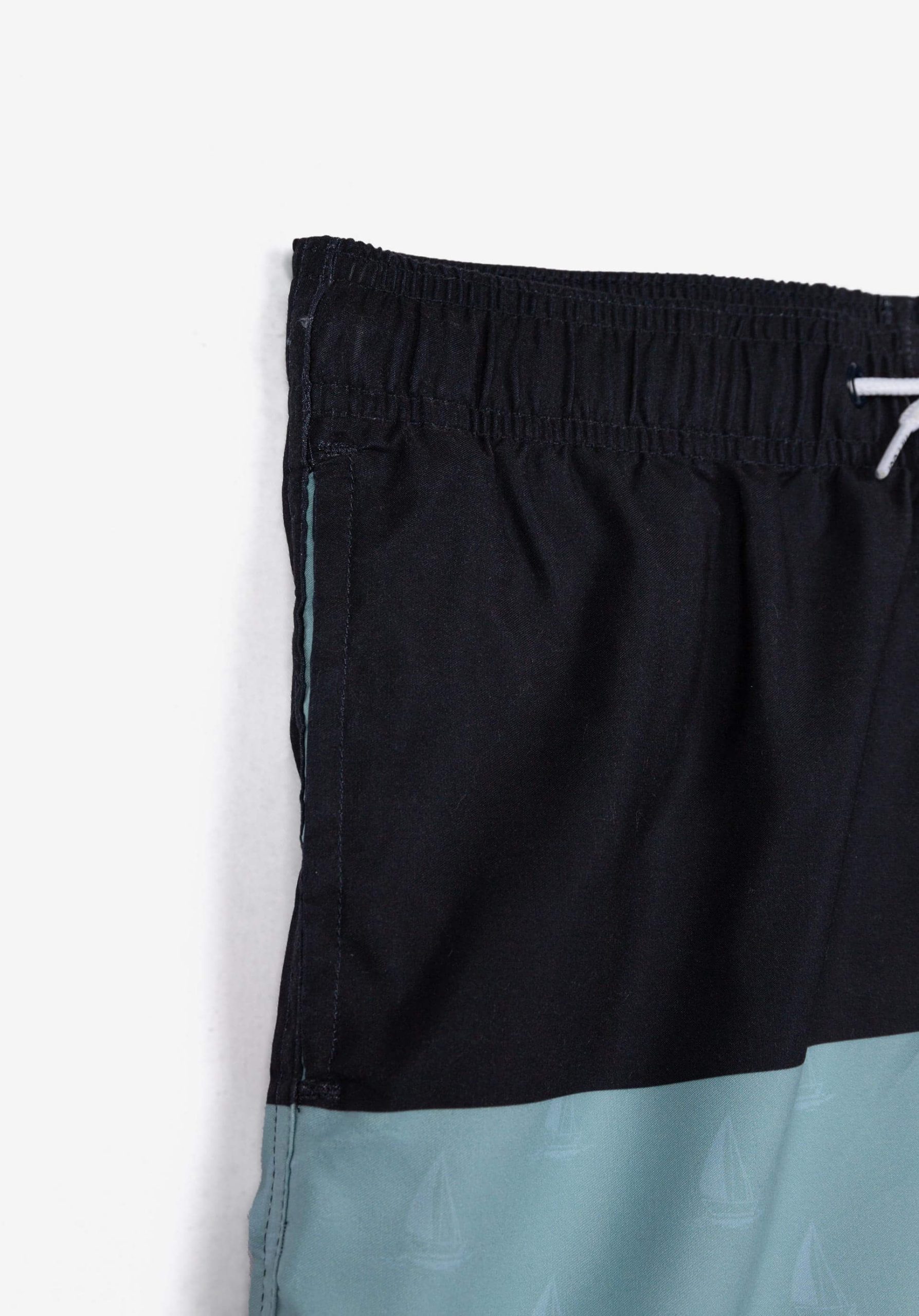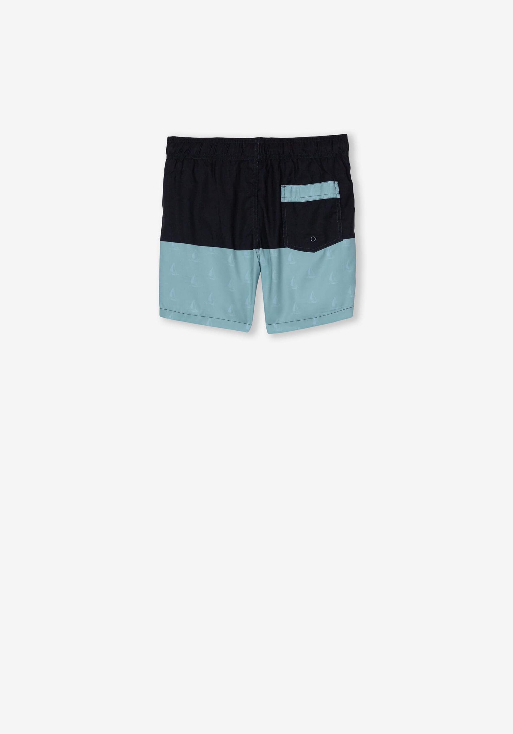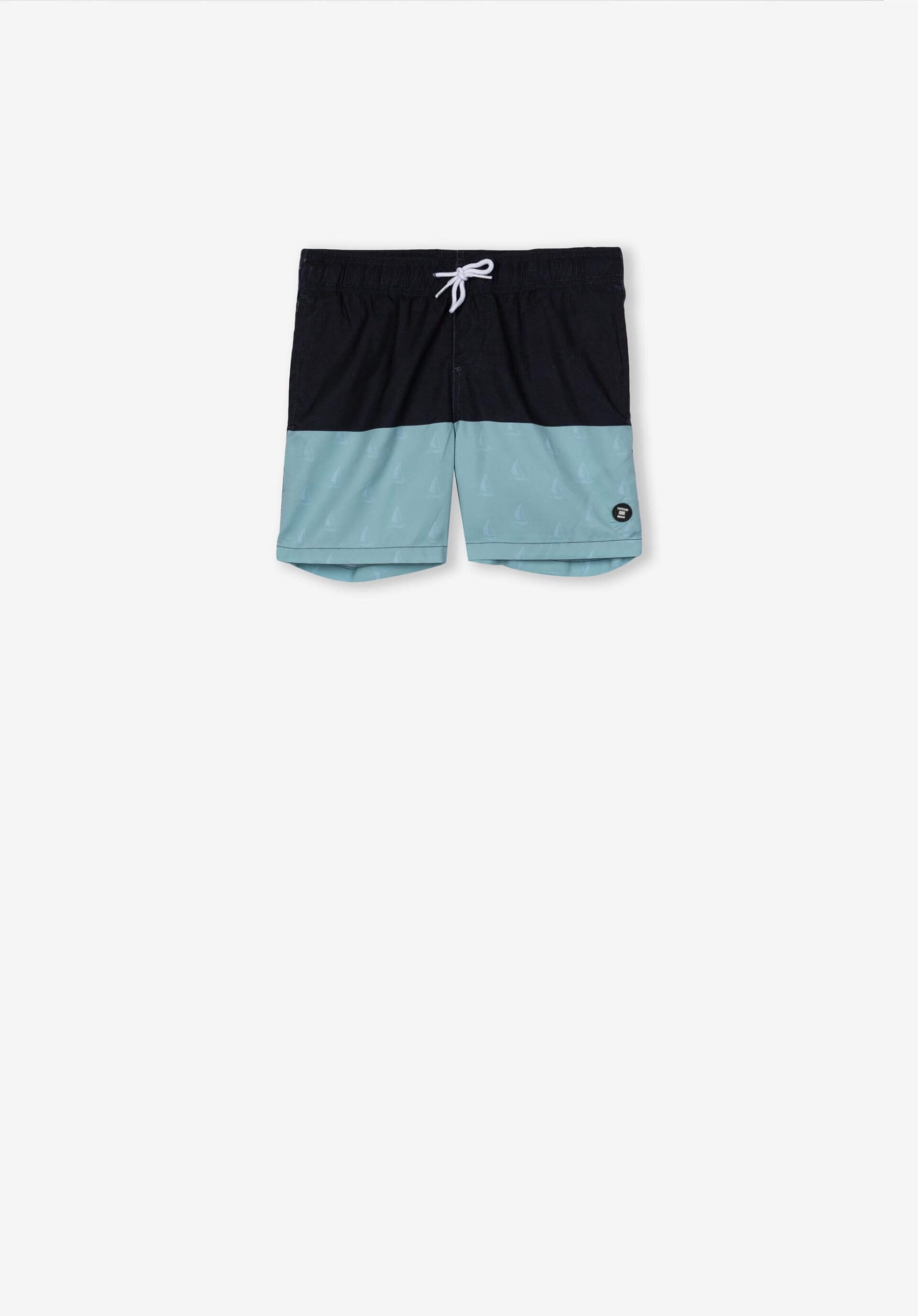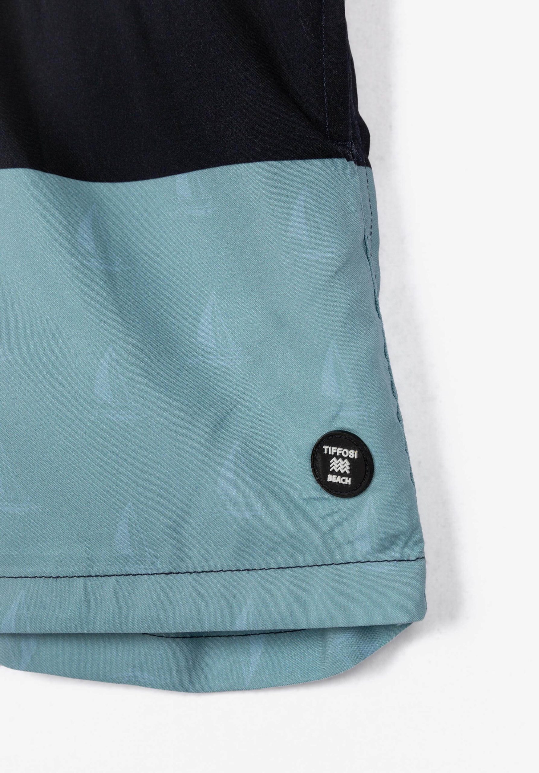 Pense em silhuetas dos anos 80, painéis pesados, denim super skinny e estampas de bandana. Pois bem essa era voltou aos dias de hoje. Assim são estes calções de banho 2 tons de azul da Tiffosi. Apresenta bolsos metidos e elástico no cós. Para parte de cima combina na perfeição com t-shirt mas a dar com o tom. O modelo está no tamanho 140 9/10.