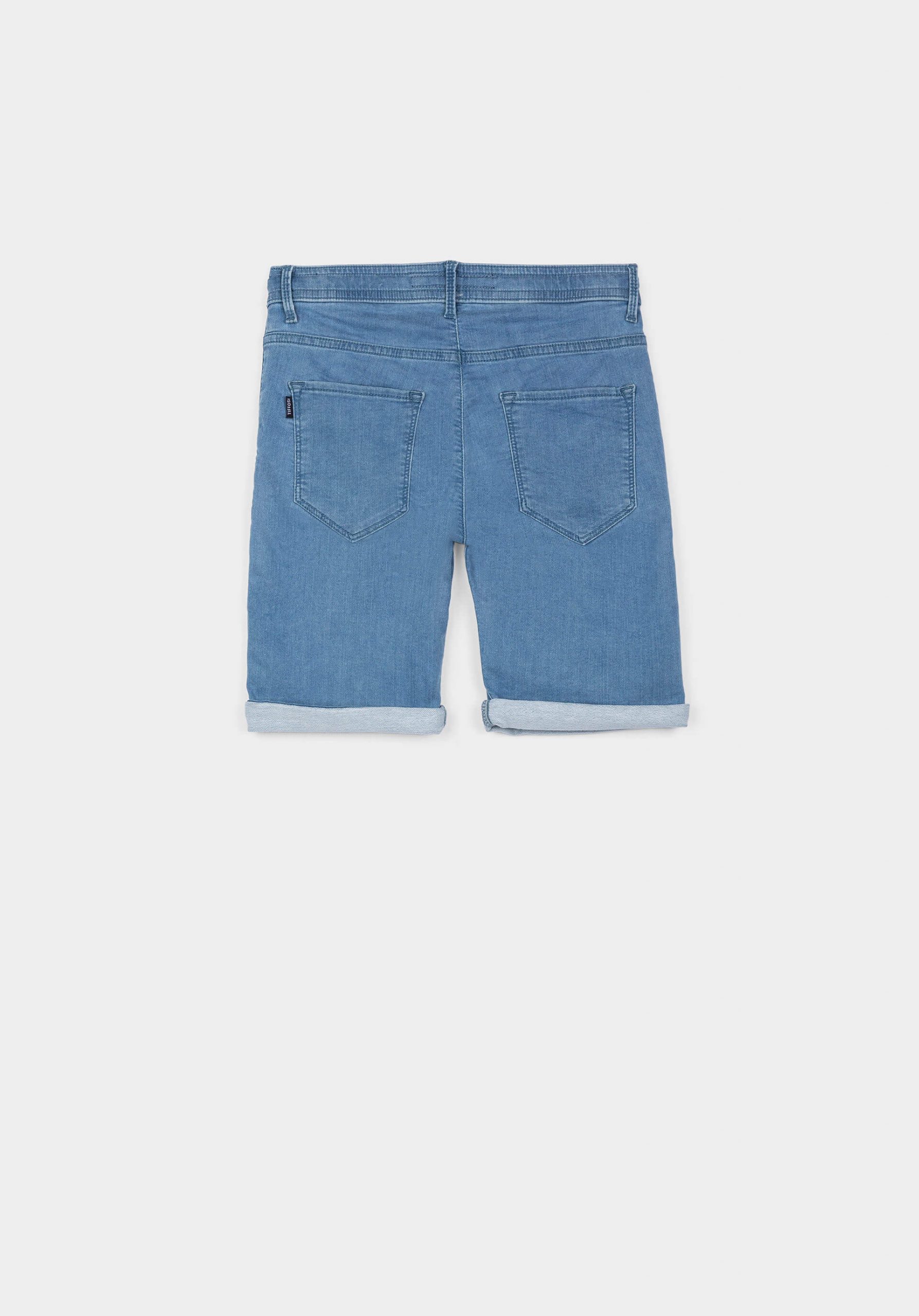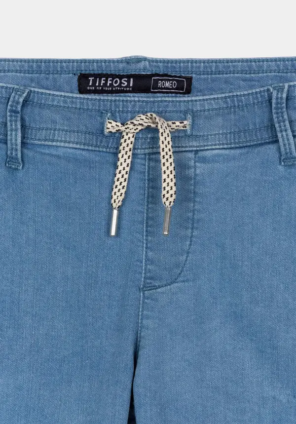Pense em silhuetas dos anos 80, painéis pesados, denim super skinny e estampas de bandana. Pois bem essa era voltou aos dias de hoje. Conhecida por seu estilo urbano e design incomum, a Tiffosi incorpora detalhes nativos portugueses. Assim são estes calções de ganga clara cintura média com bolsos na frente e na parte de trás. Com cós elástico e cordão ajustável. Para parte de cima combina na perfeição com t-shirt mas a dar com o tom. A imagem está no tamanho 9-10 anos /140 cm.