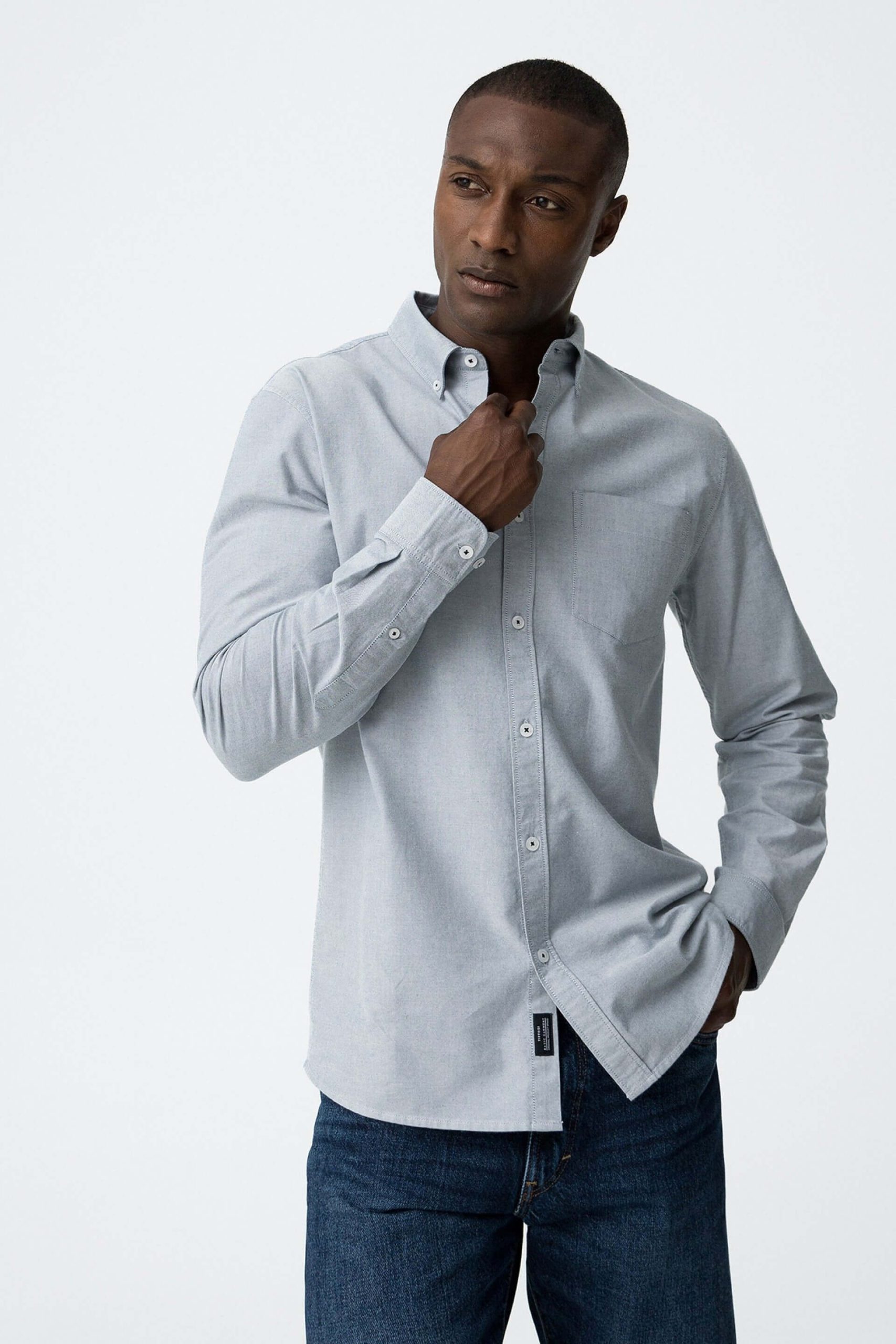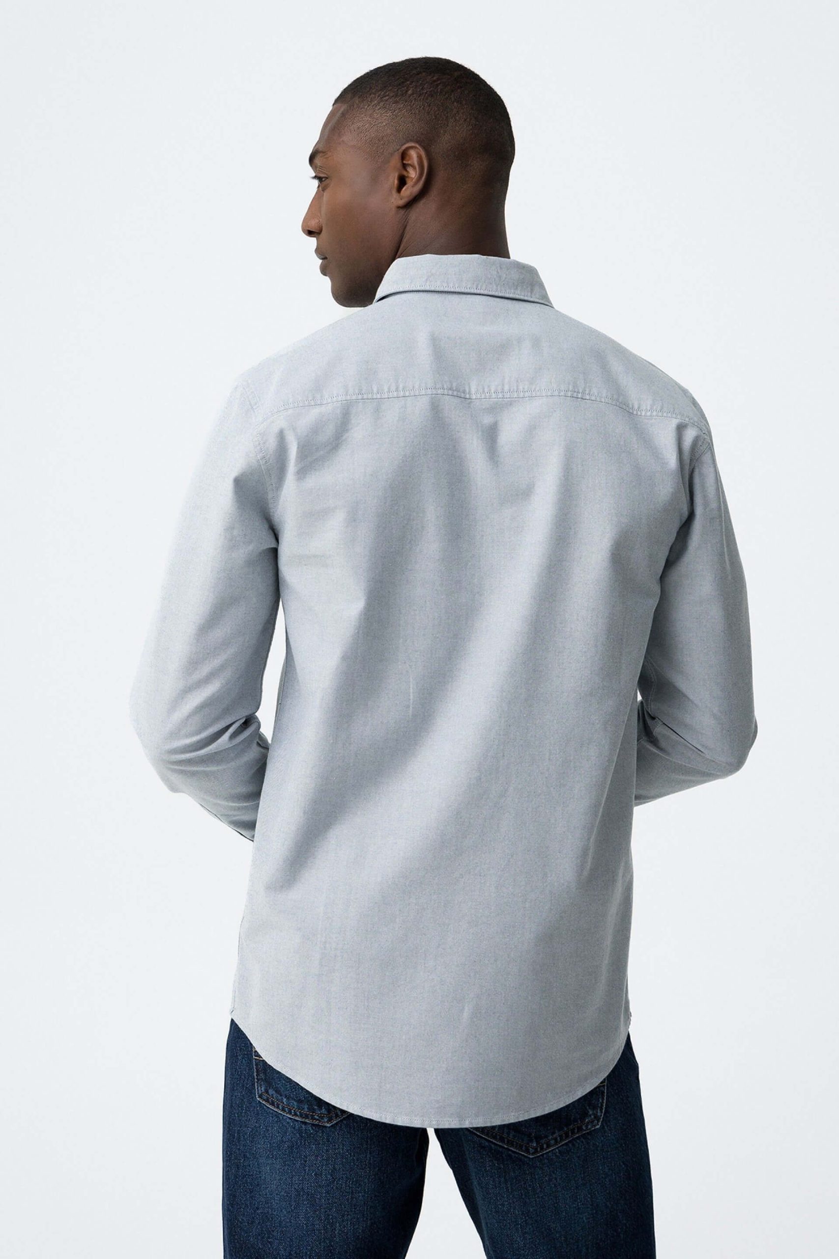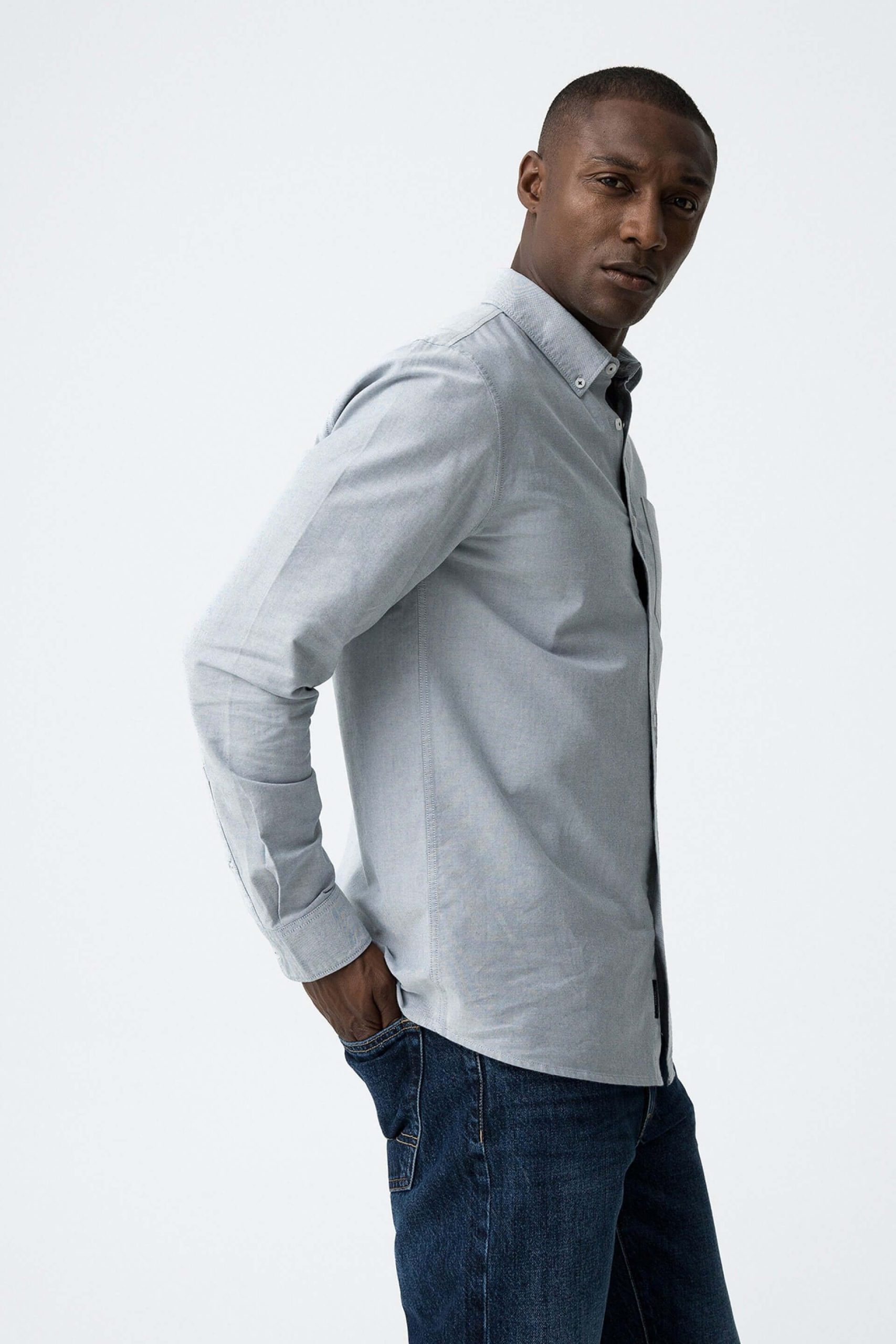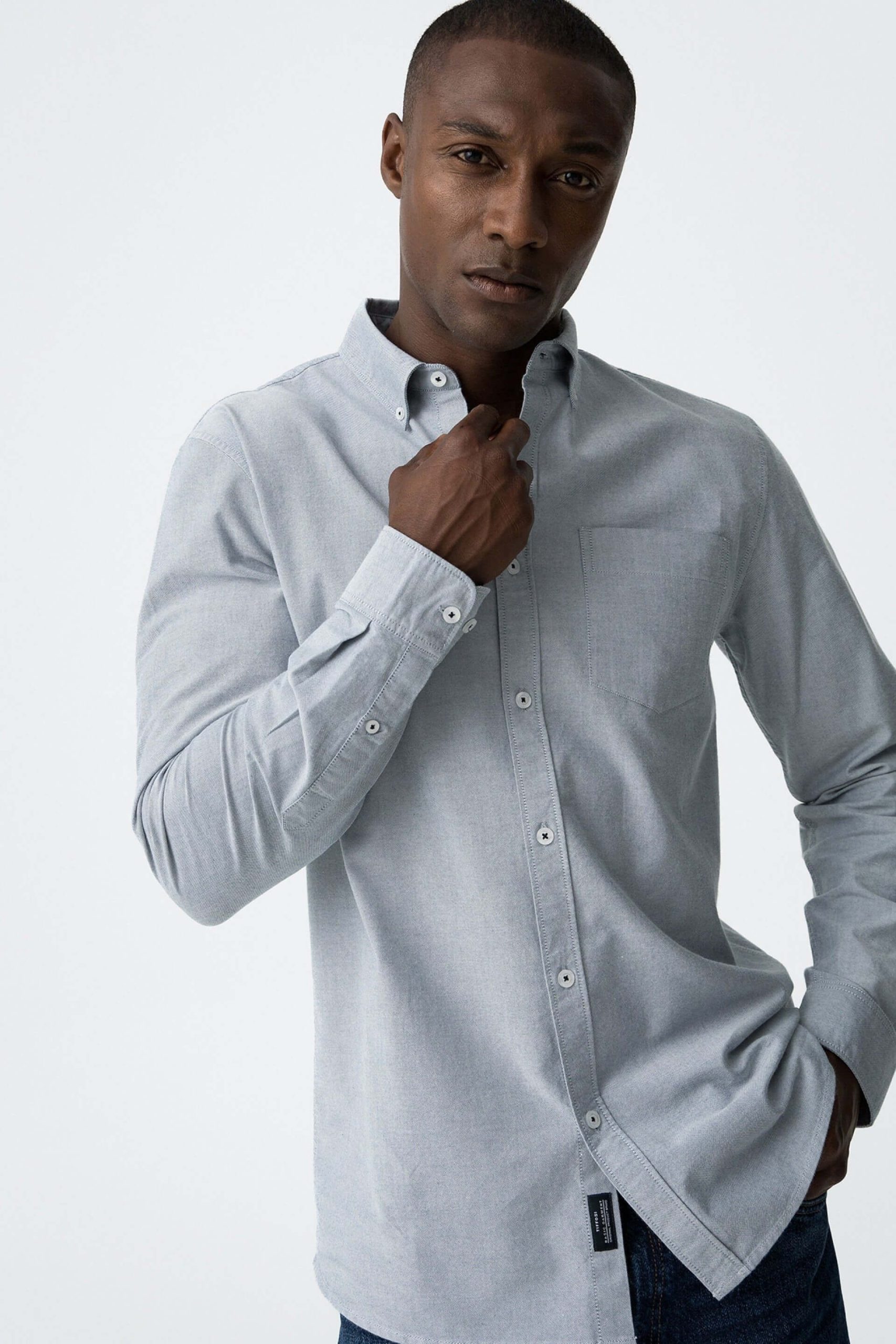 A Tiffosi foi lançada em 1981 e oferece produtos de qualidade a preços acessíveis, que contam histórias e inspiram um estilo de vida. Incorpora detalhes inovadores, combinados com silhuetas inspiradas em streetwear e uma estética jovial. Elaborada a partir de algodão azul, esta camisa básica cinza, apresenta um colarinho com botões. Mangas compridas com punhos de botão um bolso frontal esquerdo. Uma bainha curva mas longa e um logótipo bordado na carcela frontal. Combina com calça de sarja para baixo e por cima um casaco ou blusão. O manequim com um estilo eclético mas com bom gosto, está a vestir o tamanho S.