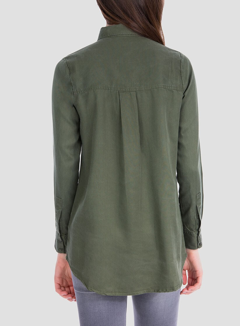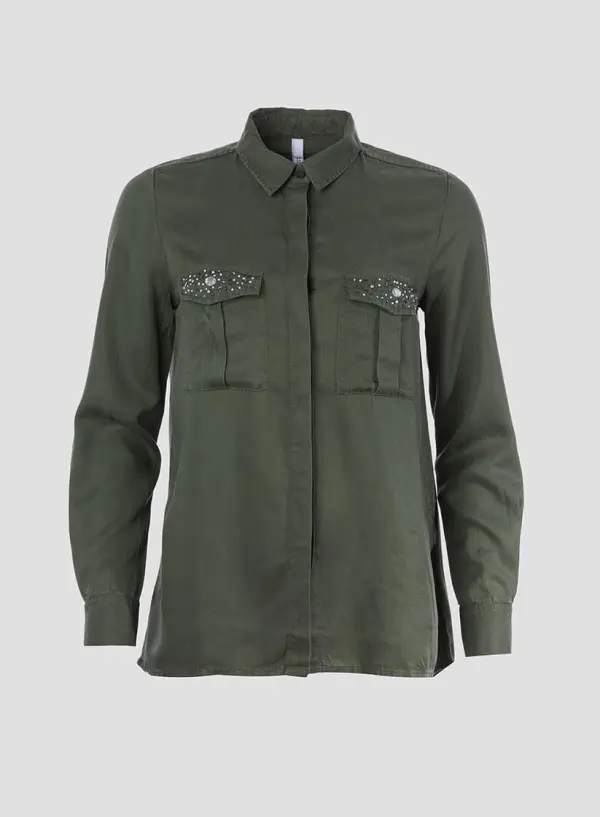 Conhecida por seu estilo urbano e design incomum, a Tiffosi incorpora detalhes inovadores. Combinados com silhuetas inspiradas em streetwear e uma estética jovial. Fundada em 1981, a Tiffosi é conhecida por produzir inicialmente jeans. Mas há muito que alargou o seu leque de oferta. Esta camisa bolsos com aplicações, da Tiffosi é exemplo disso mesmo. Elaborada a partir em tela de liocel verde kaki, com gola em bico. Manga comprida com botão no punho, dois bolsos de chapa no peito com paleta e missangas. Mais comprido na parte de trás, mas não muito e com botões encobertos na frente. Pode por um casaco por cima e para baixo combina bem com jeans. A modelo está a vestir o tamanho XS.