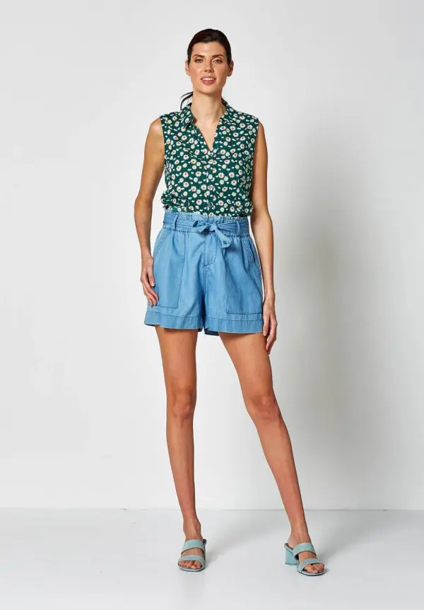 Pense em silhuetas dos anos 80, painéis pesados, denim super skinny e estampas de bandana. Pois bem essa era voltou aos dias de hoje. Assim é esta camisa manga cava da Mdm. Apresenta gola de bico e botões na frente. Para parte de cima combina na perfeição com casaco mas a dar com o tom. A manequim está a vestir o tamanho 36.