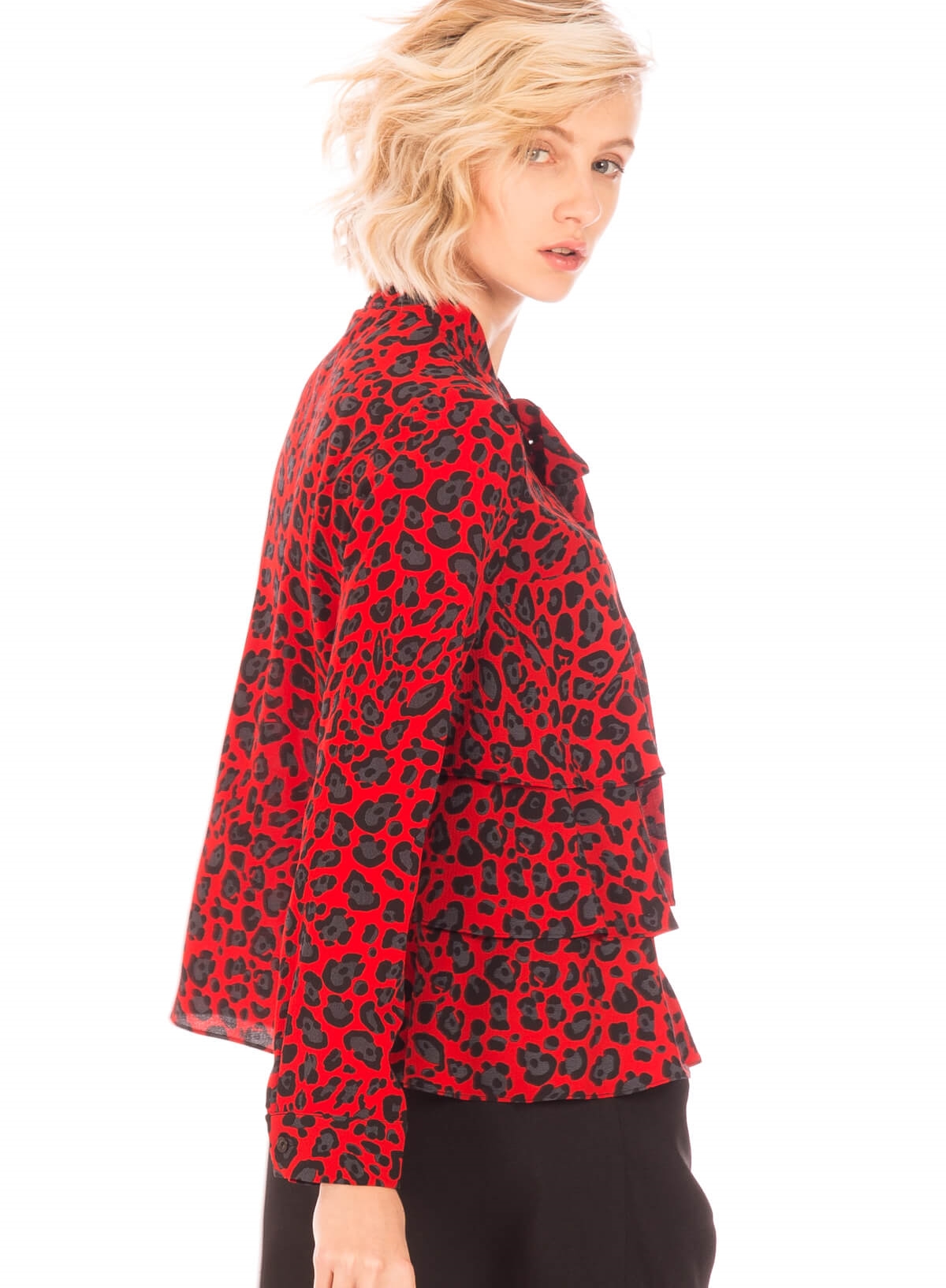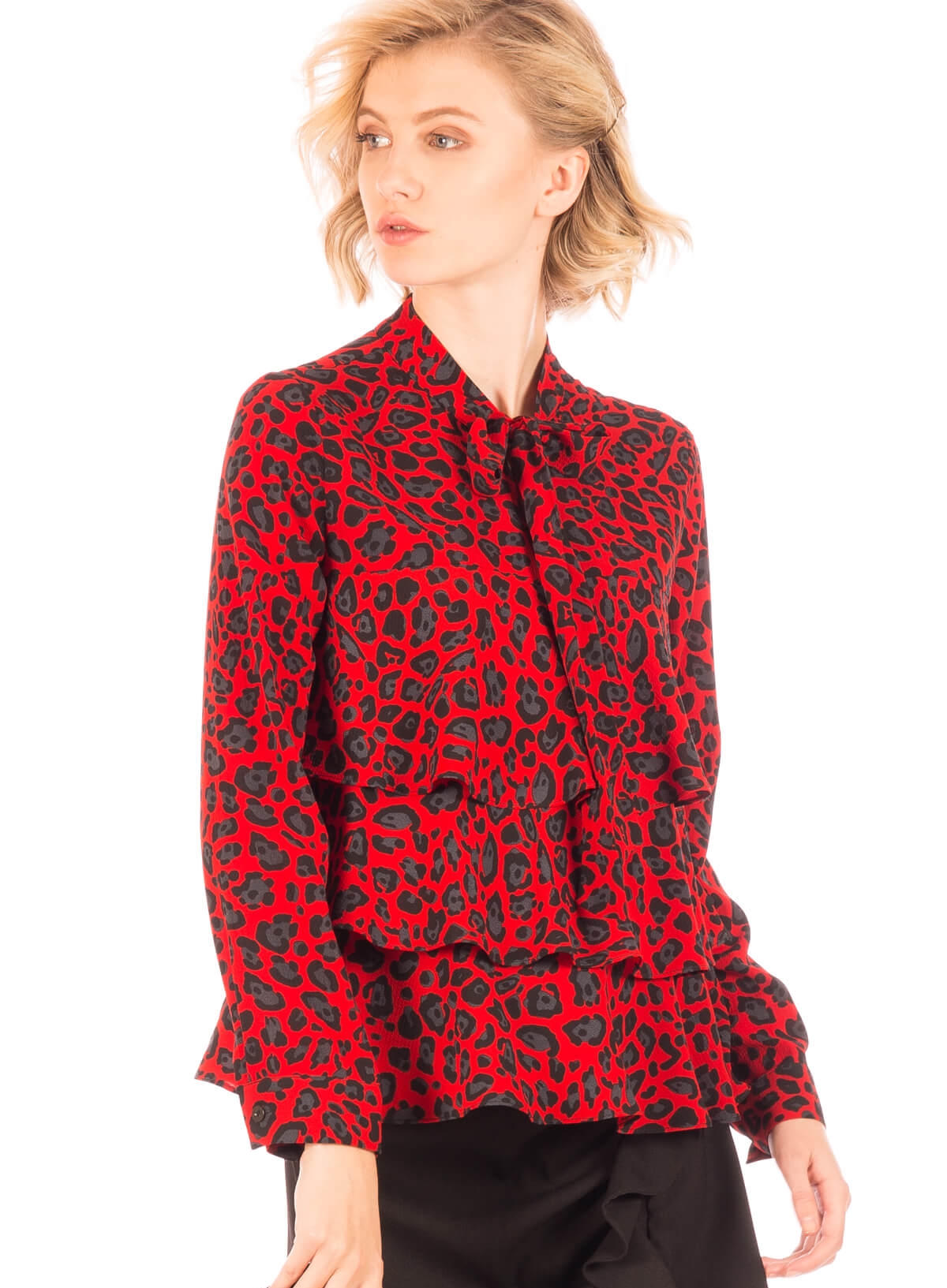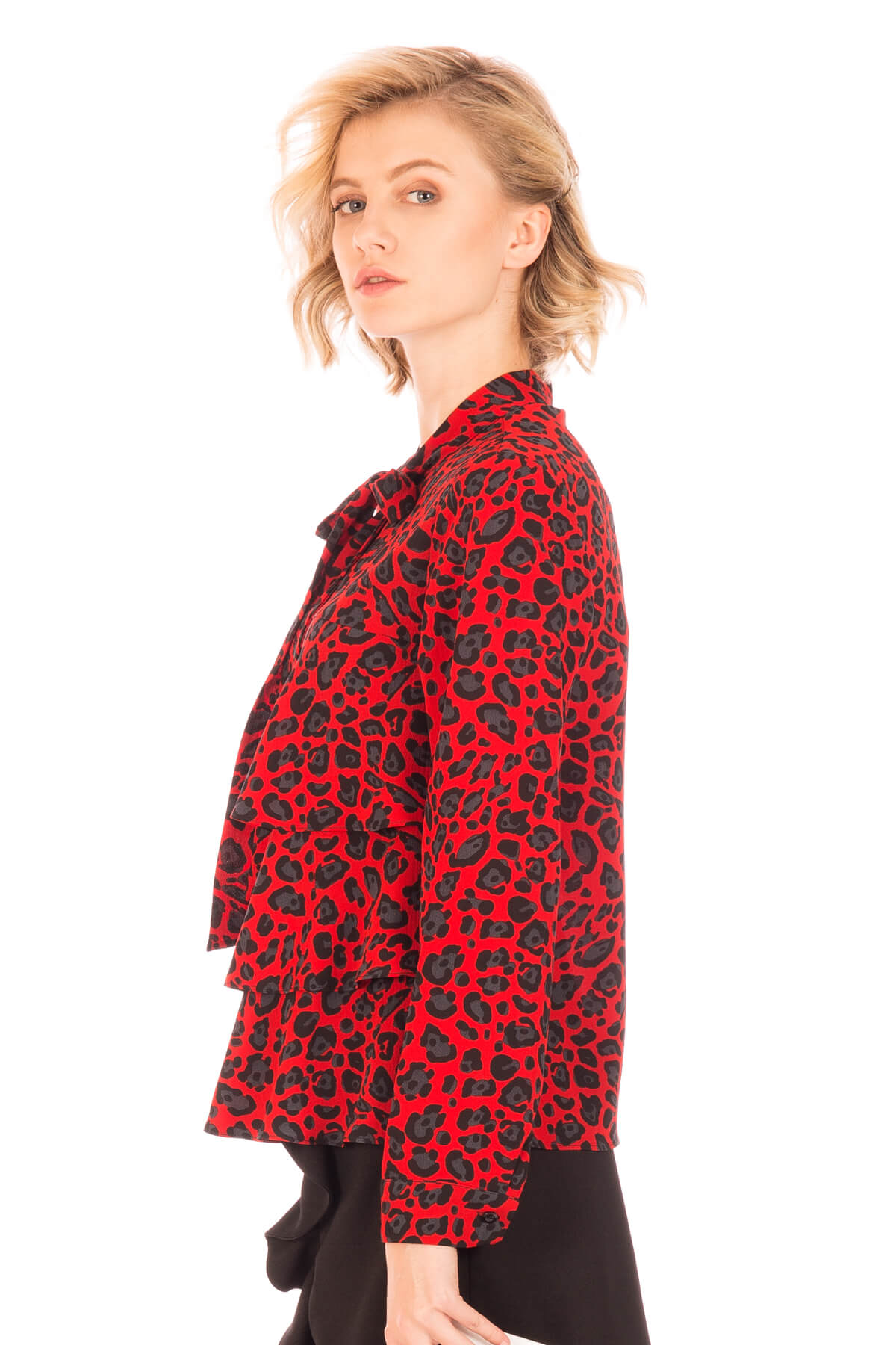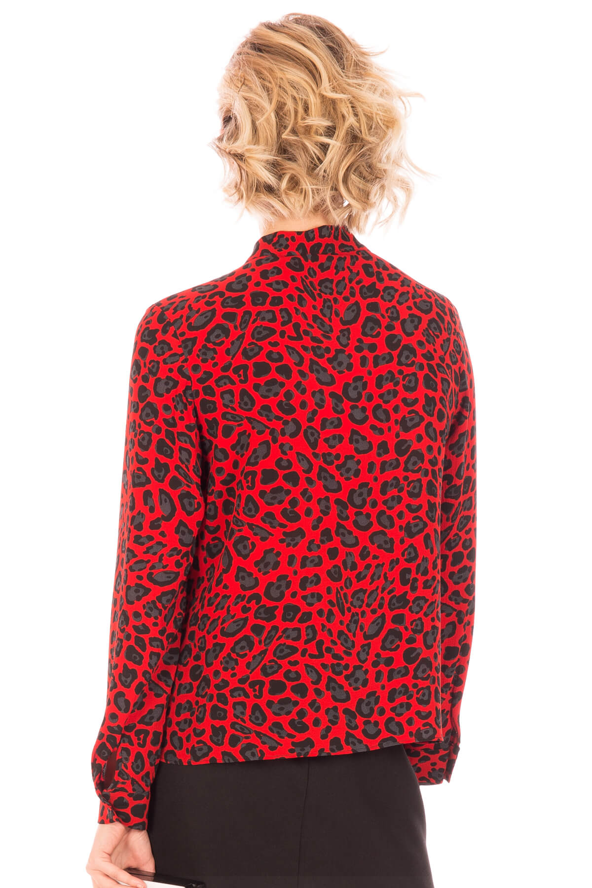 Carregada do espírito alegre dos anos setenta, a casa de moda Minueto combina o romantismo com a feminilidade. Cores fortes, gráficos peculiares e exclusivos dominam a nova coleção de O/I 18/19. Cortada em poliéster com print intemporal em vermelho, esta camisa padrão leopardo é construída com folhos franzidos sobrepostos na frente. Mangas compridas, com punhos de botão. Decote redondo com ligeira abertura e com laçarote na frente que serve como fecho da camisa. Na parte de trás apresenta-se lisa, com uma simplicidade de um clássico mas com toque virtuoso. Pode combinar com calça mas de gancho mais subido. A manequim está a vestir o tamanho S.