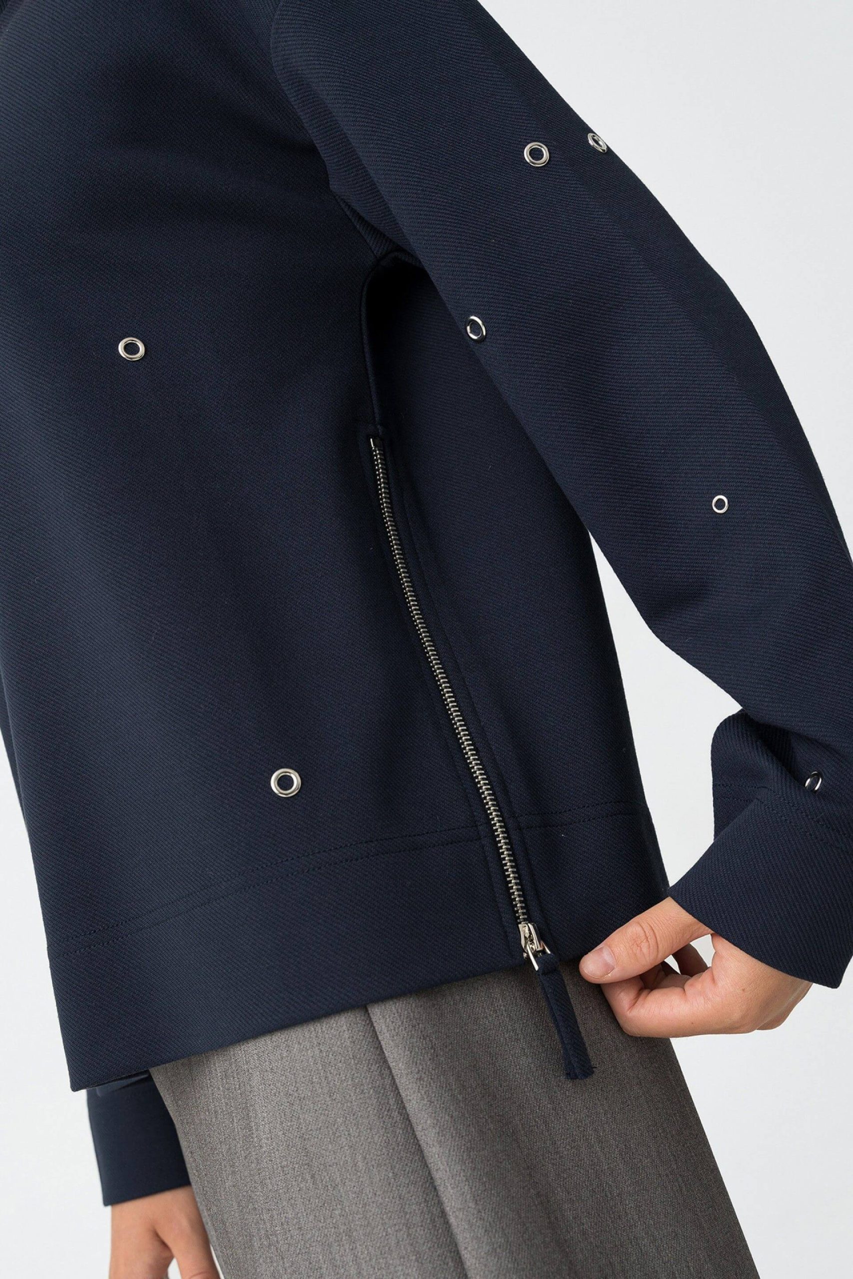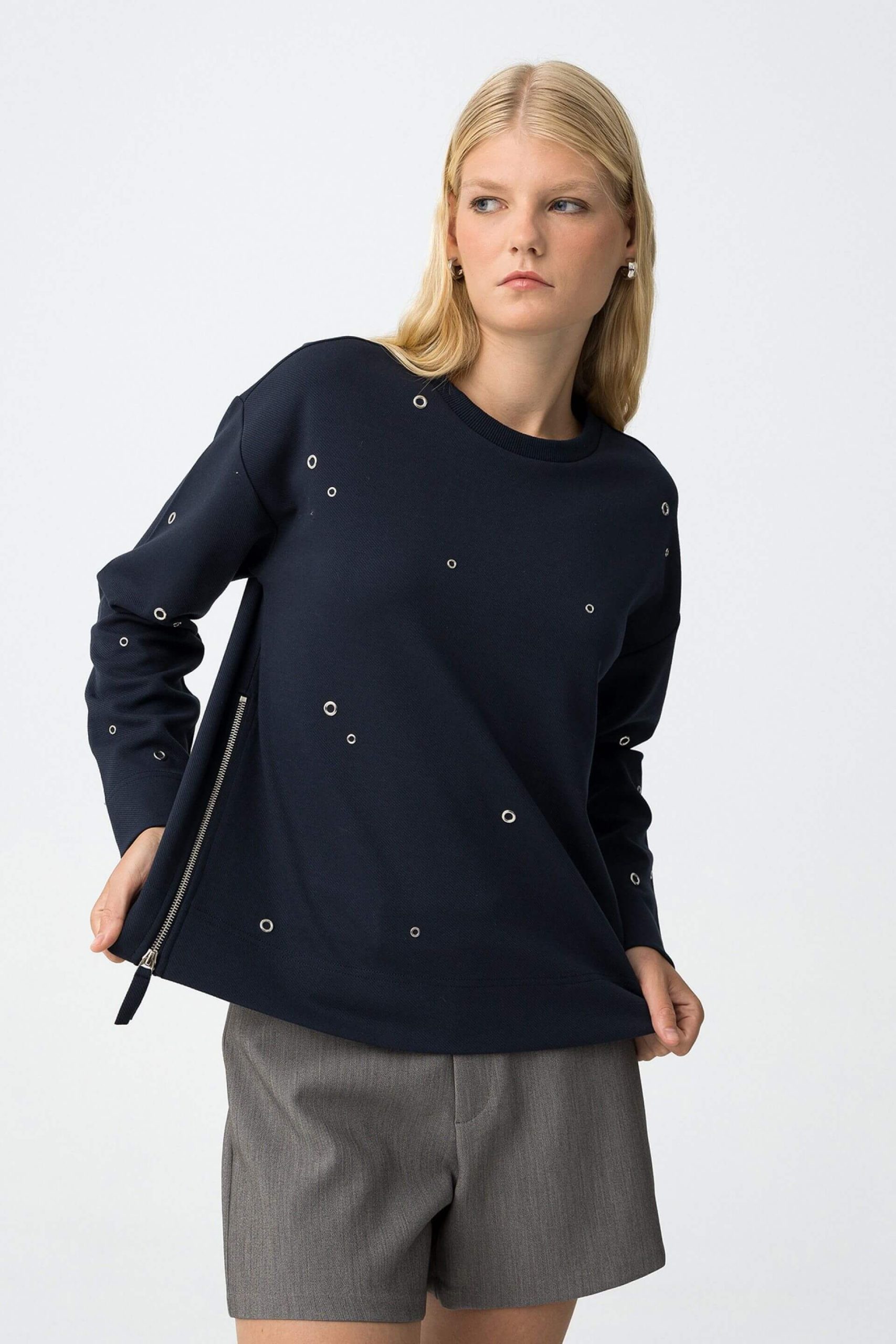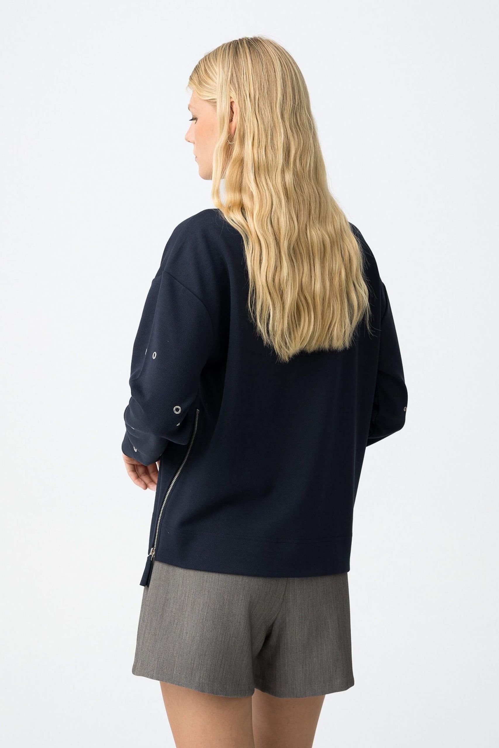 Pense em silhuetas dos anos 80, painéis pesados, denim super skinny e estampas de bandana. Pois bem essa era voltou aos dias de hoje. Assim é esta camisola azul c/ ilhoses da Tiffosi. Apresenta decote redondo e manga comprida. Para parte de baixo combina na perfeição com jeans mas a dar com o tom. A manequim está a vestir o tamanho S.