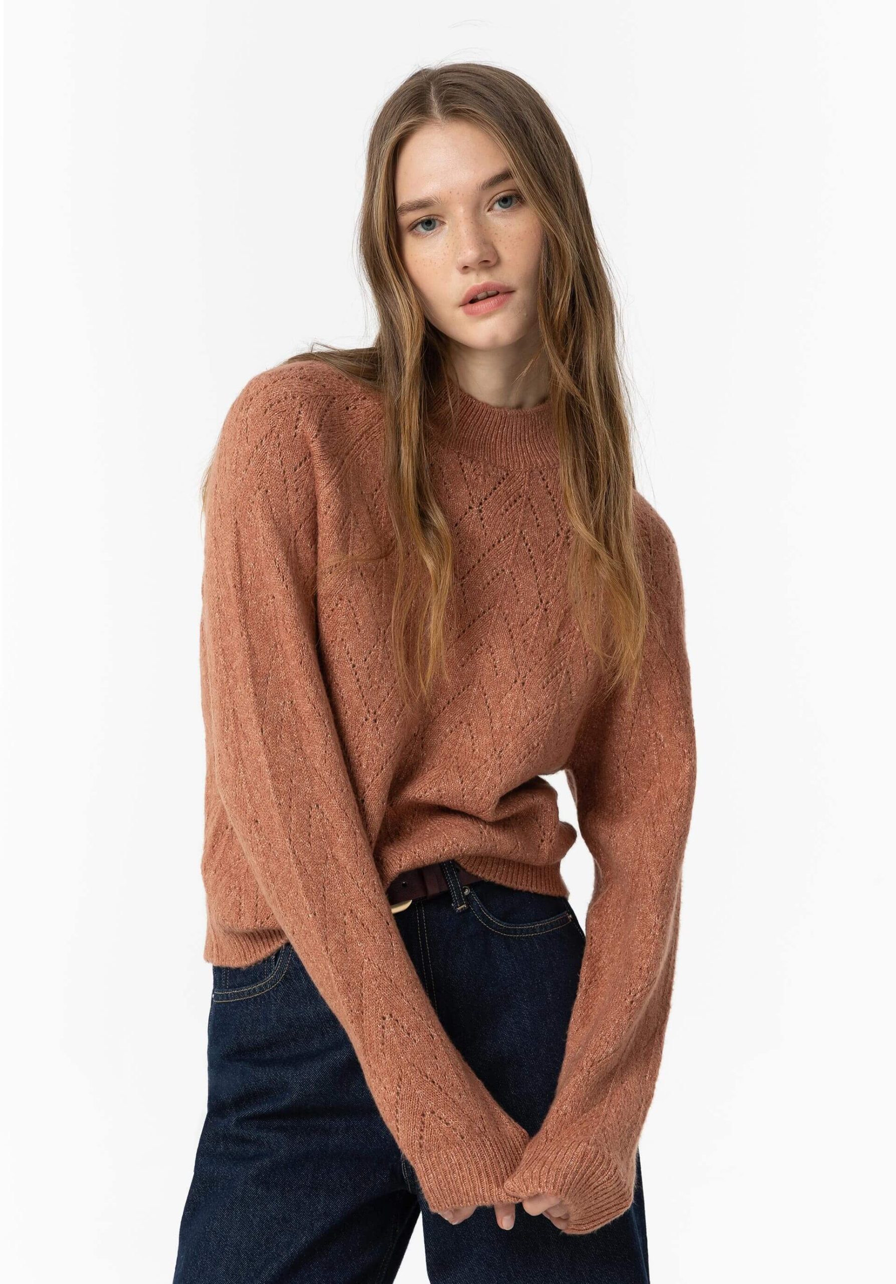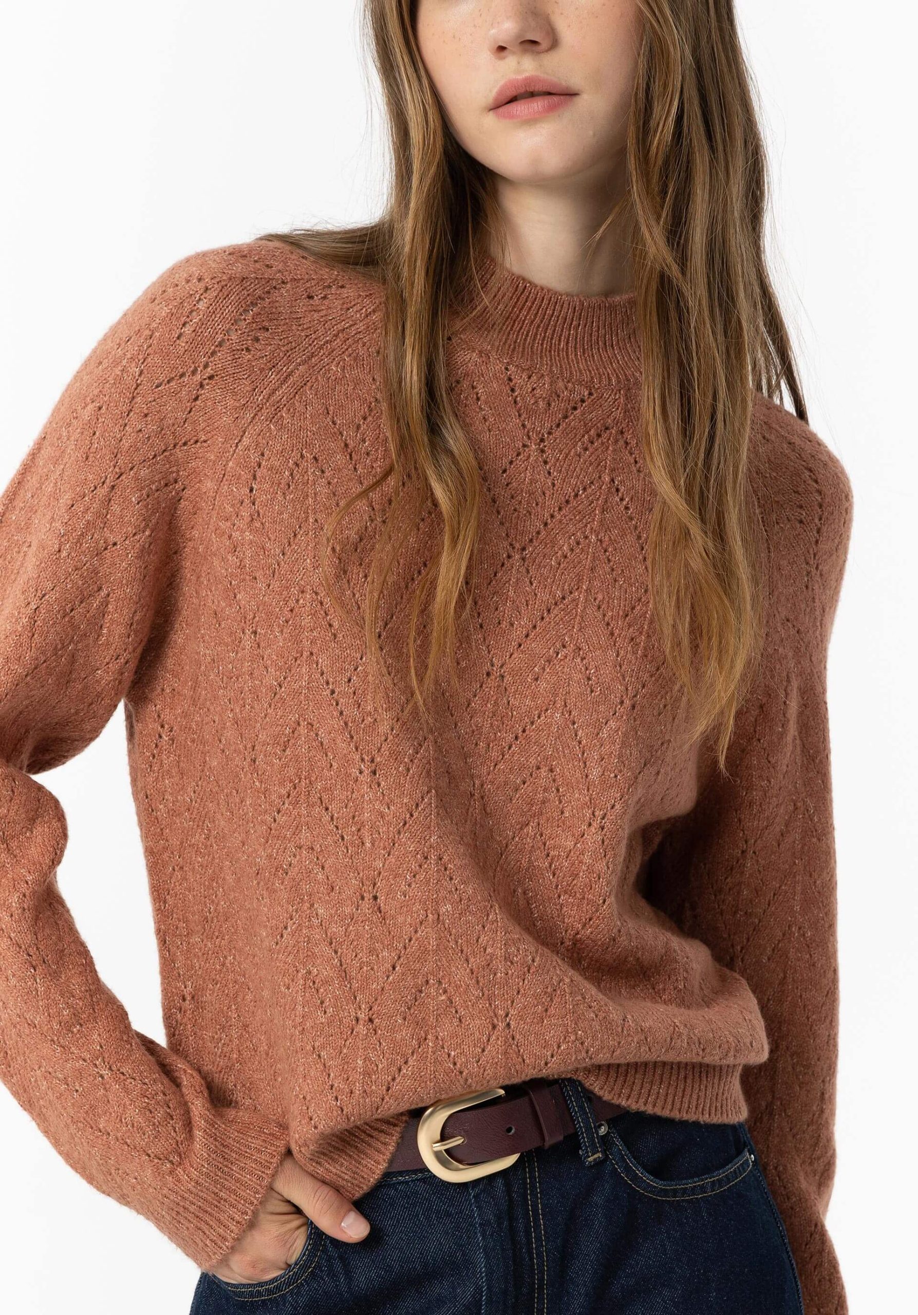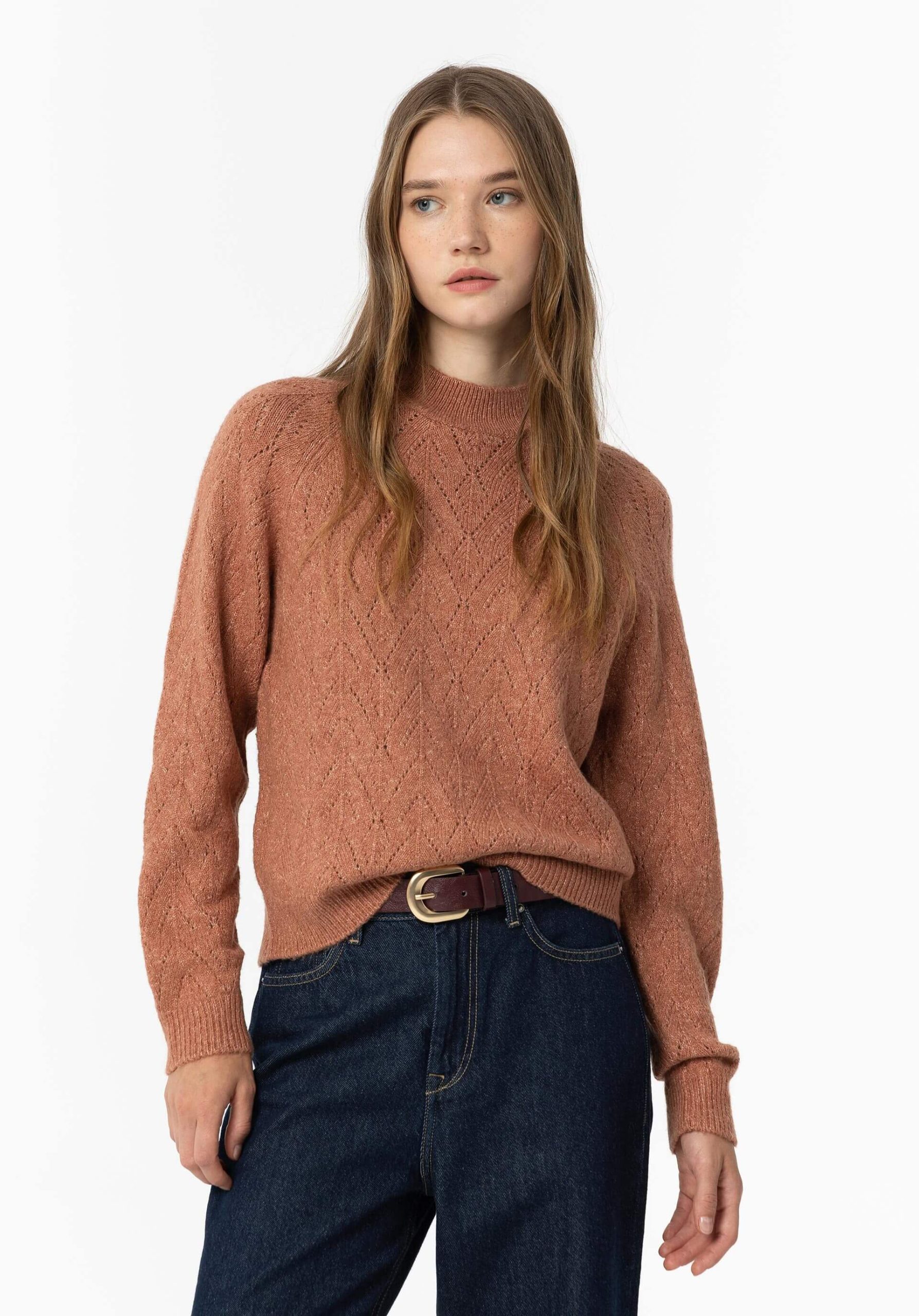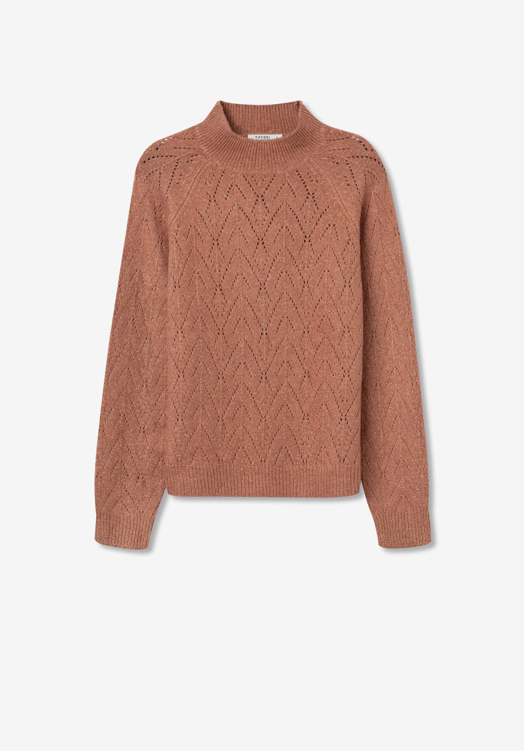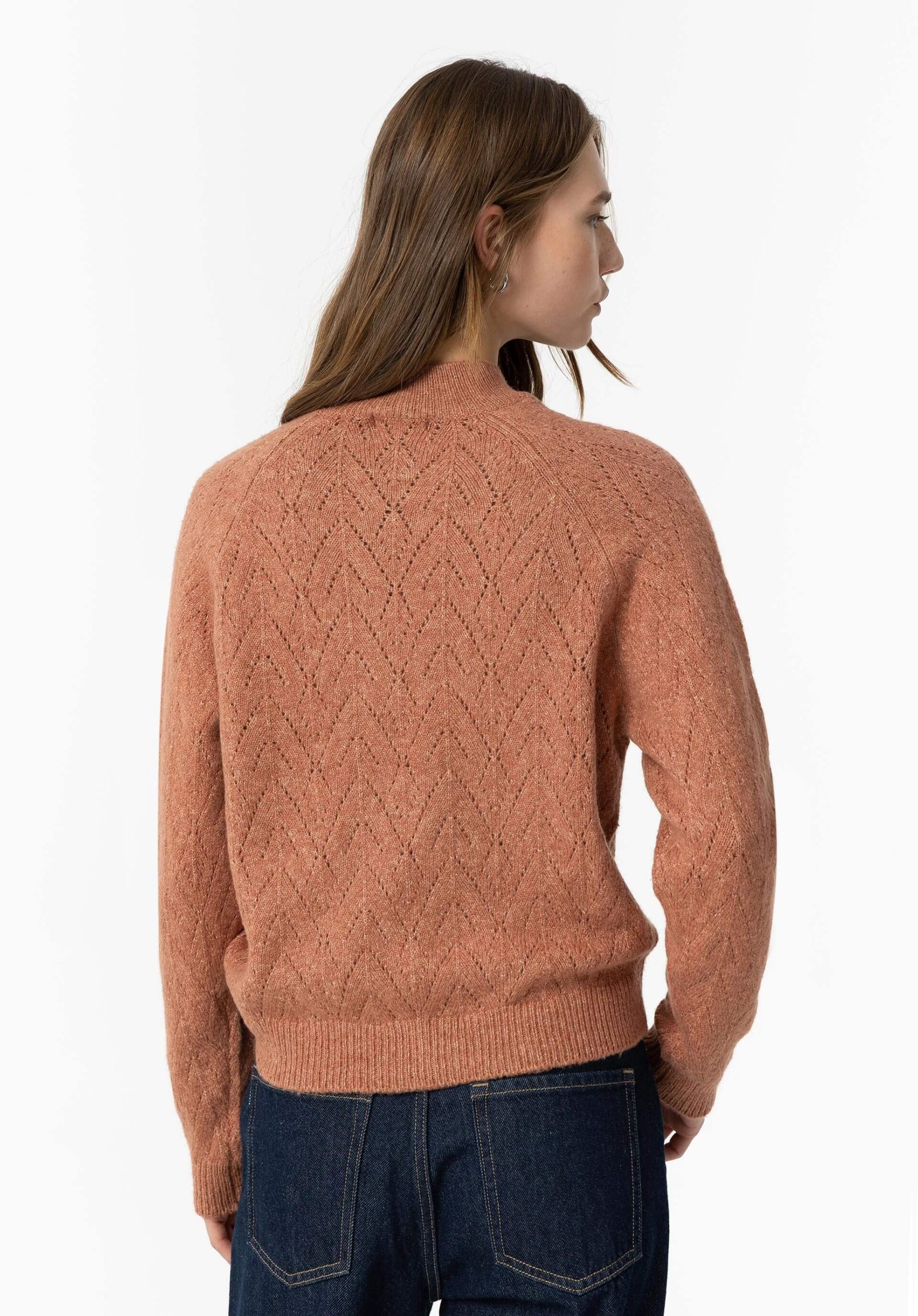 Conhecida por seu estilo urbano e design incomum, a Tiffosi incorpora detalhes inovadores. Combinados com silhuetas inspiradas em streetwear e uma estética jovial. Assim é esta camisola de malha rosa velho da Tiffosi. Tem decote redondo e manga comprida. Para parte de baixo combina na perfeição com jeans, mas dentro do mesmo estilo. A modelo está a vestir o S.