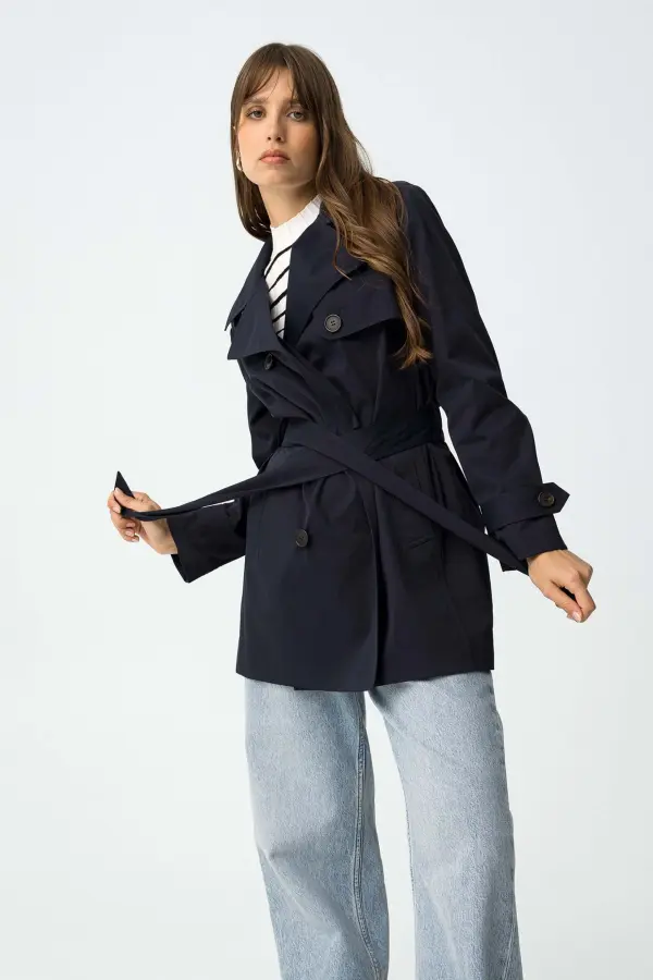 Conhecida por seu estilo urbano e design incomum, a Tiffosi incorpora detalhes inovadores. Combinados com silhuetas inspiradas em streetwear e uma estética jovial. Assim é esta canadiana curta em azul da Tiffosi. Apresenta manga comprida, botões, cinto, bolsos laterais e gola de virados. Para parte de baixo combina na perfeição com jeans, mas dentro do mesmo estilo. A modelo está a vestir o tamanho S.