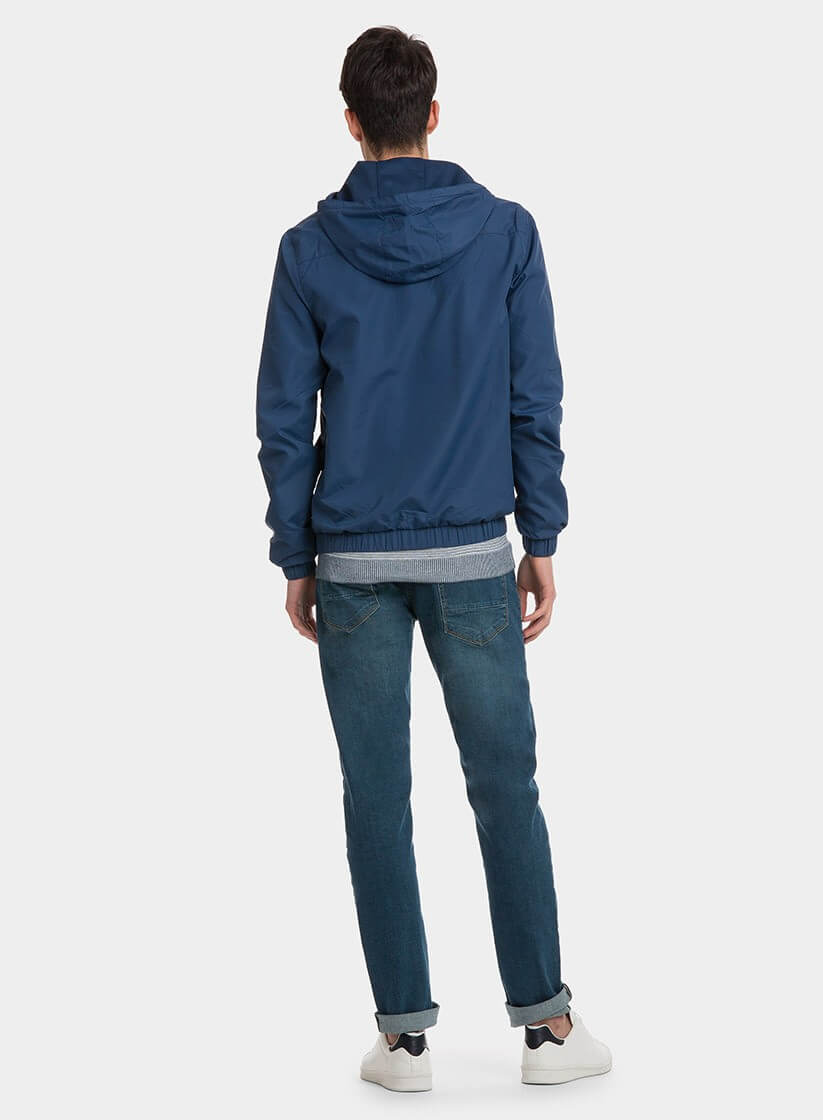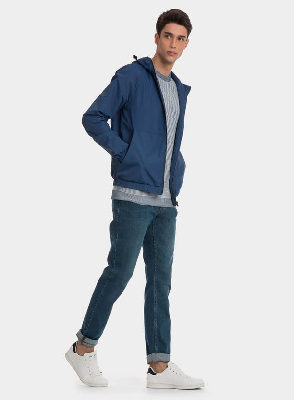 Conhecida por seu estilo urbano e design incomum, a Tiffosi incorpora detalhes inovadores. Combinados com silhuetas inspiradas em streetwear e uma estética jovial. Fundada em 1981, a Tiffosi é conhecida por produzir inicialmente jeans. Mas há muito que alargou o seu leque de oferta. Este casaco azul com capuz, da Tiffosi, é exemplo disso mesmo. Elaborado em tela impermeável azul com fecho de correr em metal. Tem bois bolsos metidos na diagonal com mola na frente, mangas compridas com elástico nos punhos e na bainha. Para parte de baixo pode ser usado com jeans ou calça de sarja, mas a combinar. O modelo está a vestir o tamanho S.