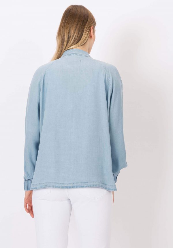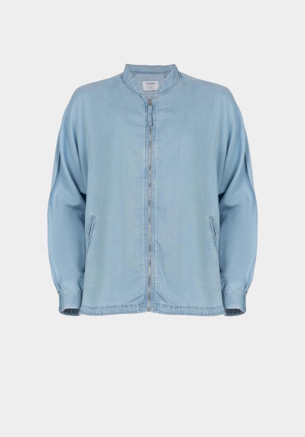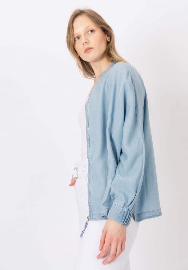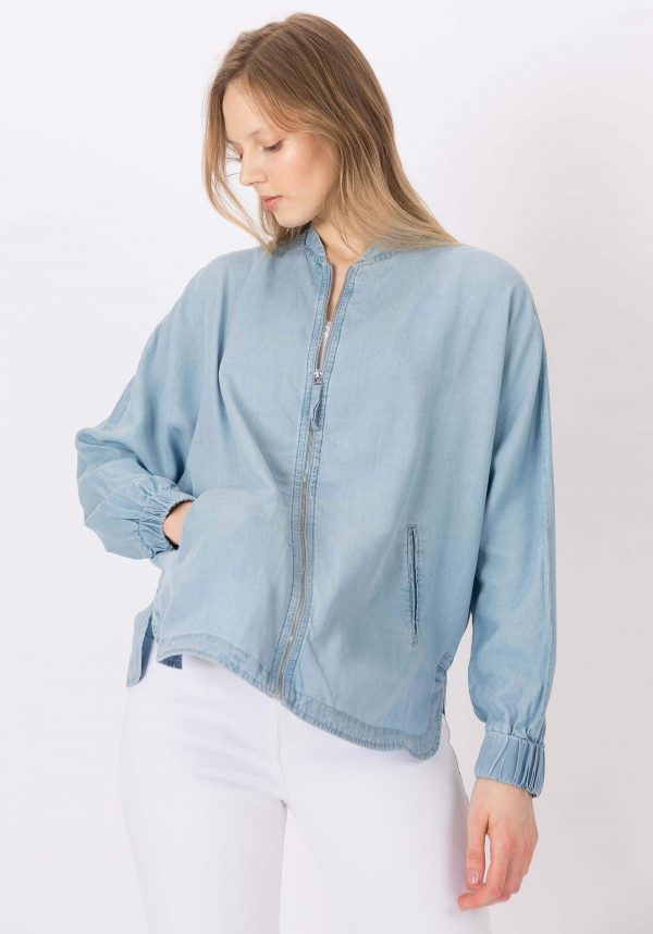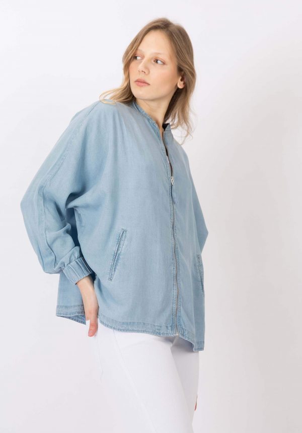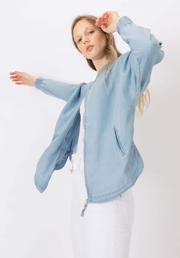 Pense em silhuetas dos anos 80, painéis pesados, denim super skinny e estampas de bandana. Pois bem essa era voltou aos dias de hoje. Assim é este casaco camiseiro em ganga da Tiffosi. Apresenta um fecho metálico de correr na frente e manga comprida. Para parte de baixo combina na perfeição com calças mas a dar com o tom. A manequim está a vestir o tamanho S.