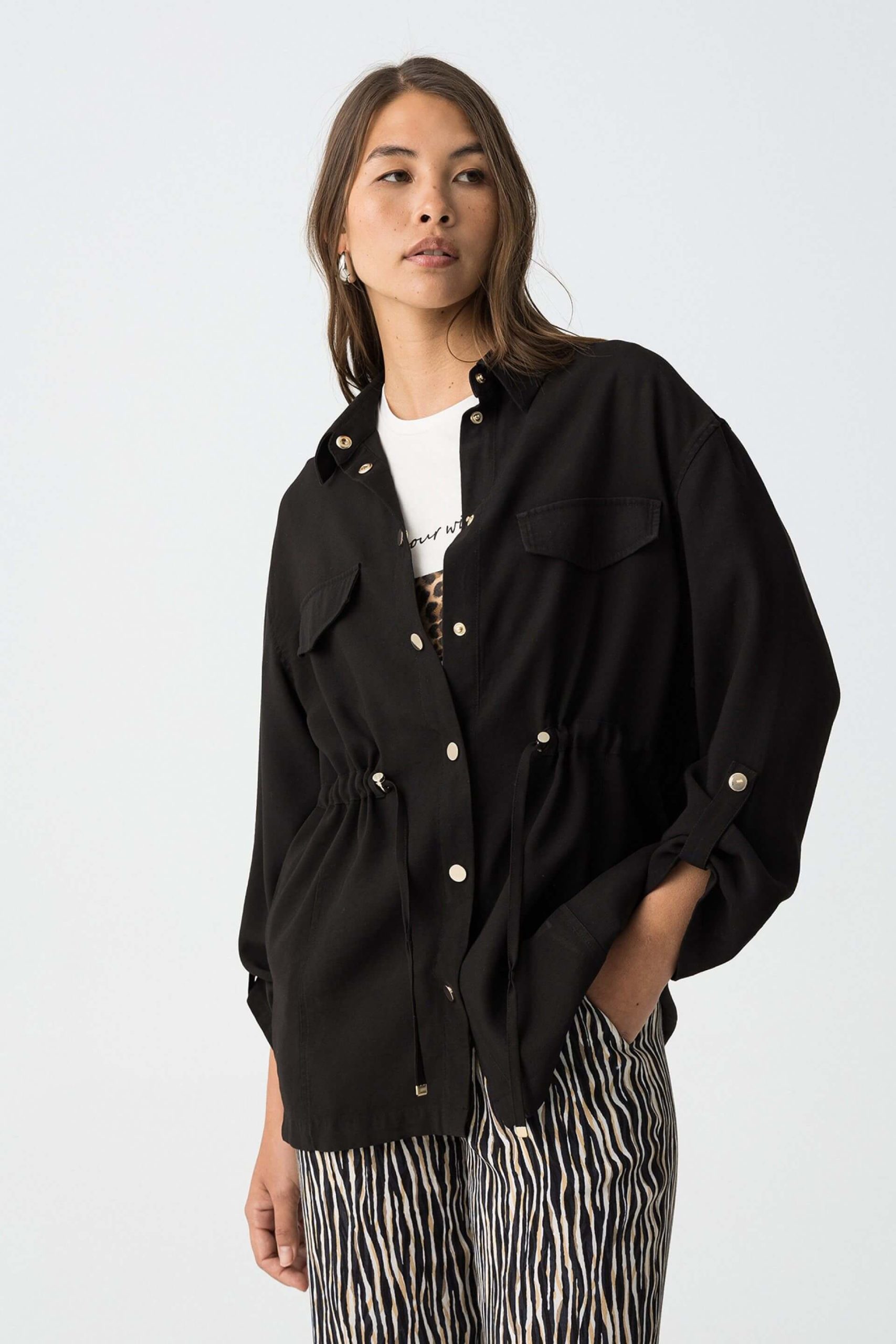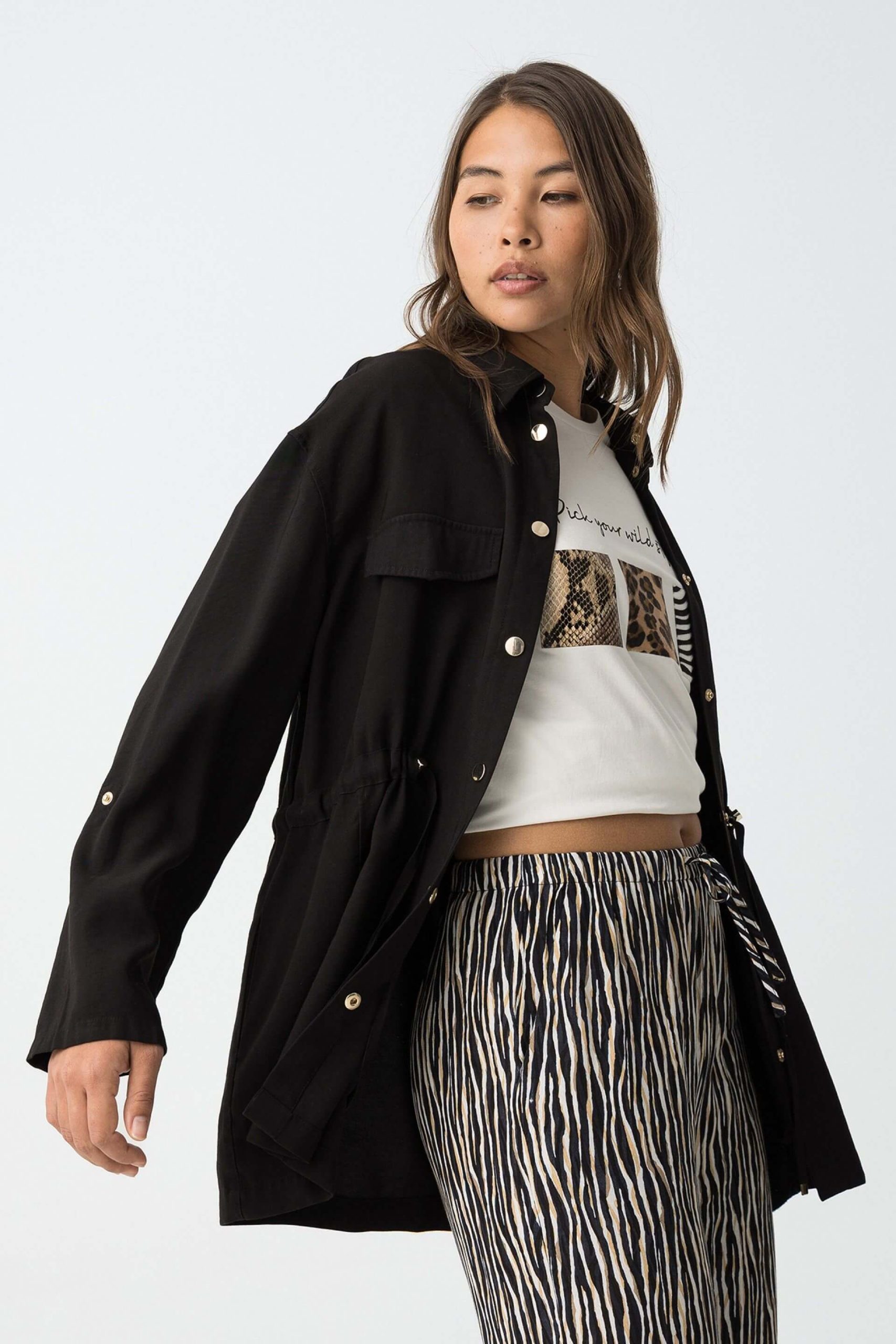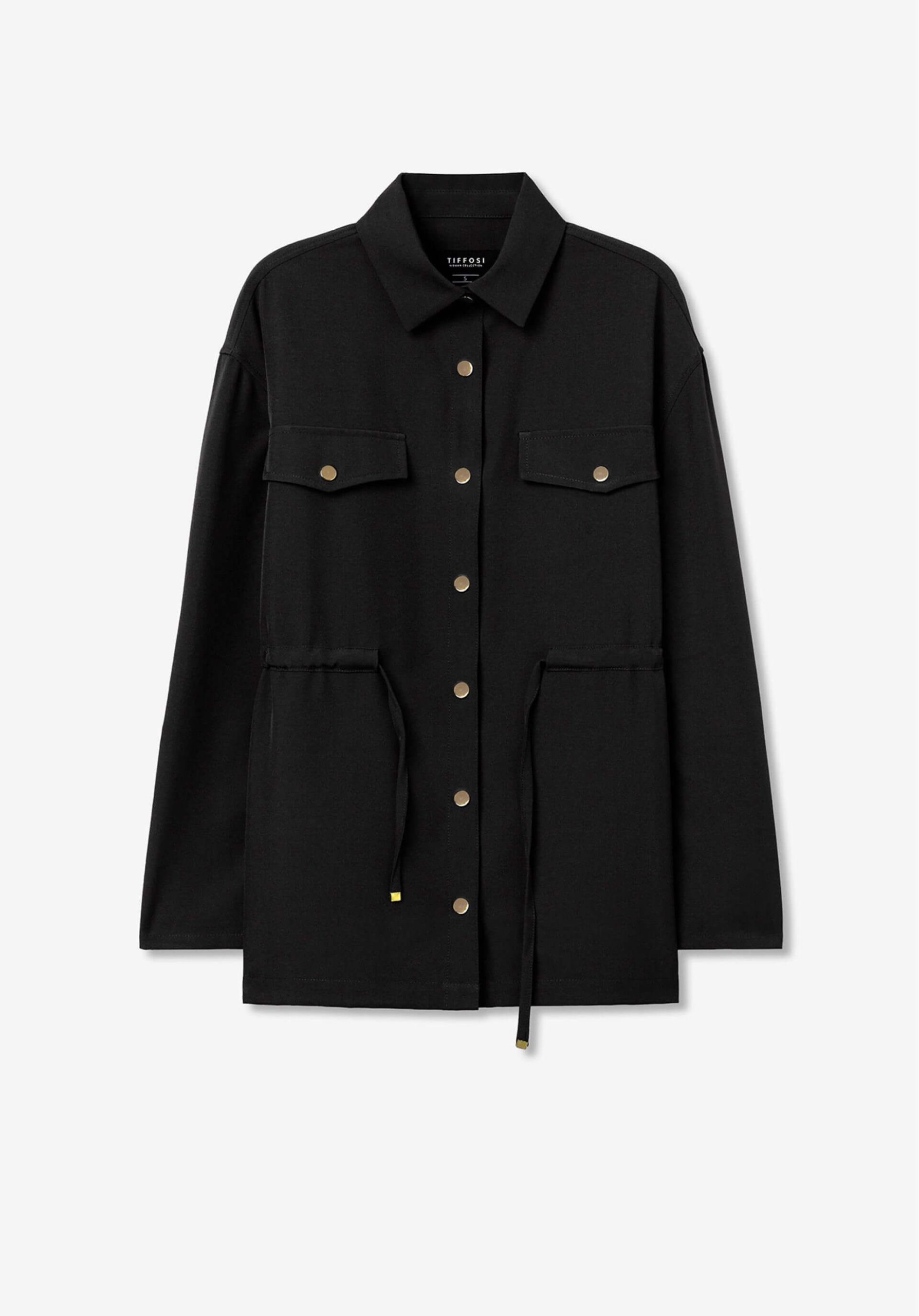 Conhecida por seu estilo urbano e design incomum, a Tiffosi incorpora detalhes inovadores. Combinados com silhuetas inspiradas em streetwear e uma estética jovial. A marca foi lançada em 1981 e oferece produtos de qualidade a preços acessíveis, que contam histórias e inspiram um estilo de vida. Assim é este casaco camiseiro preto da Tiffosi. Apresenta manga comprida, bolsos e botões. Para parte de baixo combina na perfeição com calça, mas dentro do mesmo estilo. A modelo está a vestir o tamanho S.