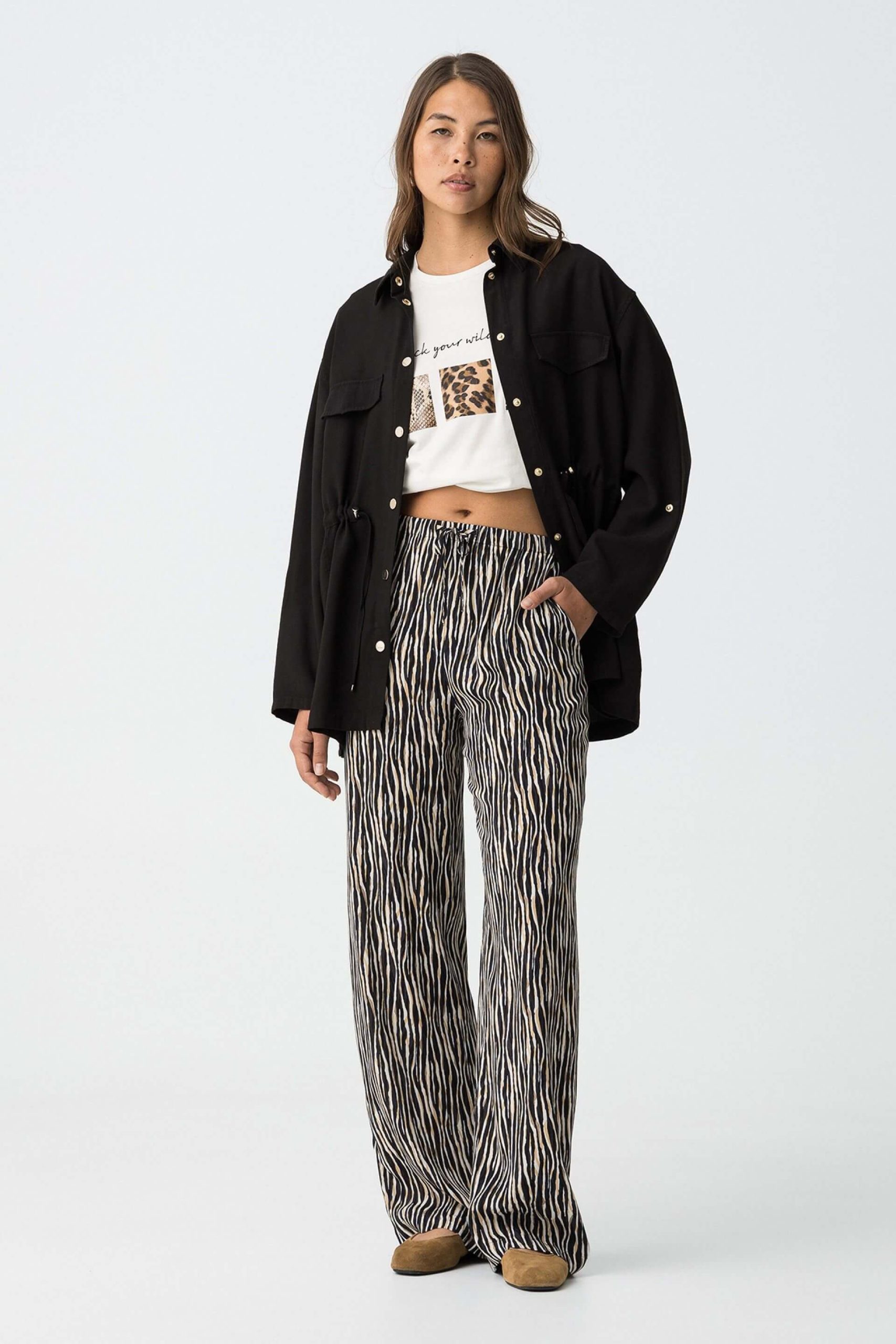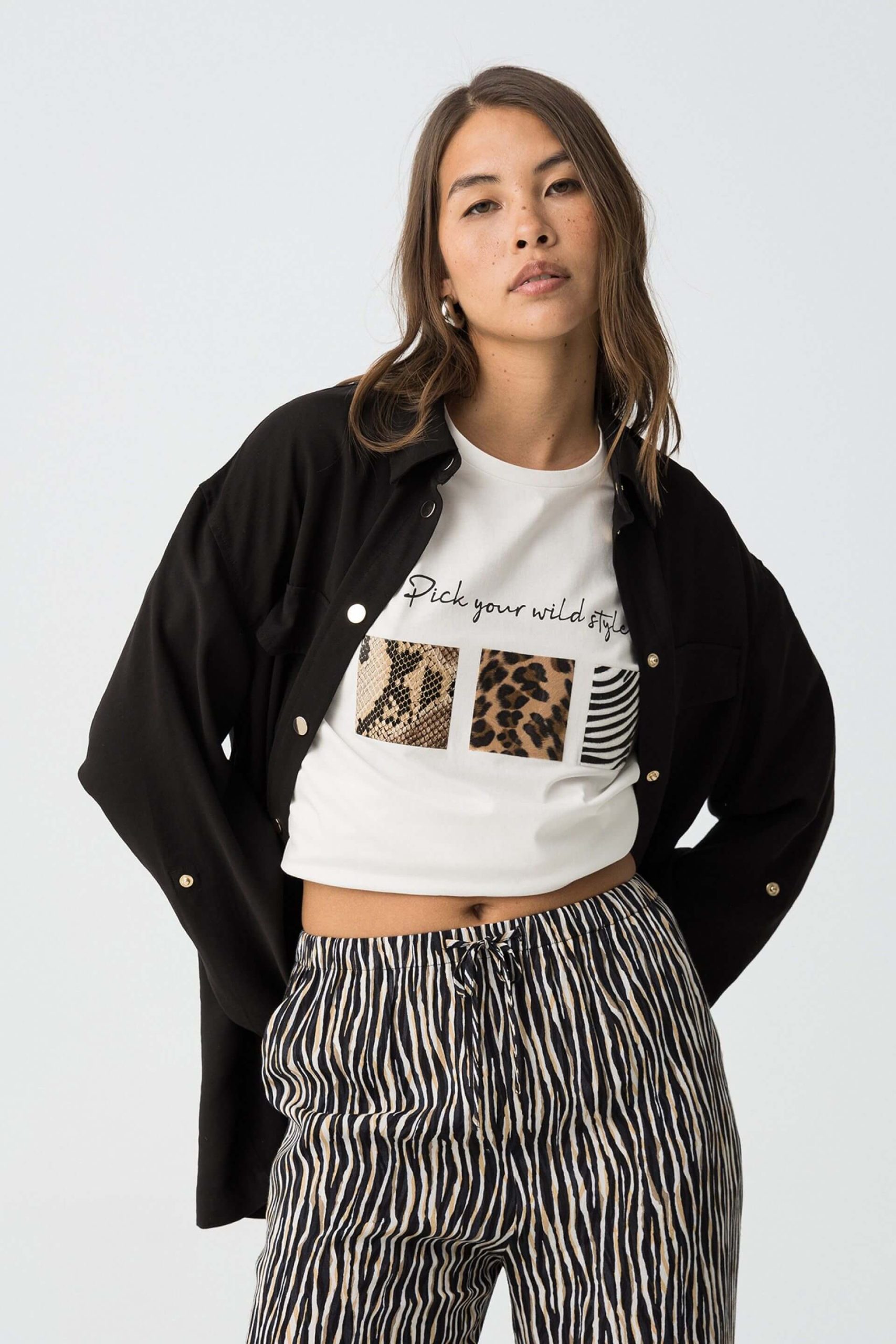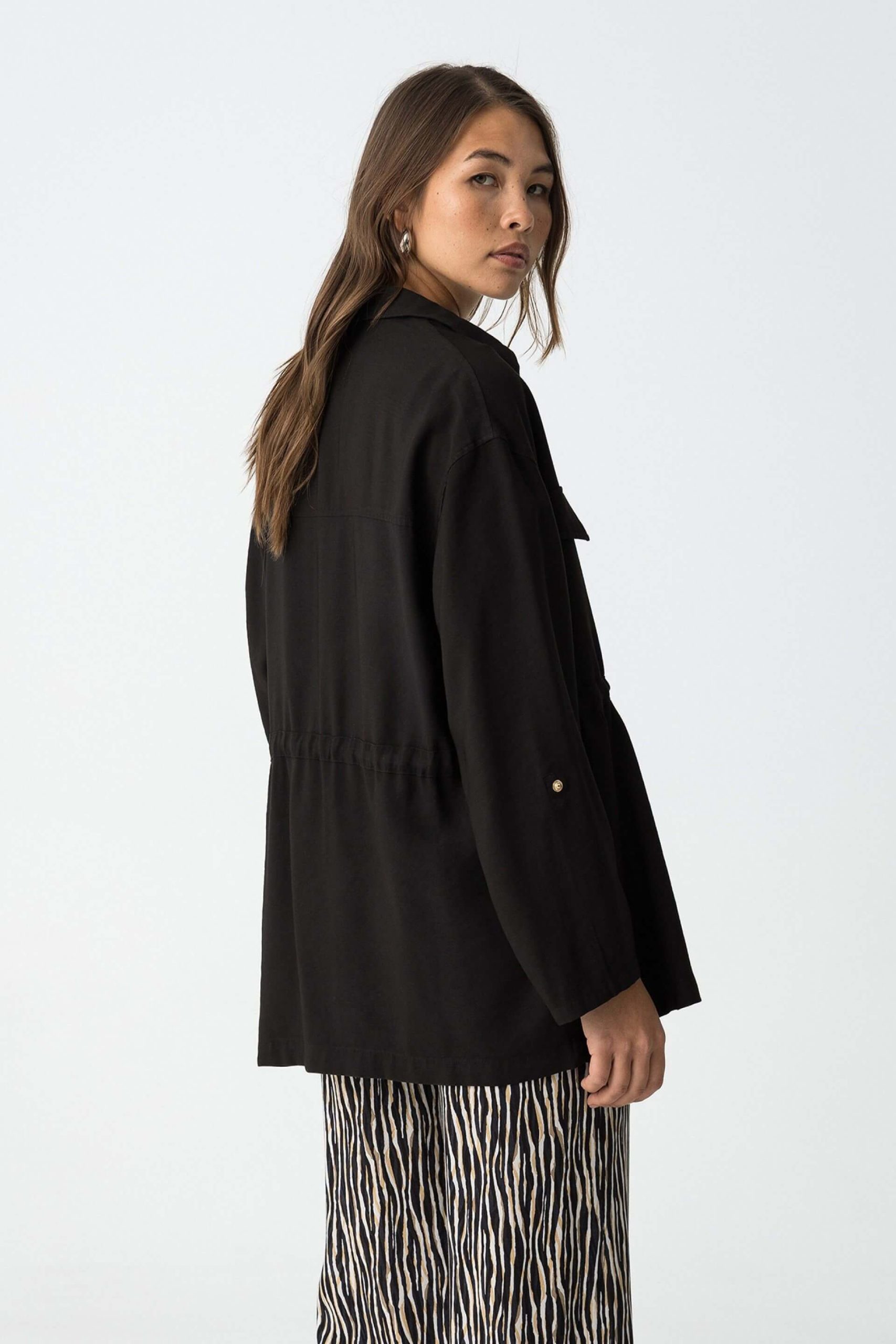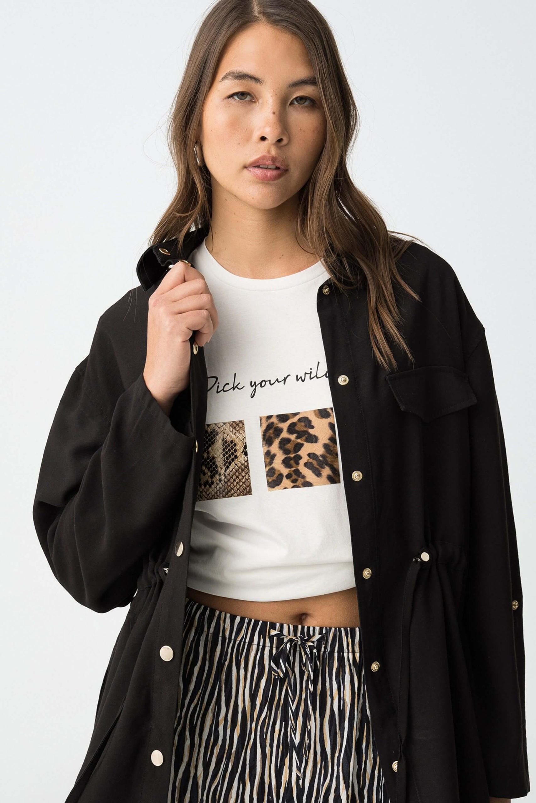 Conhecida por seu estilo urbano e design incomum, a Tiffosi incorpora detalhes inovadores. Combinados com silhuetas inspiradas em streetwear e uma estética jovial. A marca foi lançada em 1981 e oferece produtos de qualidade a preços acessíveis, que contam histórias e inspiram um estilo de vida. Assim é este casaco camiseiro preto da Tiffosi. Apresenta manga comprida, bolsos e botões. Para parte de baixo combina na perfeição com calça, mas dentro do mesmo estilo. A modelo está a vestir o tamanho S.