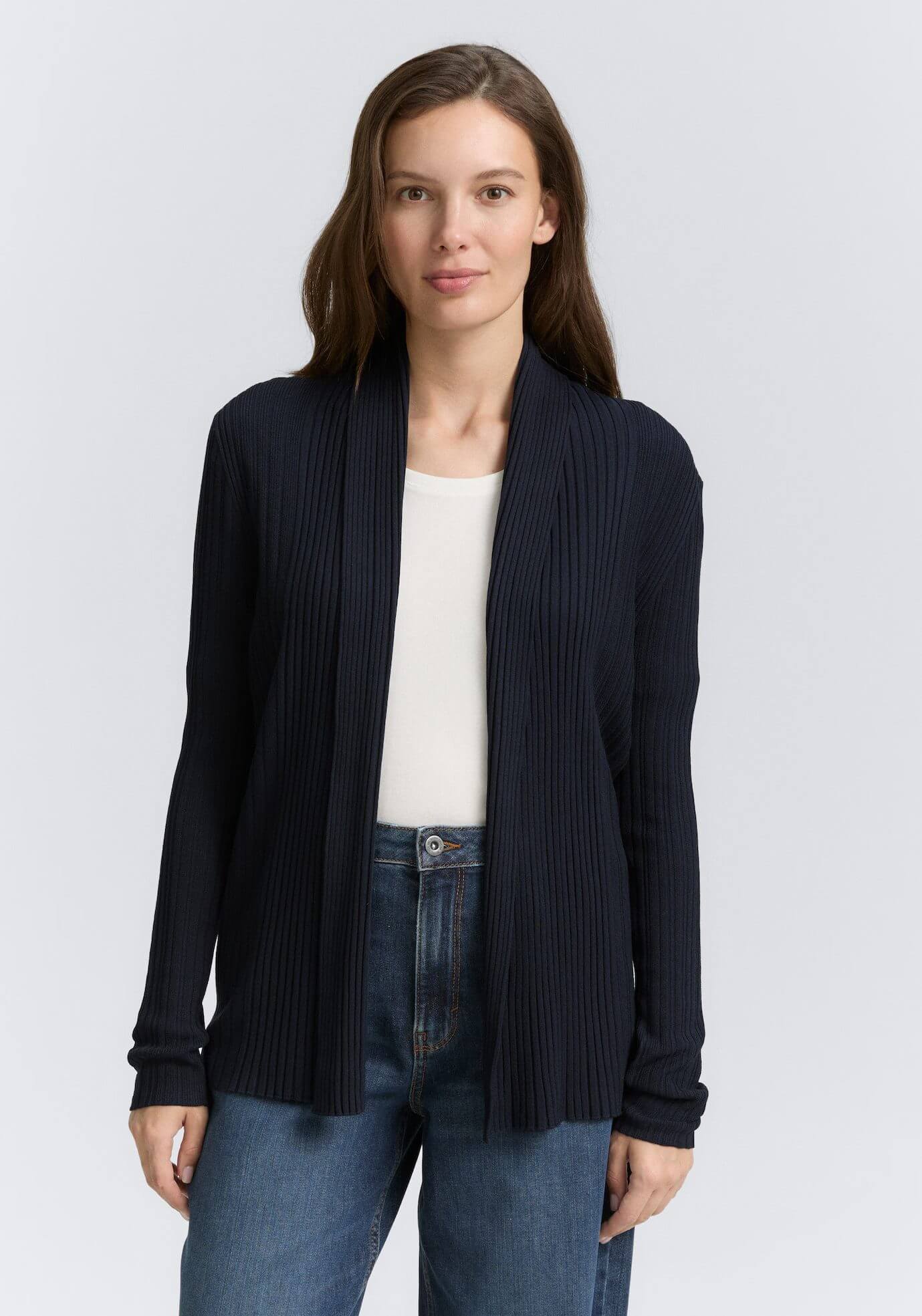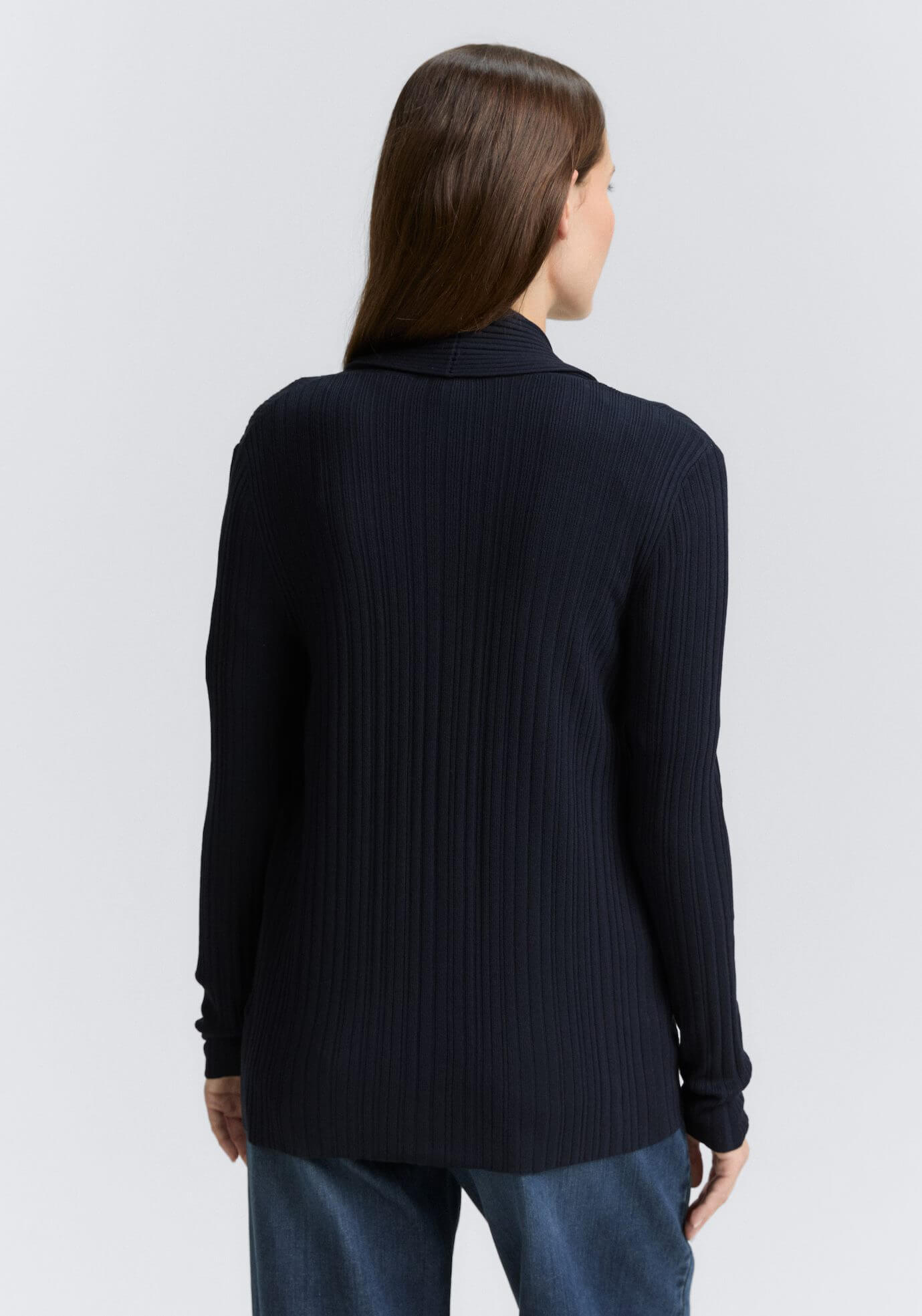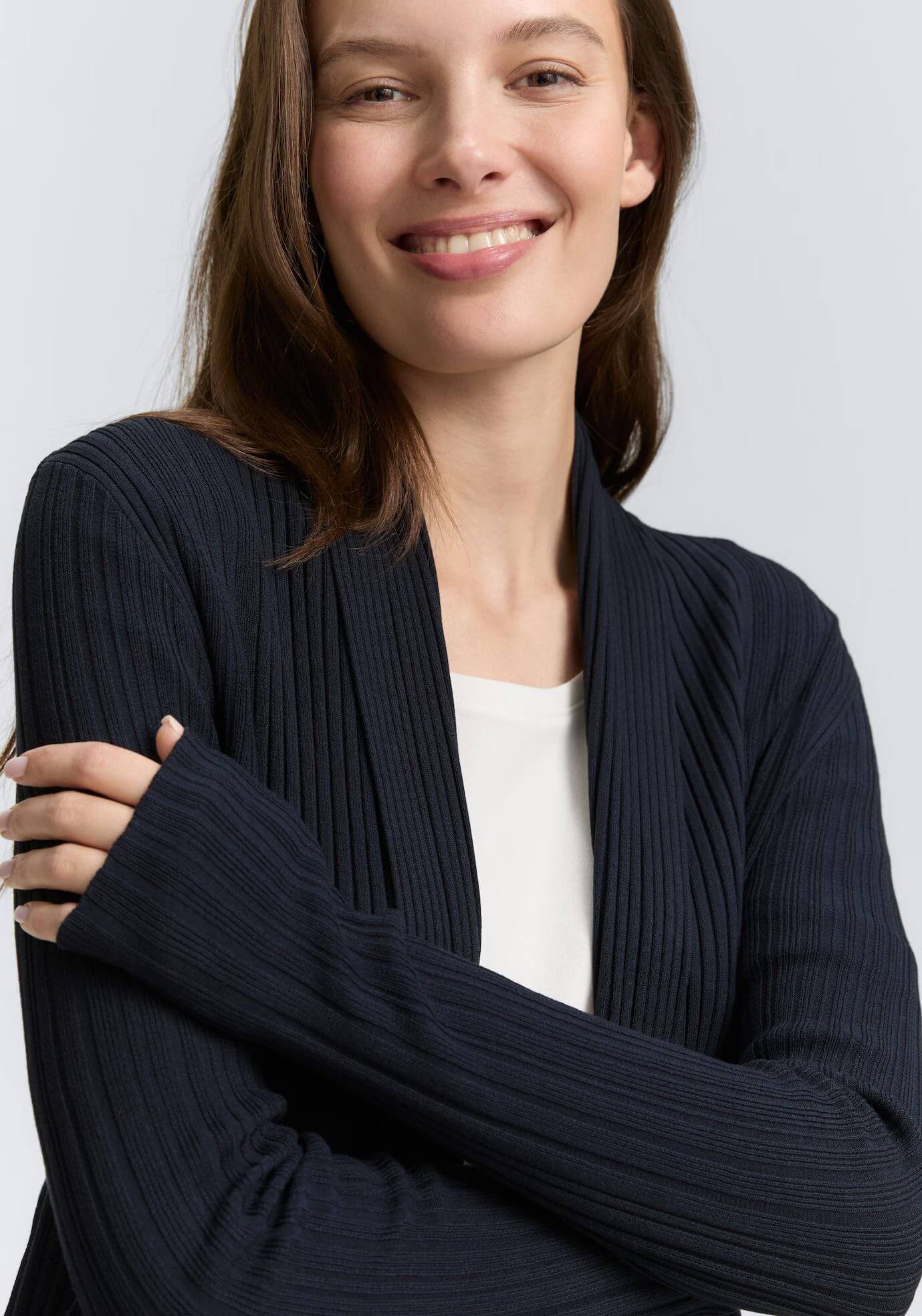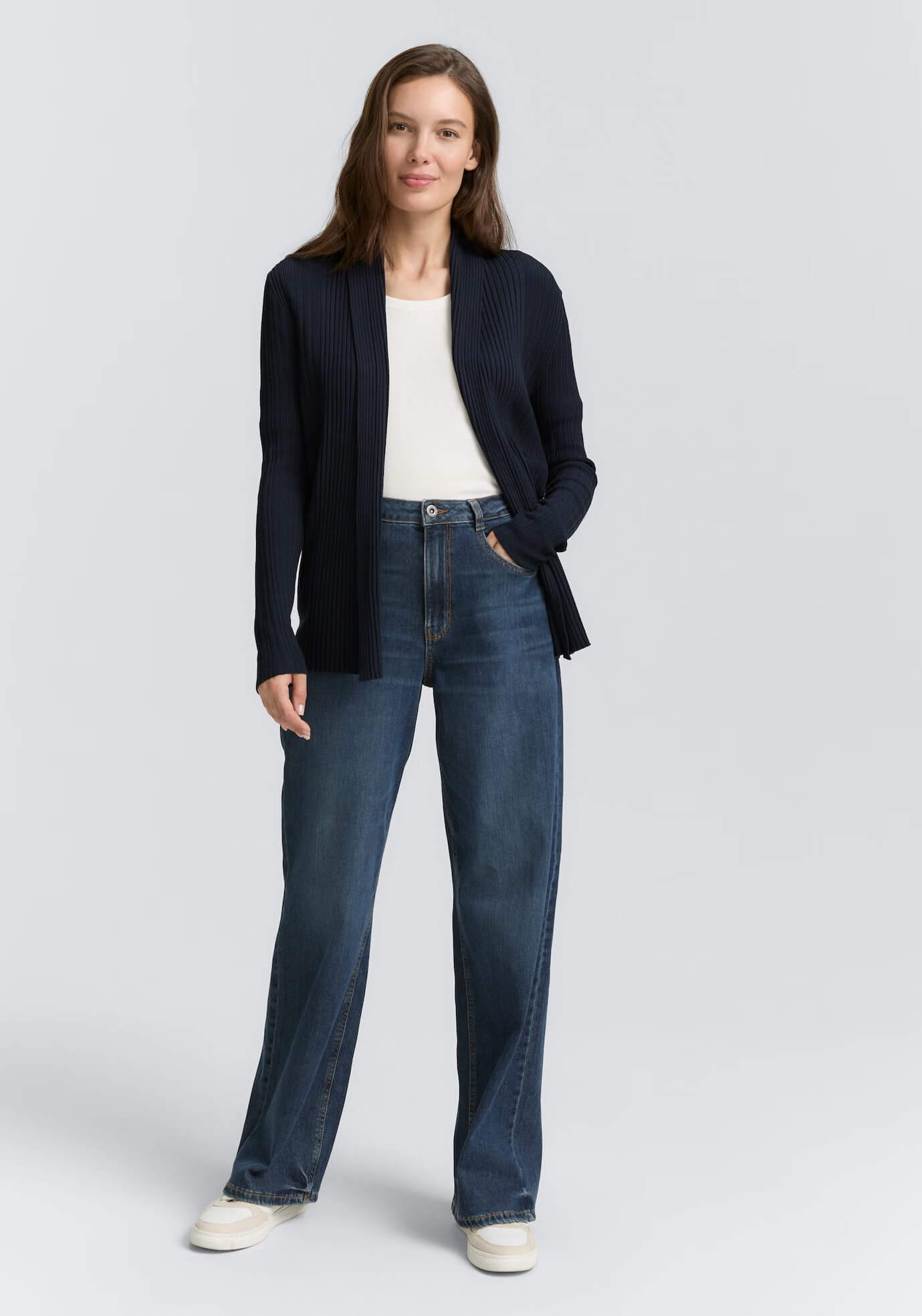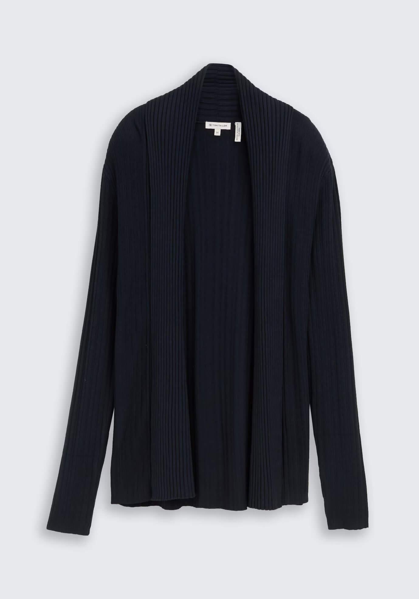 Conhecida por seu estilo urbano e design incomum, a Tom Tailor incorpora detalhes inovadores. Combinados com silhuetas inspiradas em streetwear e uma estética jovial. Assim é este casaco de malha azul s/ botões da Tom Tailor. Apresenta manga comprida. Para parte de baixo combina na perfeição com calça, mas dentro do mesmo estilo. A modelo está a vestir o tamanho S.
