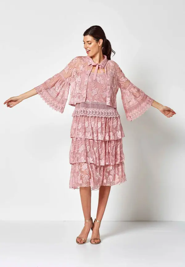 Pense em silhuetas dos anos 80, painéis pesados, denim super skinny e estampas de bandana. Pois bem essa era voltou aos dias de hoje. Assim é este casaco de renda rosa c/ manga da Mdm. Apresenta decote em bico e manga curta. Para parte de dentro combina na perfeição com vestido mas a dar com o tom. A manequim está a vestir o tamanho 36.