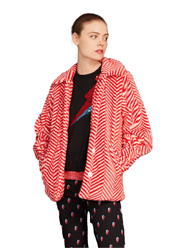 Carregada do espírito alegre dos anos setenta, a casa de moda Minueto combina o romantismo com a feminilidade. Pois prova que a marca vive de telas com formas arrojadas prints únicos e extravagantes. Assim é este casaco espinhado vermelho. Apresenta gola de virados, manga comprida, bolsos metidos e botões. Pode combinar com sapatilhas. A manequim está a vestir o tamanho S.