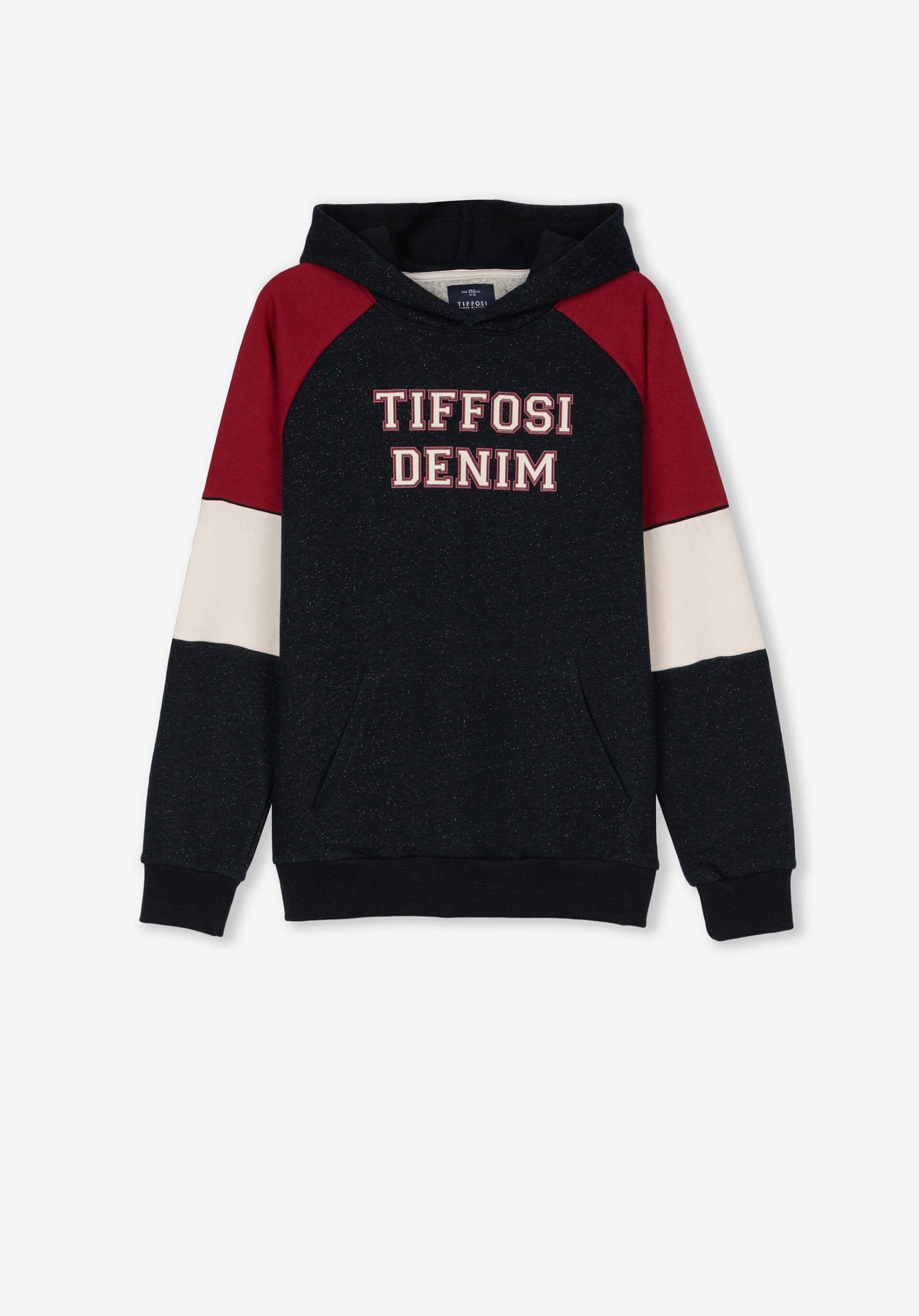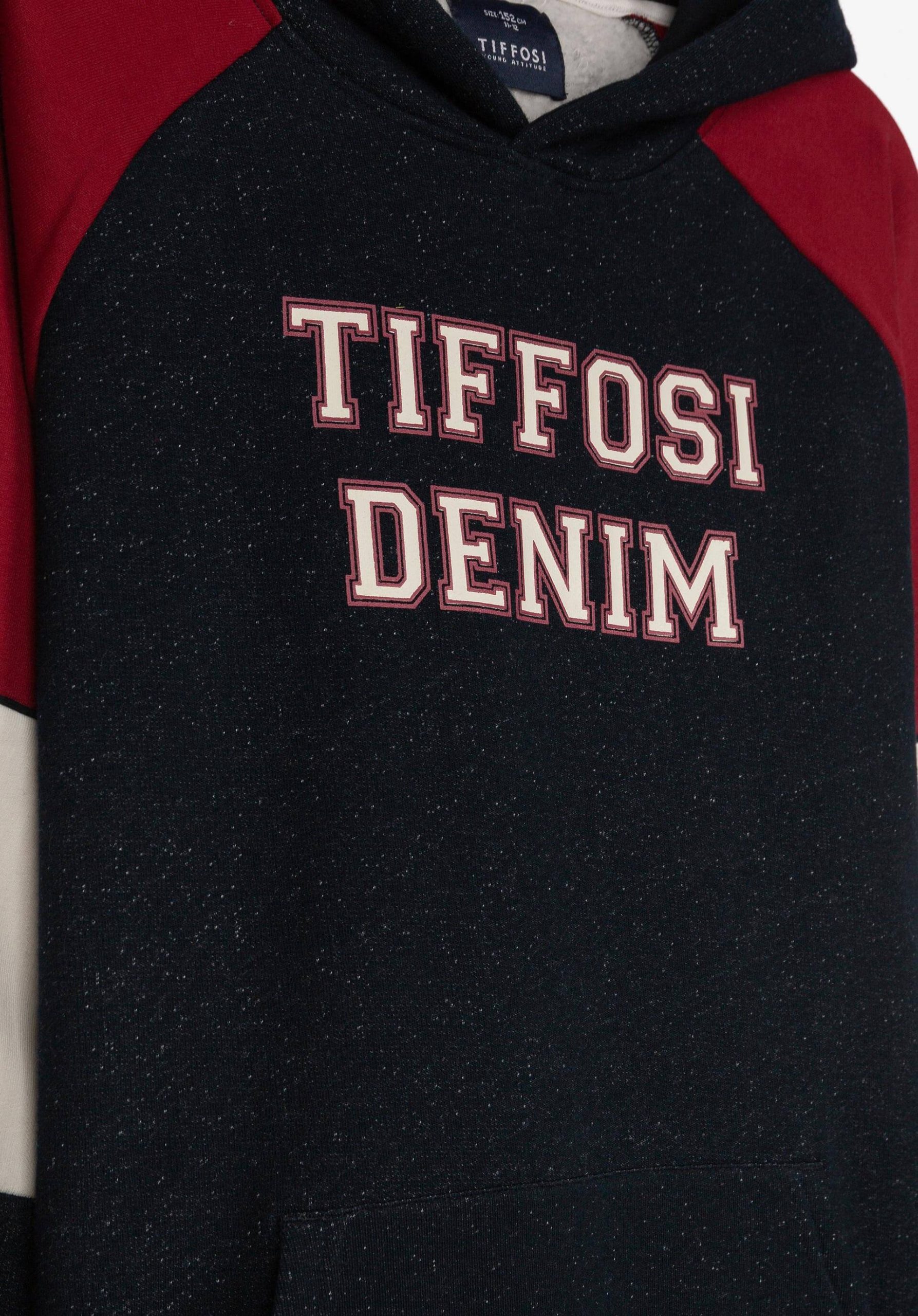 Pense em silhuetas dos anos 80, painéis pesados, denim super skinny e estampas de bandana. Pois bem essa era voltou aos dias de hoje. Conhecida por seu estilo urbano e design incomum, a Tiffosi incorpora detalhes nativos portugueses. Assim é este hoodie azul denim da Tiffosi. Tem decote redondo, capuz, bolso e manga comprida. Para parte de baixo combina na perfeição com jeans mas a dar com o tom. A imagem está no tamanho 9-10 anos /140 cm.