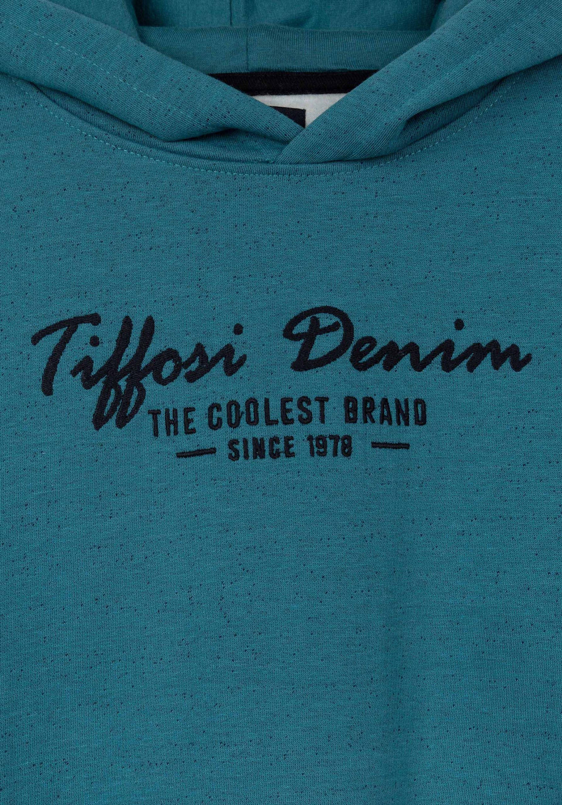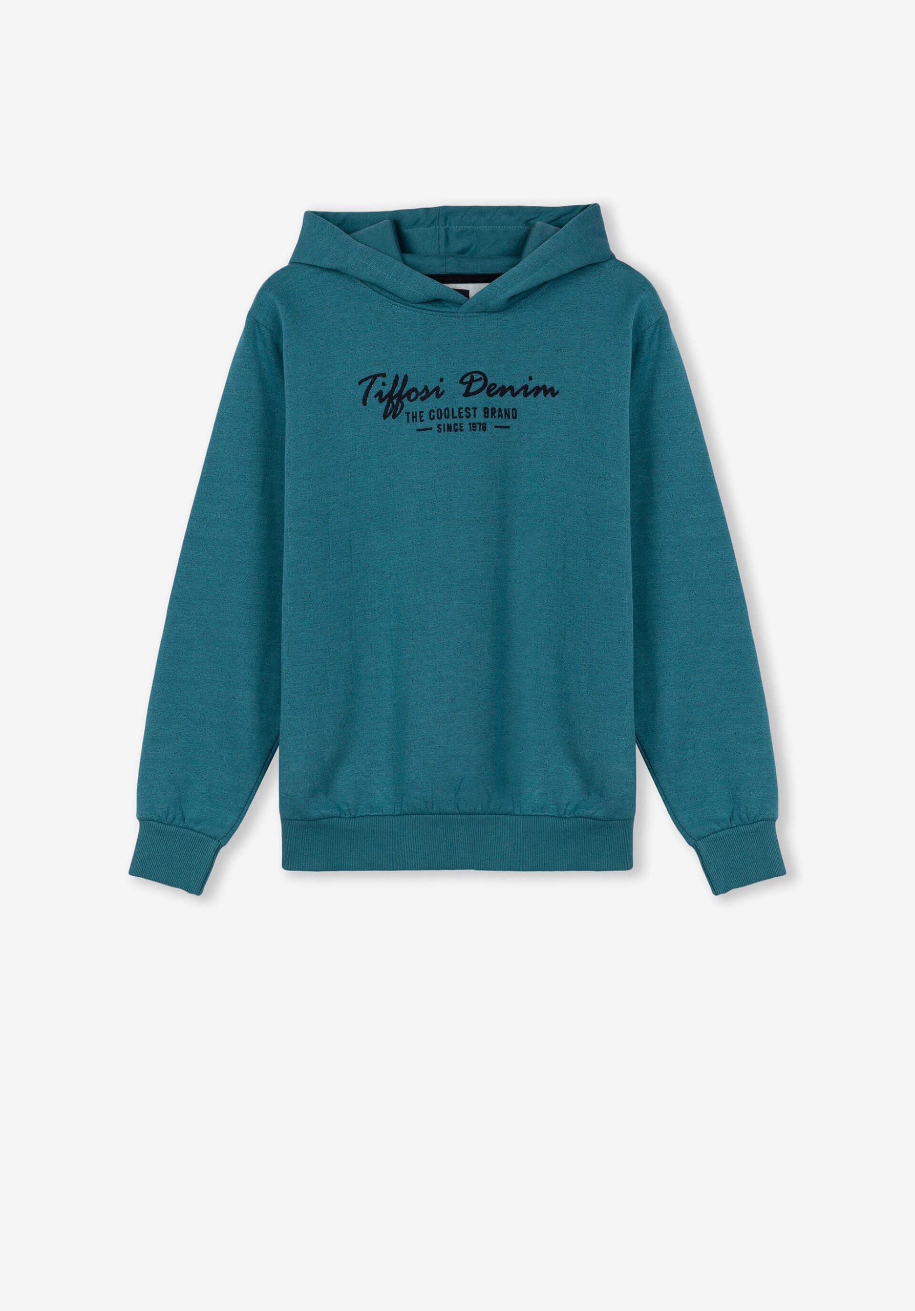Pense em silhuetas dos anos 80, painéis pesados, denim super skinny e estampas de bandana. Pois bem essa era voltou aos dias de hoje. Conhecida por seu estilo urbano e design incomum, a Tiffosi incorpora detalhes nativos portugueses. Assim é este hoodie azul indigo da Tiffosi. Tem decote redondo, capuz, bolso e manga comprida. Para parte de baixo combina na perfeição com jeans mas a dar com o tom. A imagem está no tamanho 9-10 anos /140 cm.