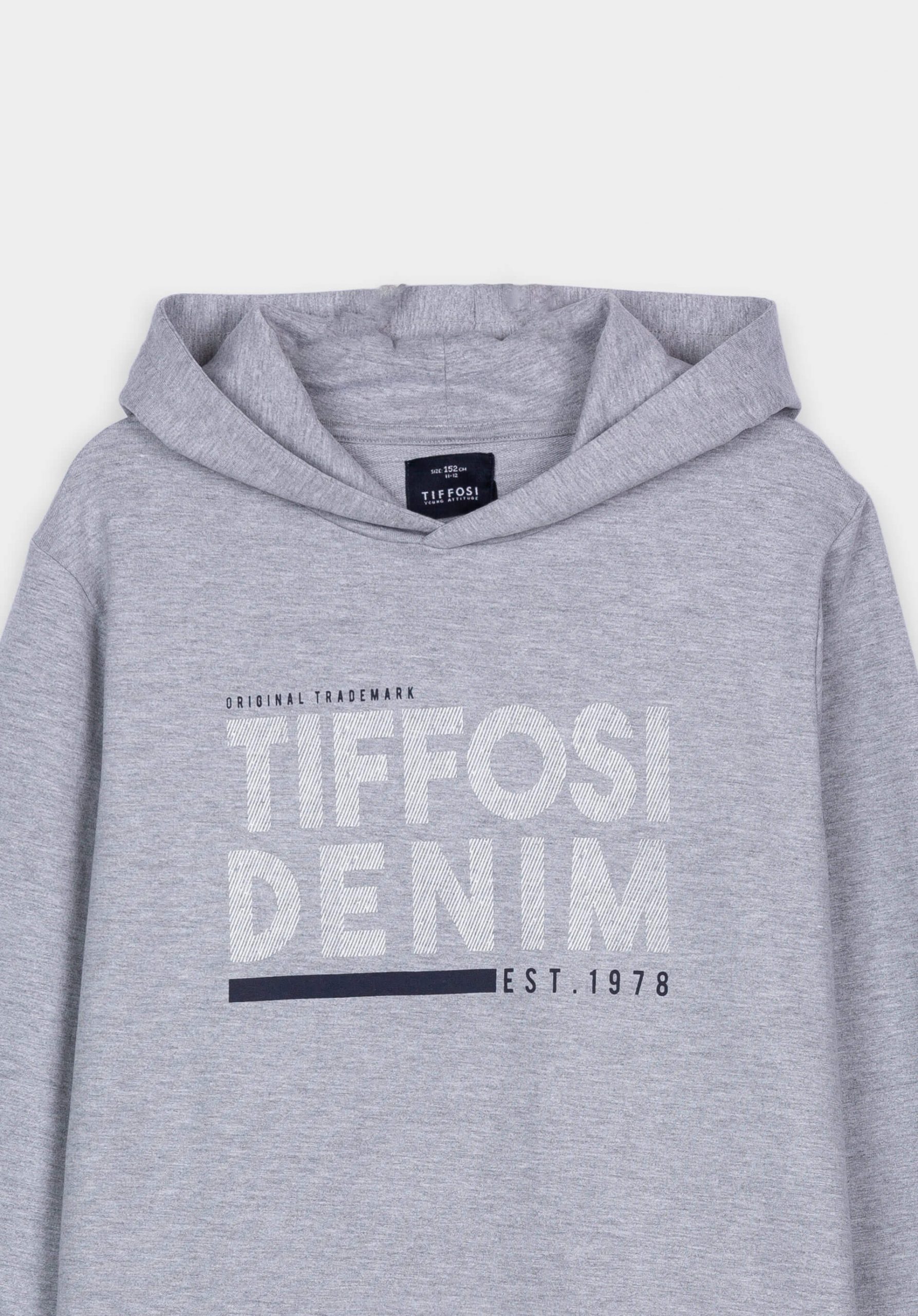 Conhecida por seu estilo urbano e design incomum, a Tiffosi incorpora detalhes inovadores. Combinados com silhuetas inspiradas em streetwear e uma estética jovial. Assim é este hoodie cinza claro c/ logo da Tiffosi. Texto com relevo. Para parte de baixo combina na perfeição com jeans, mas dentro do mesmo estilo. A imagem está no tamanho 9-10 anos / 140 cm.