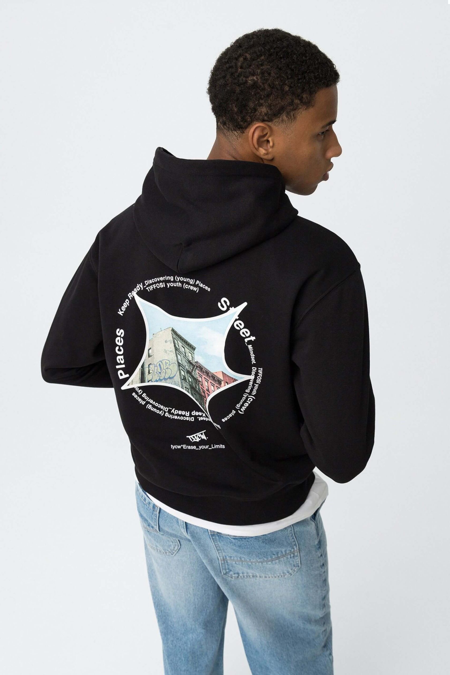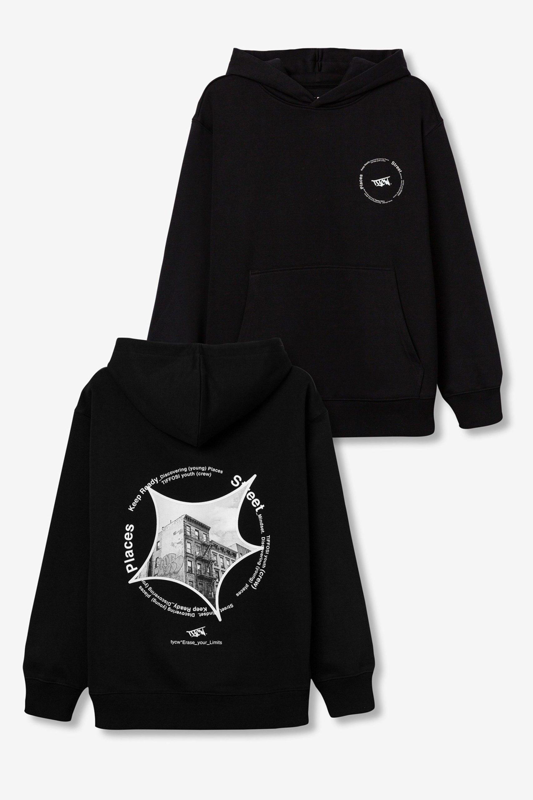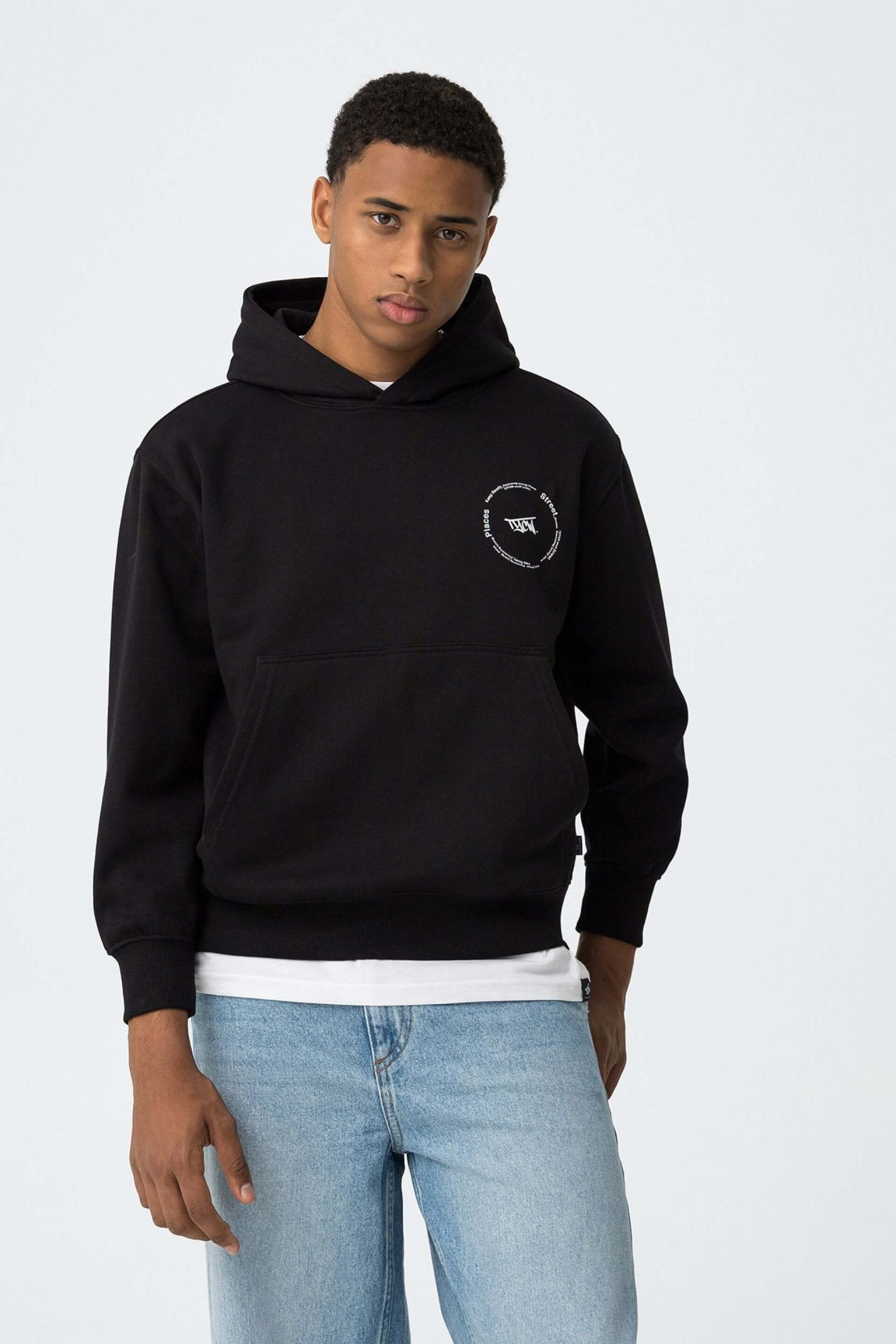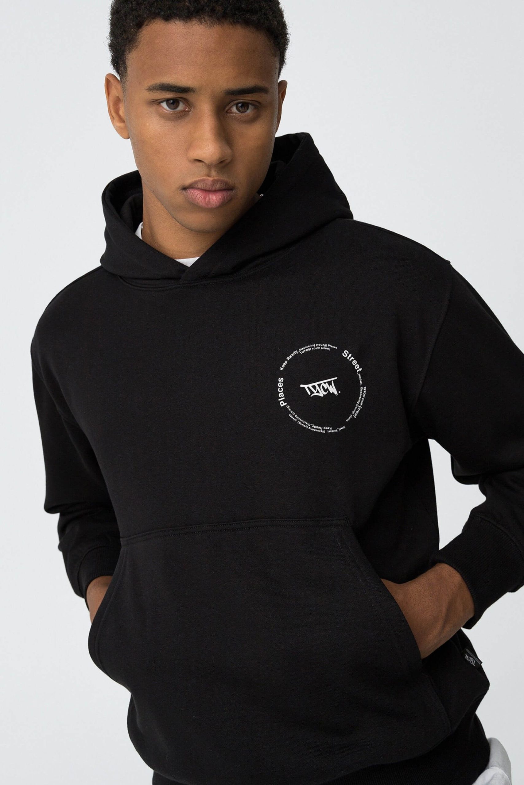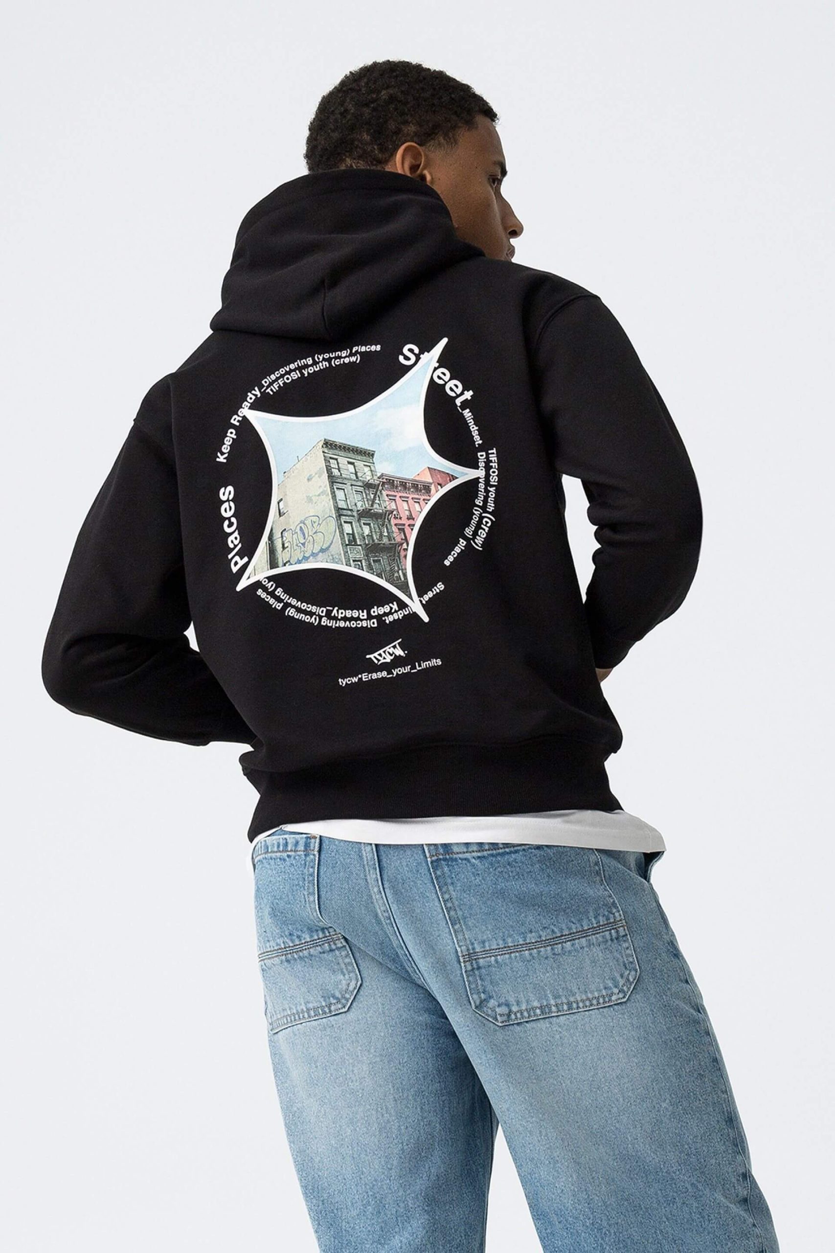 Conhecida por seu estilo urbano e design incomum, a Tiffosi incorpora detalhes inovadores. Combinados com silhuetas inspiradas em streetwear e uma estética jovial. Assim é este hoodie preto c/ estampa na costa da Tiffosi. Tem decote redondo com capuz e manga comprida. Para parte de baixo combina na perfeição com jeans, mas dentro do mesmo estilo. A imagem está no tamanho M / 164 cm.