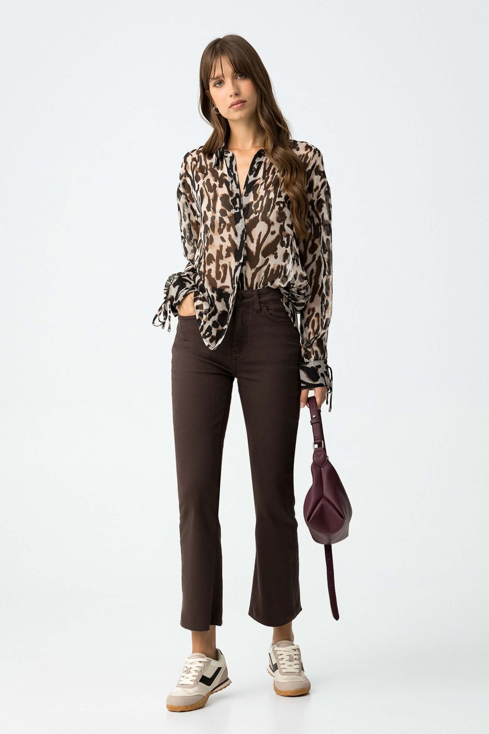 Pense em silhuetas dos anos 80, painéis pesados, denim super skinny e estampas de bandana. Pois bem essa era voltou aos dias de hoje. Assim são estes jeans castanhas da Tiffosi. Apresenta corte com 5 bolsos, botão no cós e fecho. Para parte de cima combina na perfeição com t-shirt mas a dar com o tom. A manequim está a vestir o tamanho 34.