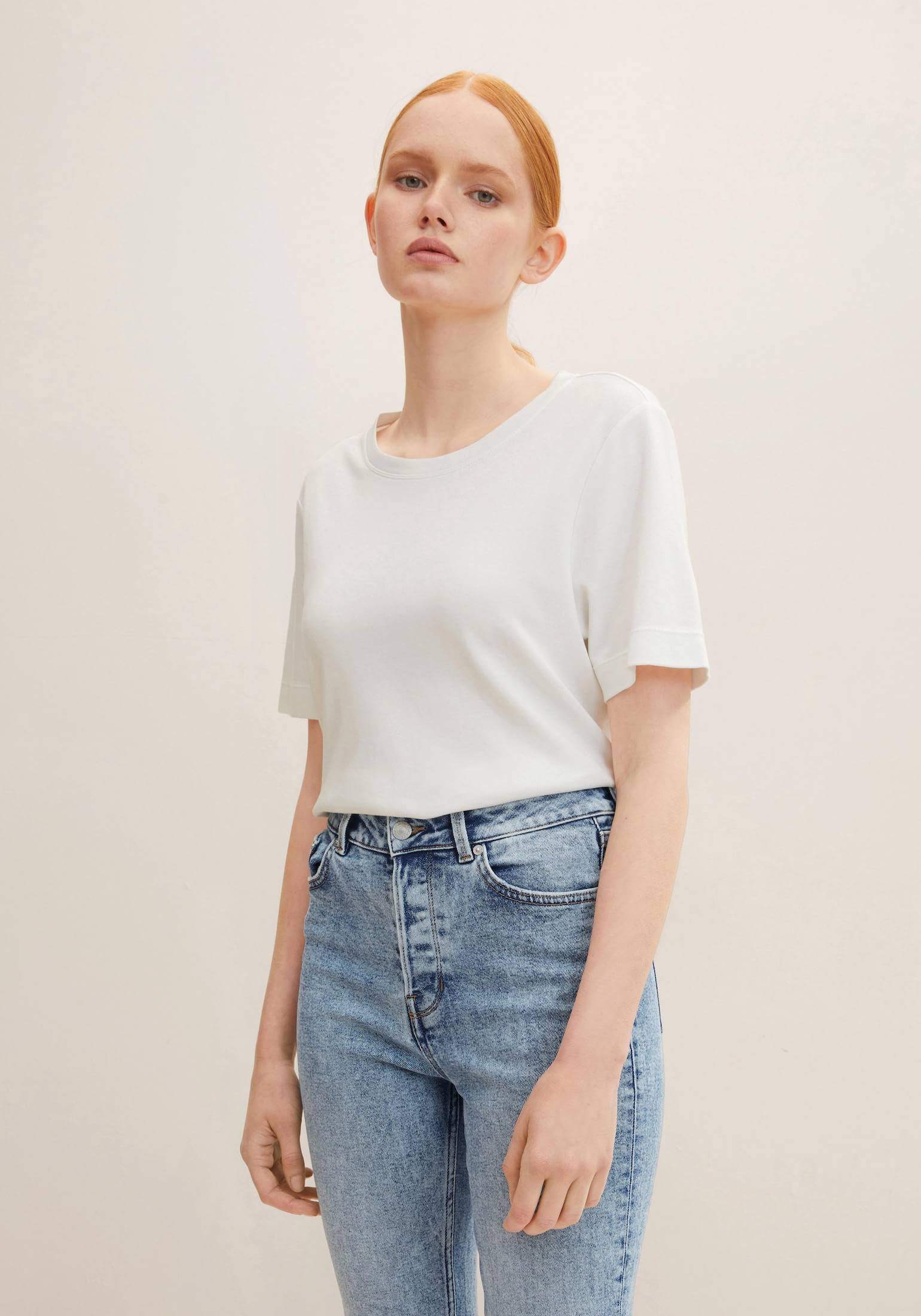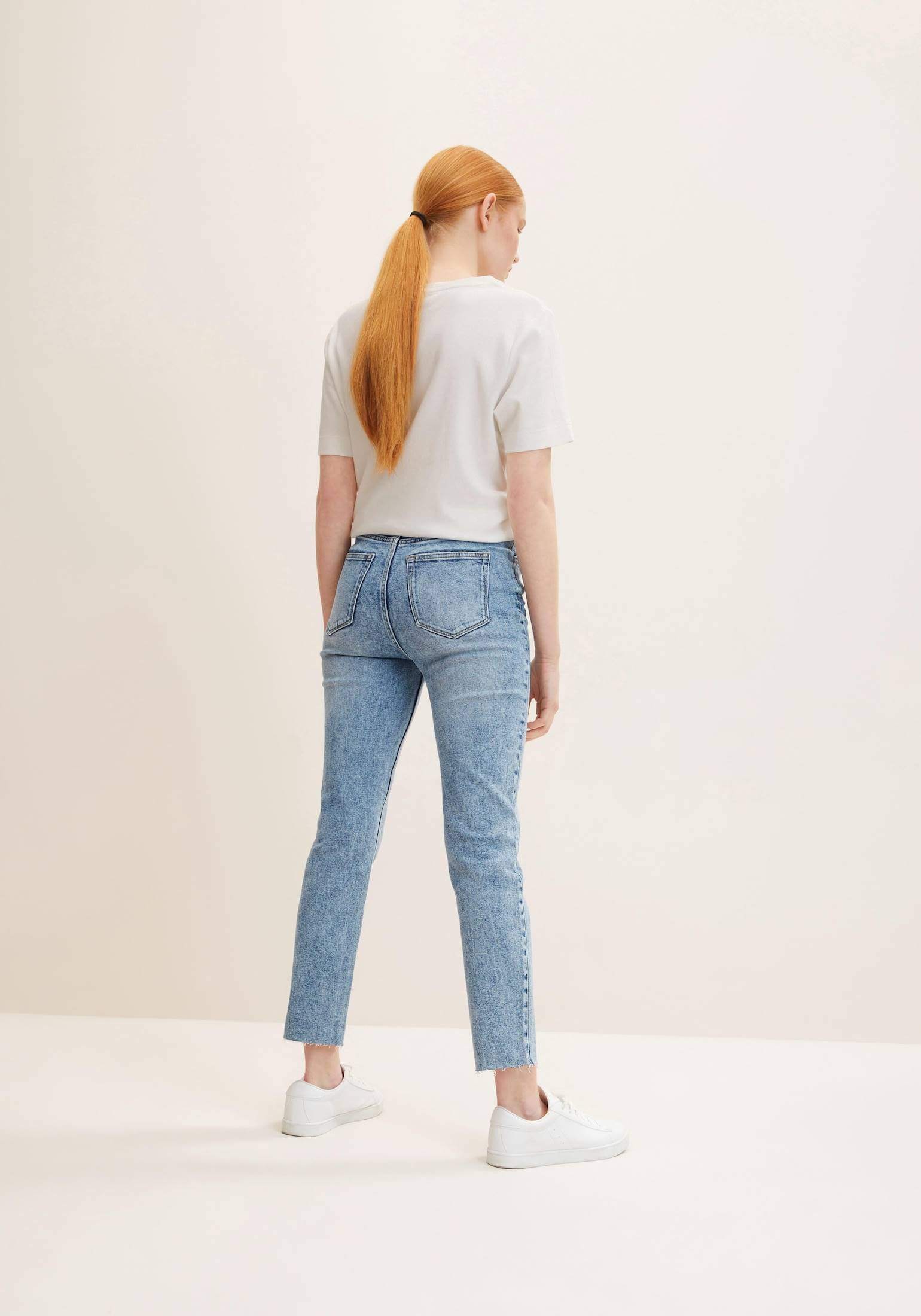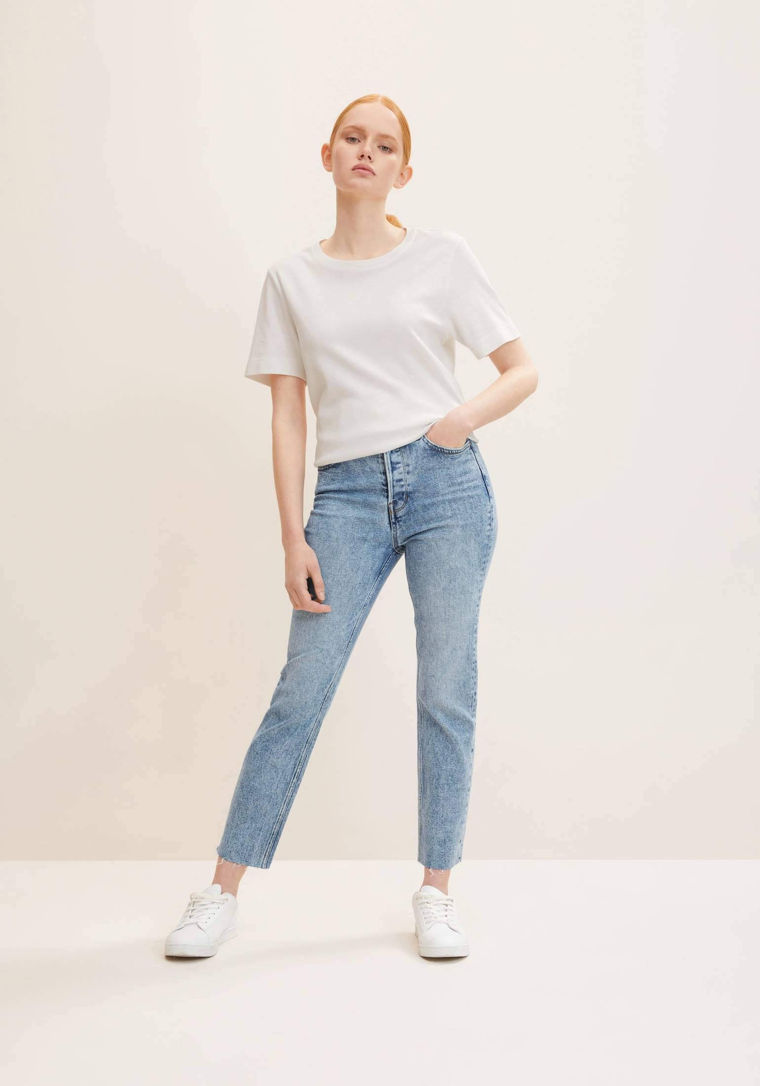 Conhecida por seu estilo urbano e design incomum, a Tom Tailor incorpora detalhes inovadores. Combinados com silhuetas inspiradas em streetwear e uma estética jovial. Assim são estes jeans claros da Tom Tailor. Apresenta corte com cinco bolsos, tem botões no cós e na breguilha. Para parte de cima combina na perfeição com casaco de ganga, mas dentro do mesmo estilo. A modelo está a vestir o tamanho 36.