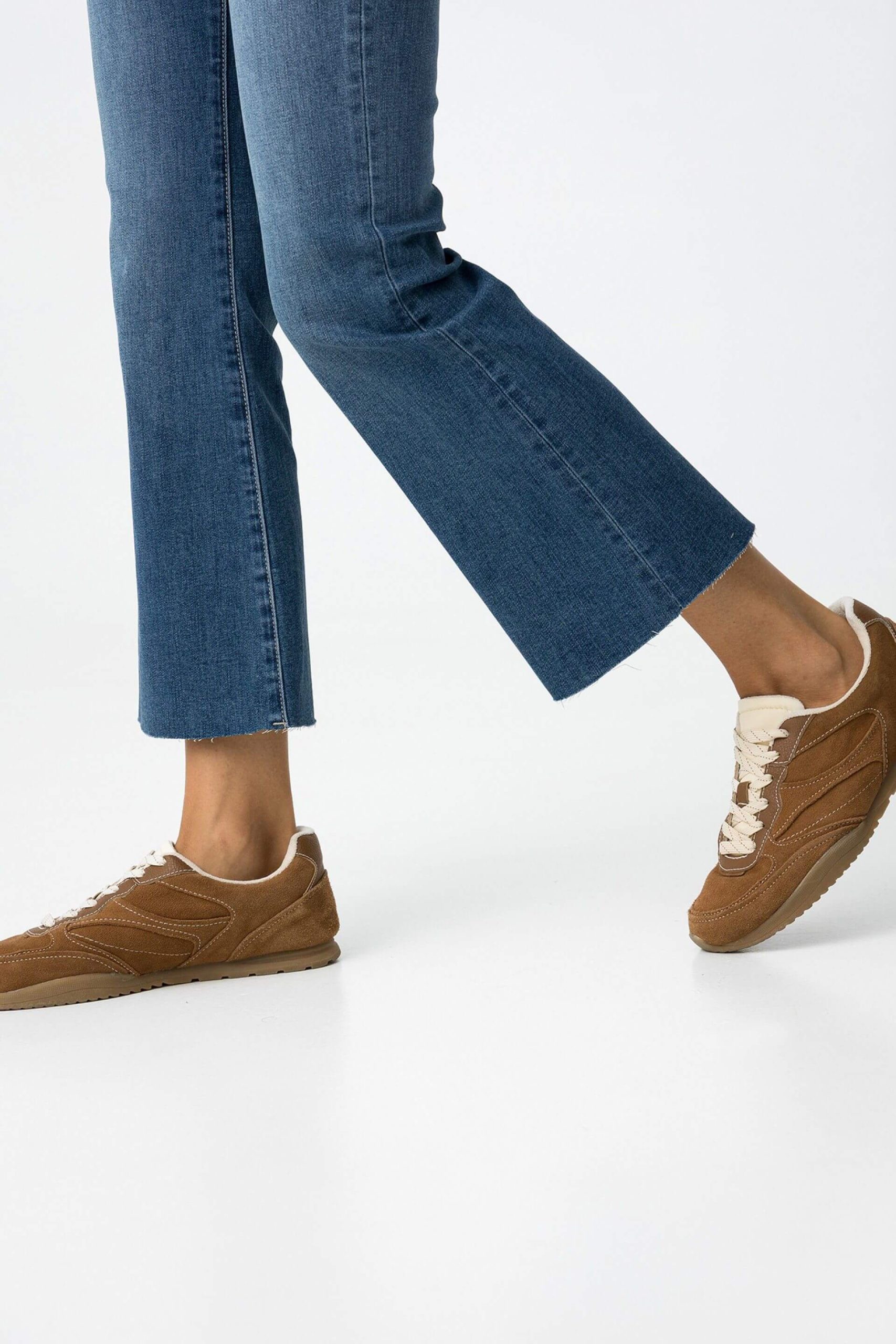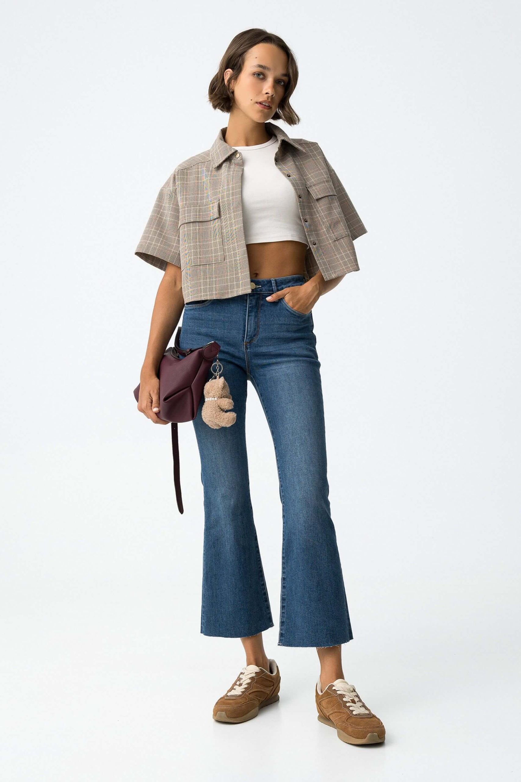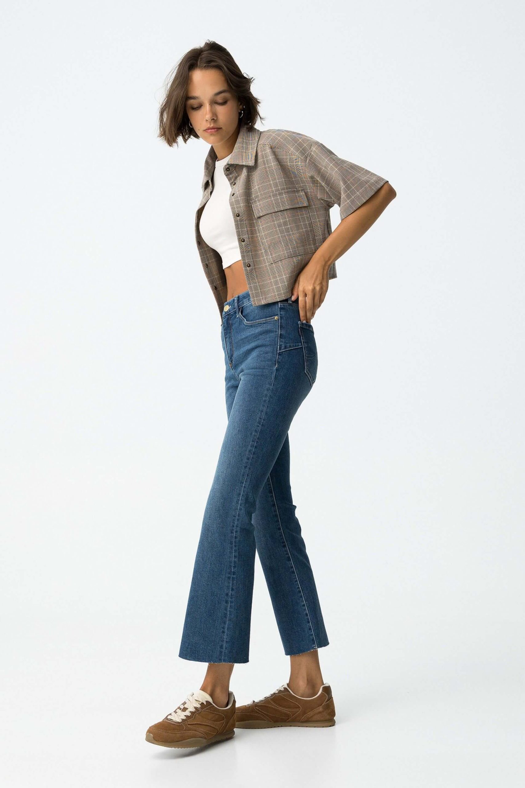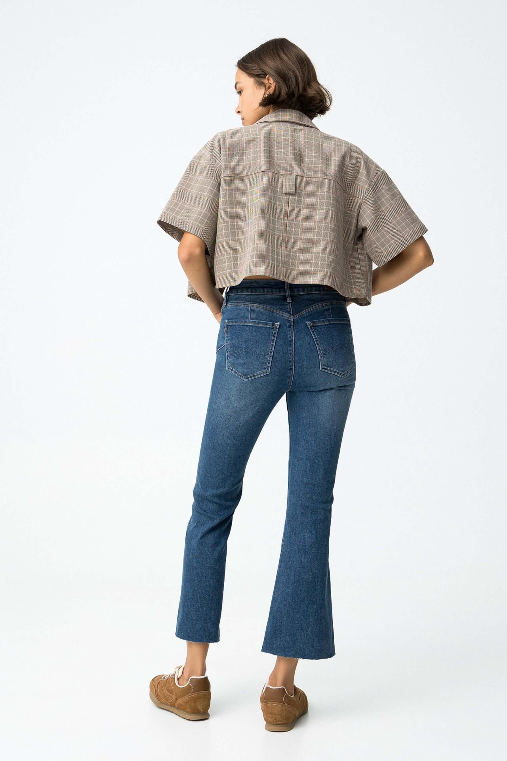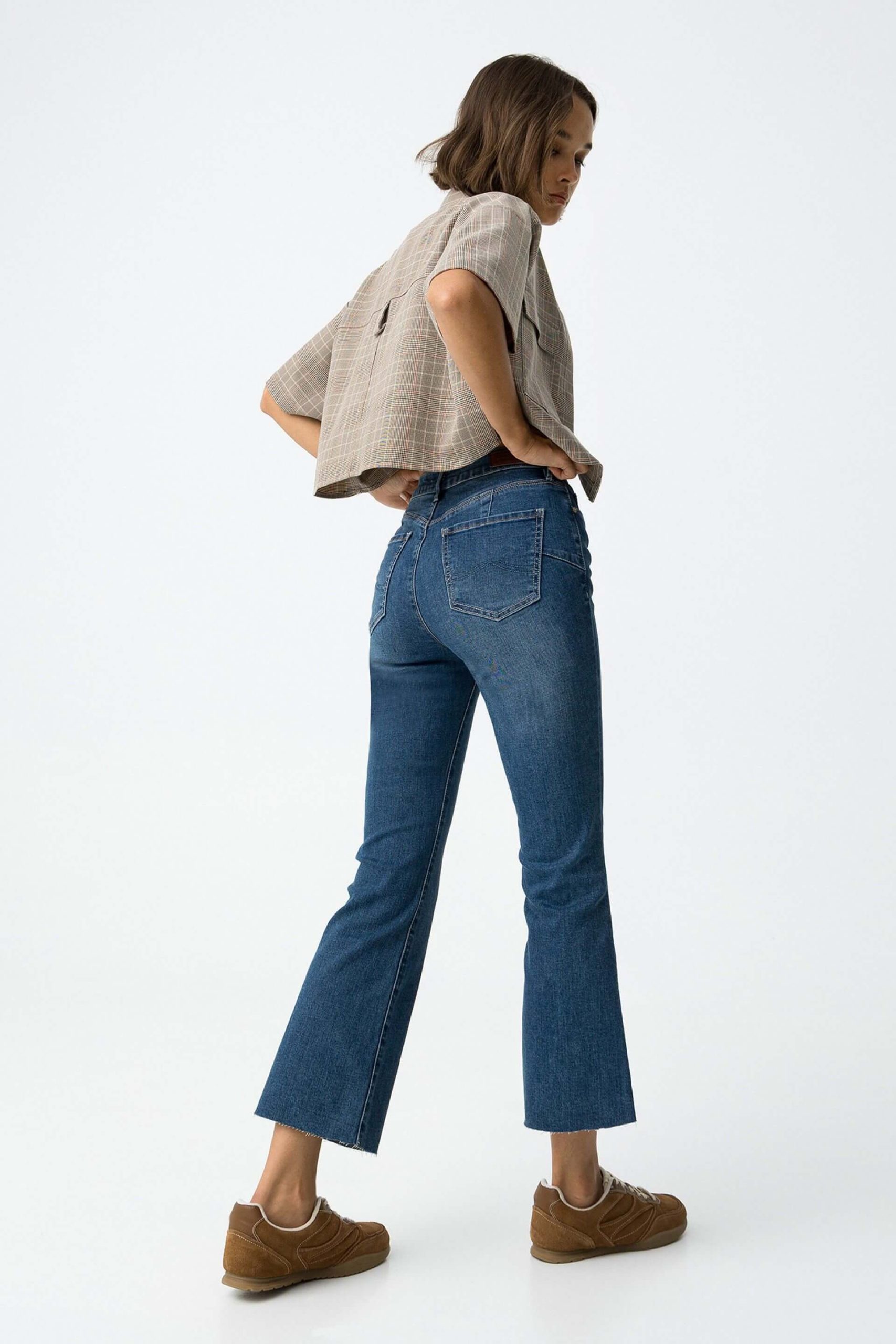 Pense em silhuetas dos anos 80, painéis pesados, denim super skinny e estampas de bandana. Pois bem essa era voltou aos dias de hoje. Assim são estes jeans médio push up boca de sino da Tiffosi. Apresenta corte com 5 bolsos, botão no cós e fecho. Para parte de cima combina na perfeição com t-shirt mas a dar com o tom. A manequim está a vestir o tamanho 34.