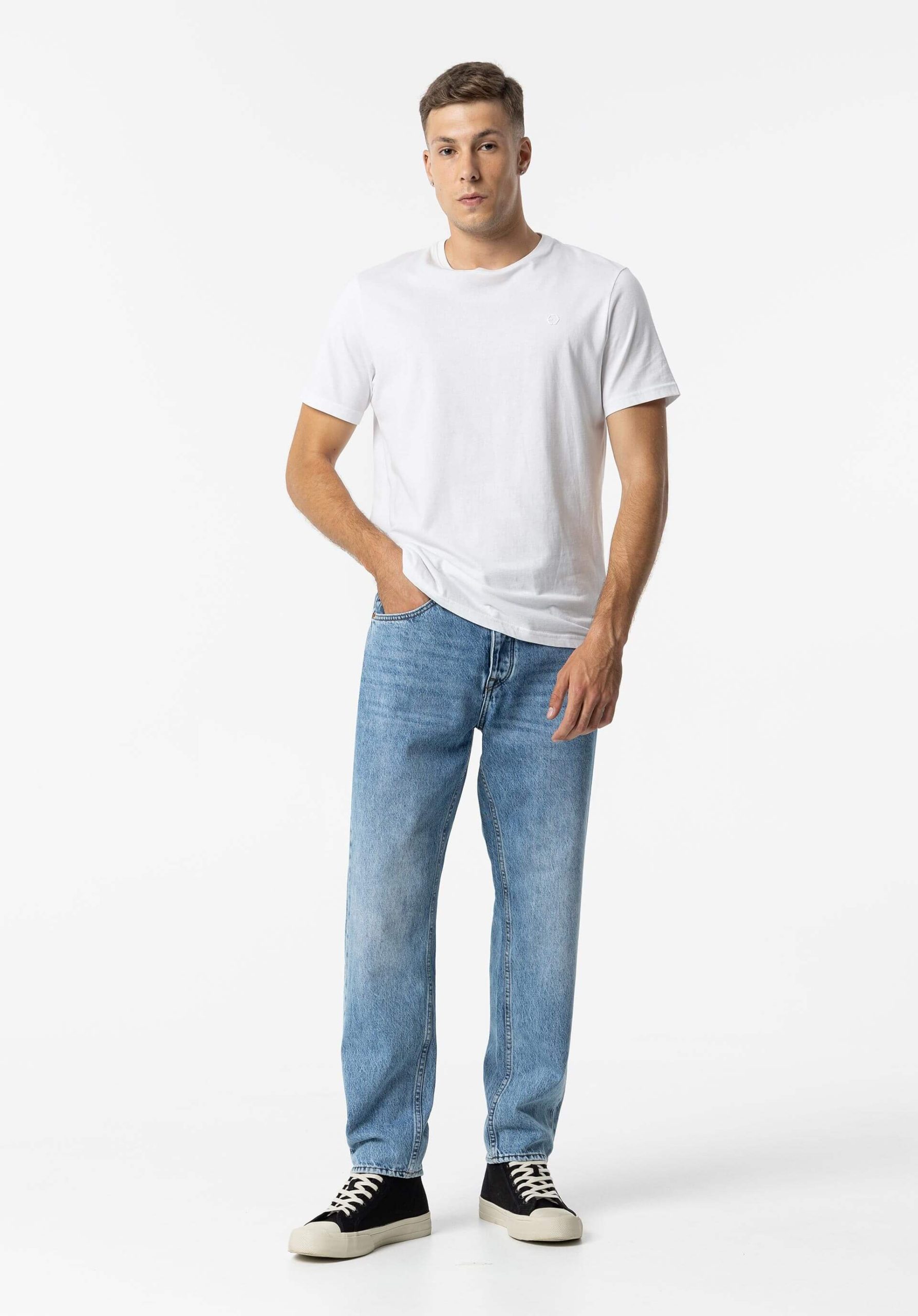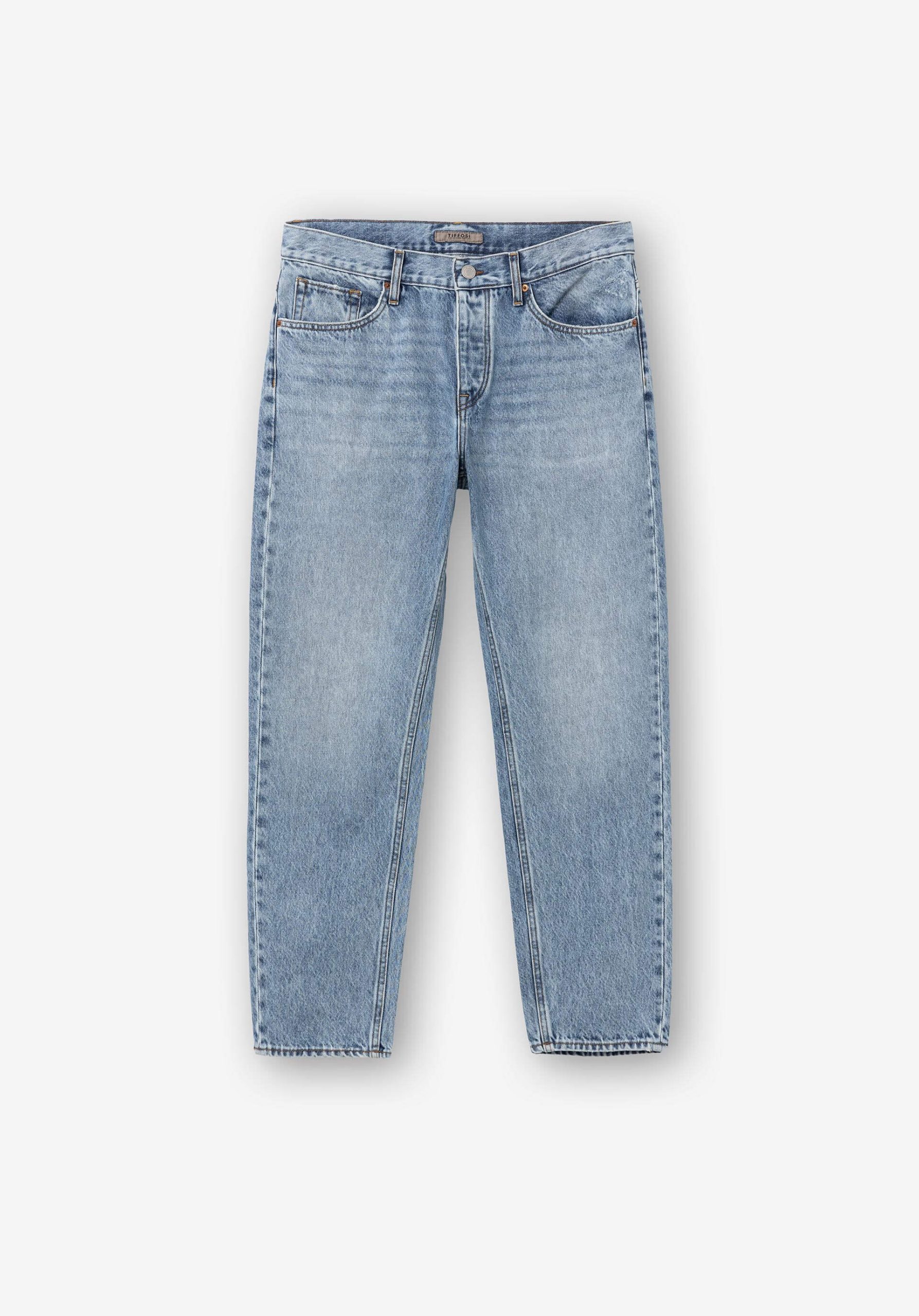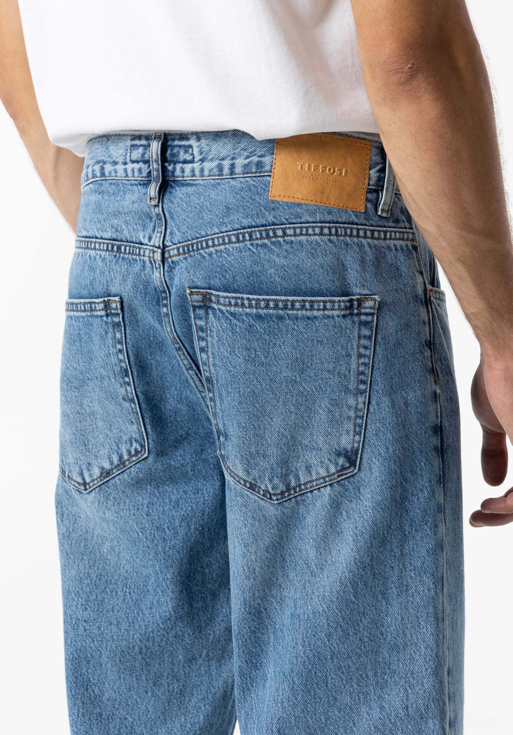 Conhecida por seu estilo urbano e design incomum, a Tiffosi incorpora detalhes inovadores. Combinados com silhuetas inspiradas em streetwear e uma estética jovial. Assim são estes jeans relaxed fit da Tiffosi. Tem corte com 5 bolsos. Para parte de cima combina na perfeição com camisa, mas dentro do mesmo estilo. O modelo está a vestir o 38.