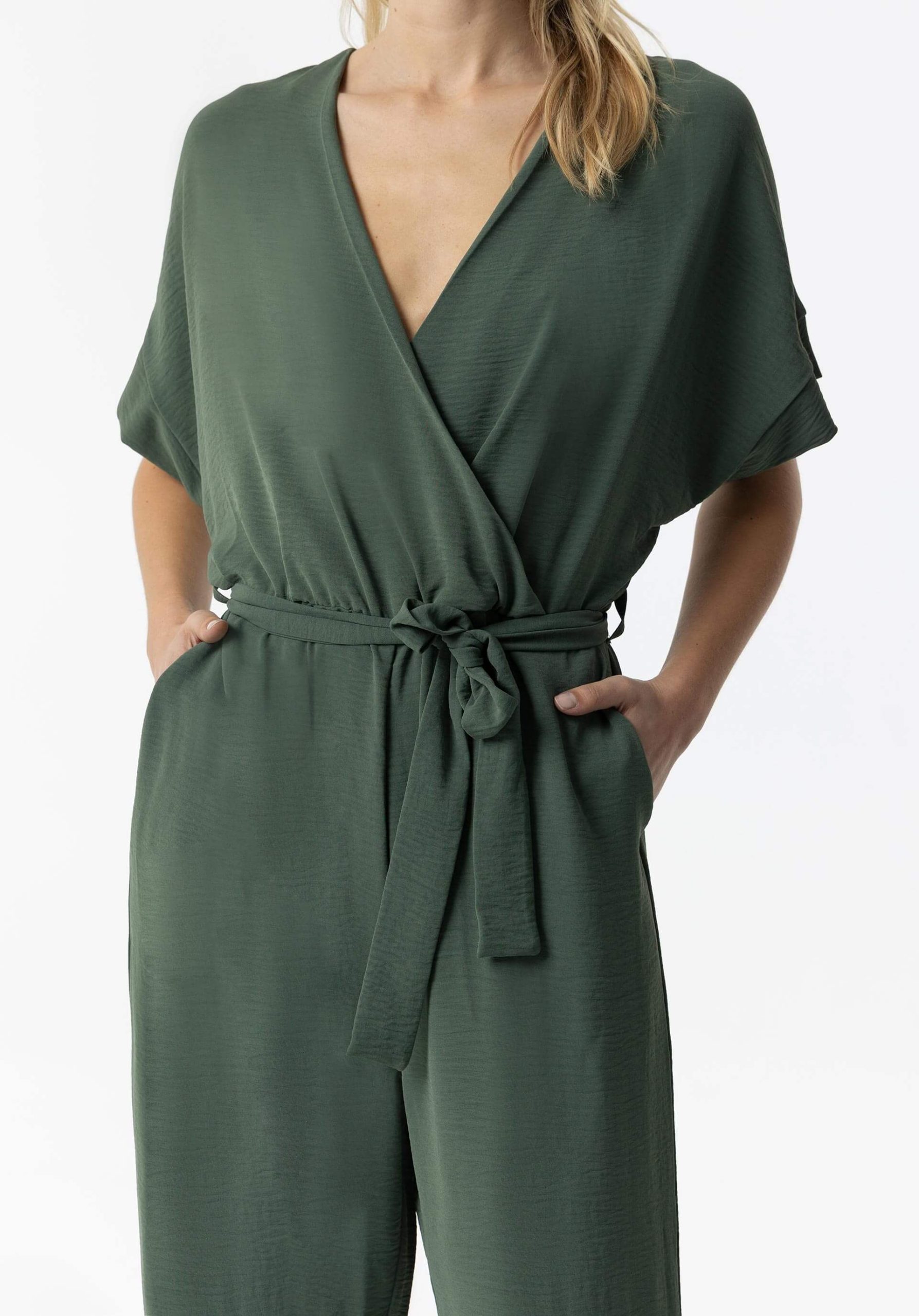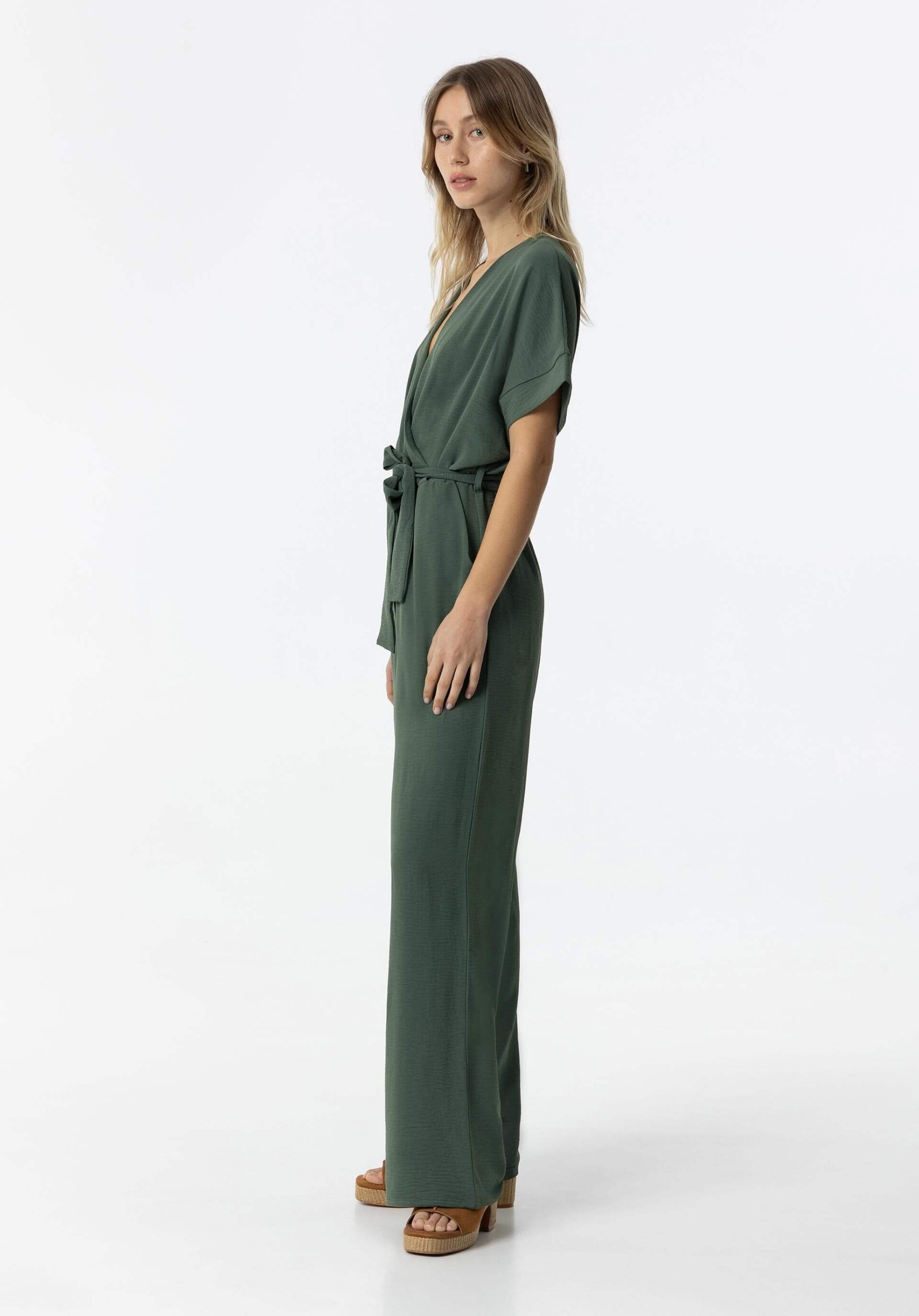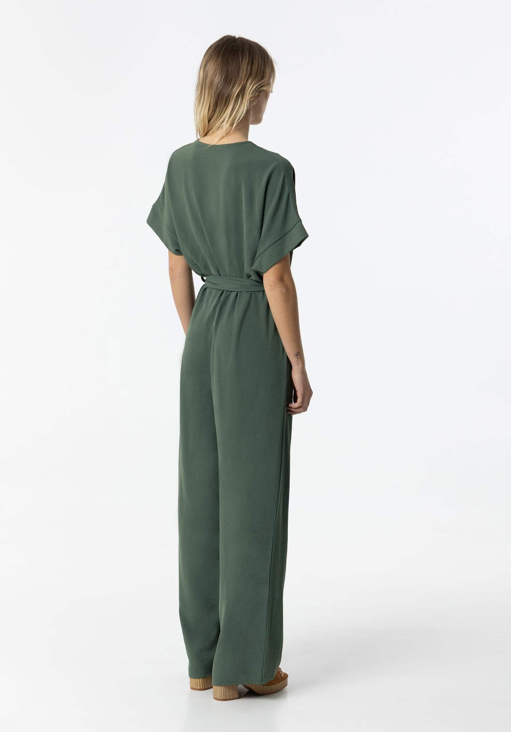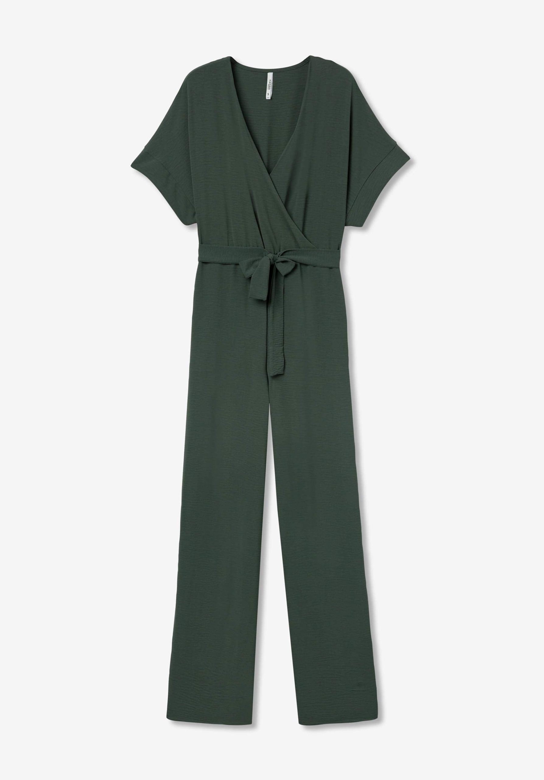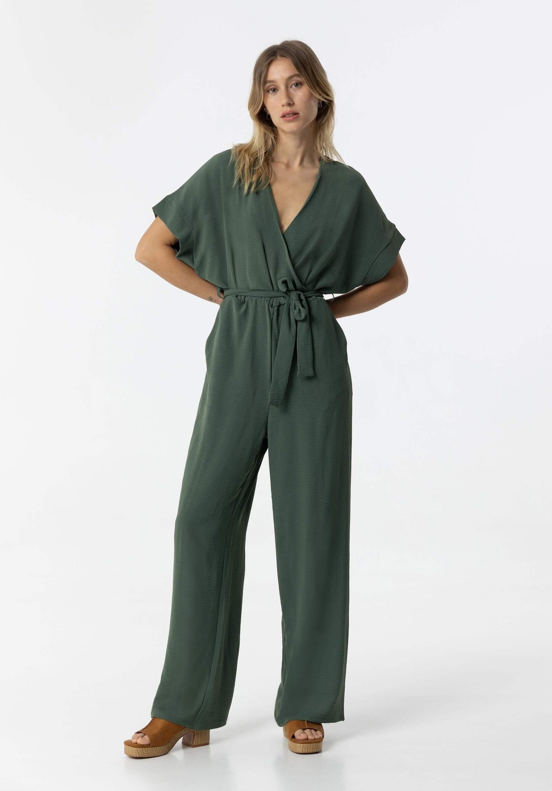 Pense em silhuetas dos anos 80, painéis pesados, denim super skinny e estampas de bandana. Pois bem essa era voltou aos dias de hoje. Assim é este jumpsuit verde traçado da Tiffosi. Apresenta decote em bico traçado, manga curta e cinto. Para parte de baixo combina na perfeição com sandálias mas a dar com o tom. A manequim está a vestir o tamanho S.