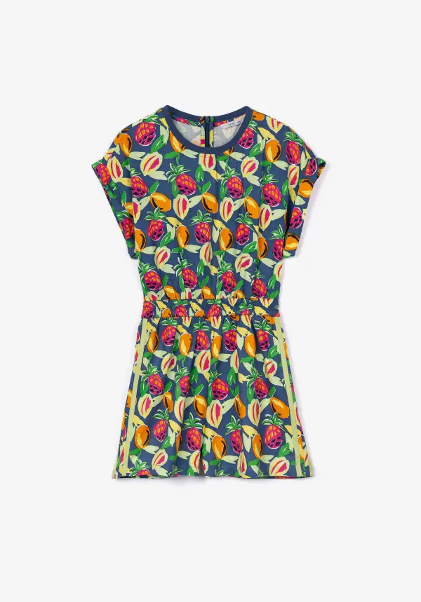 Pense em silhuetas dos anos 80, painéis pesados, denim super skinny e estampas de bandana. Pois bem essa era voltou aos dias de hoje. Conhecida por seu estilo urbano e design incomum, a Tiffosi incorpora detalhes nativos portugueses. Assim é este macaquinho c/ print frutas da Tiffosi. Tem decote redondo, fecho na costa e manga curta. Para parte de cima combina na perfeição com casaco mas a dar com o tom. A imagem está no tamanho 9-10 anos /140 cm.
