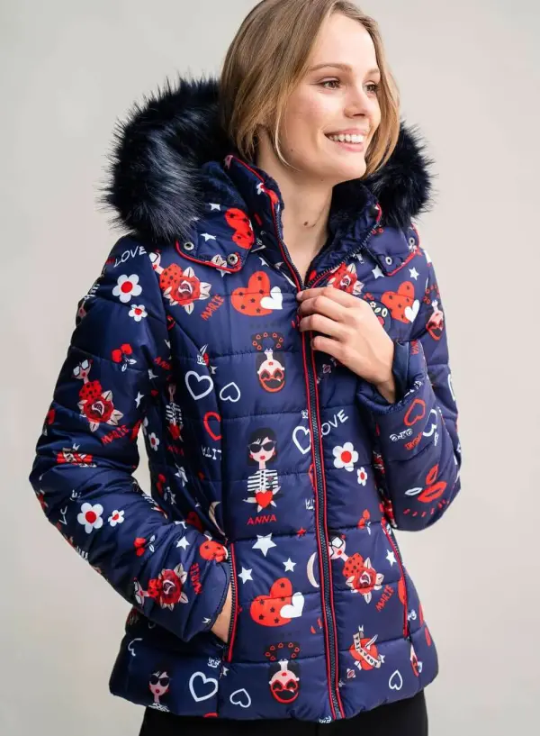 Rosalita é uma marca espanhola para mulheres que dão importância aos detalhes, aos pormenores, bordados, mistura de cores e padrões. O selo da Rosalita McGee oferece opções inspiradas em desenhos abstractos, a mais recente coleção da marca, produziu uma seleção forte de roupas com prints exóticos e amorosos. Assim é esta parka love print com capuz da Rosalita McGee. Produzida em tela acolchoada de poliéster. Tem bolsos metidos com fecho de massa, manga comprida. Tem capuz com pelo na bainha e fecho massa na frente. Combina bem em cima de camisa mas dentro do mesmo estilo. A modelo está a vestir o tamanho S.