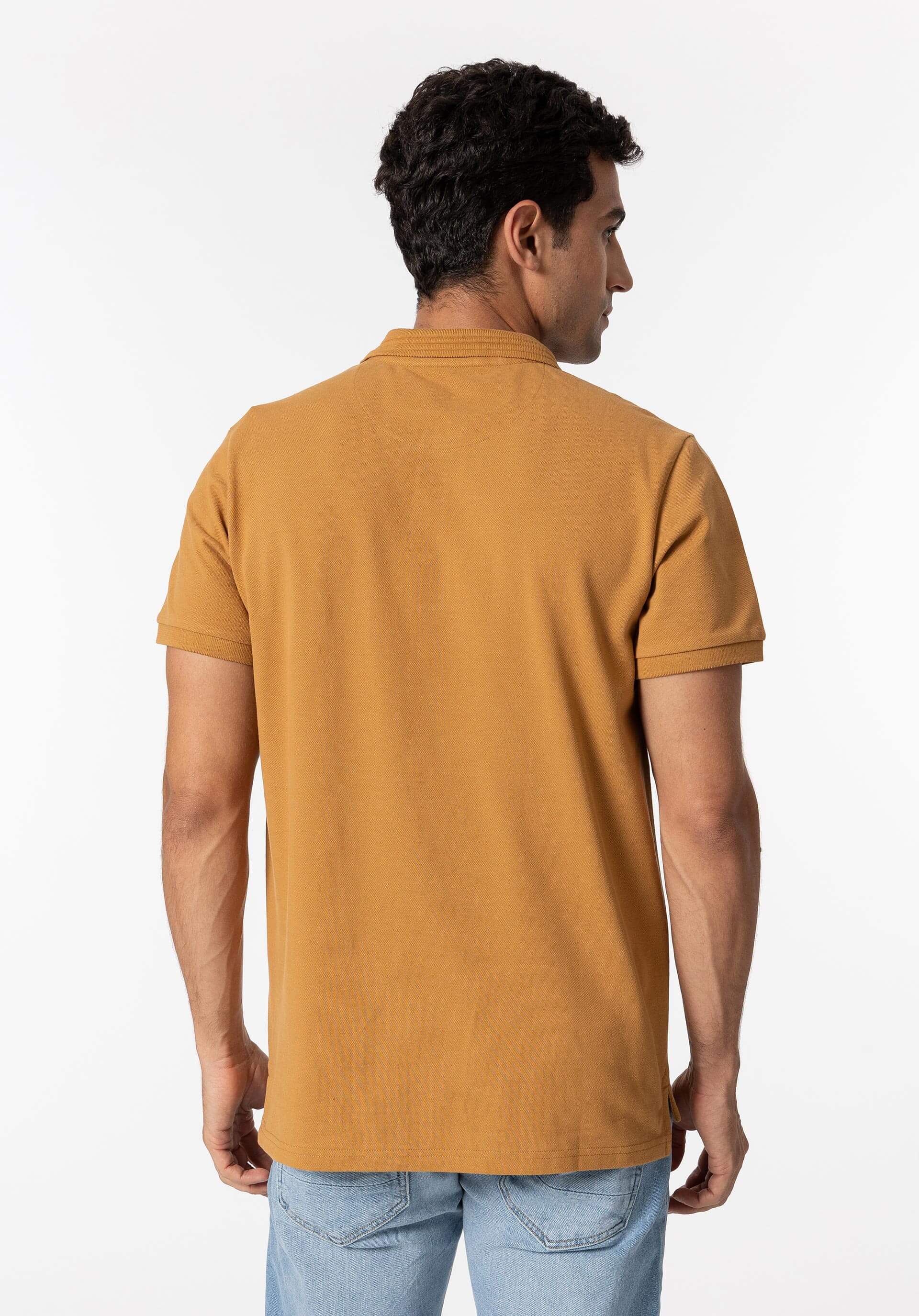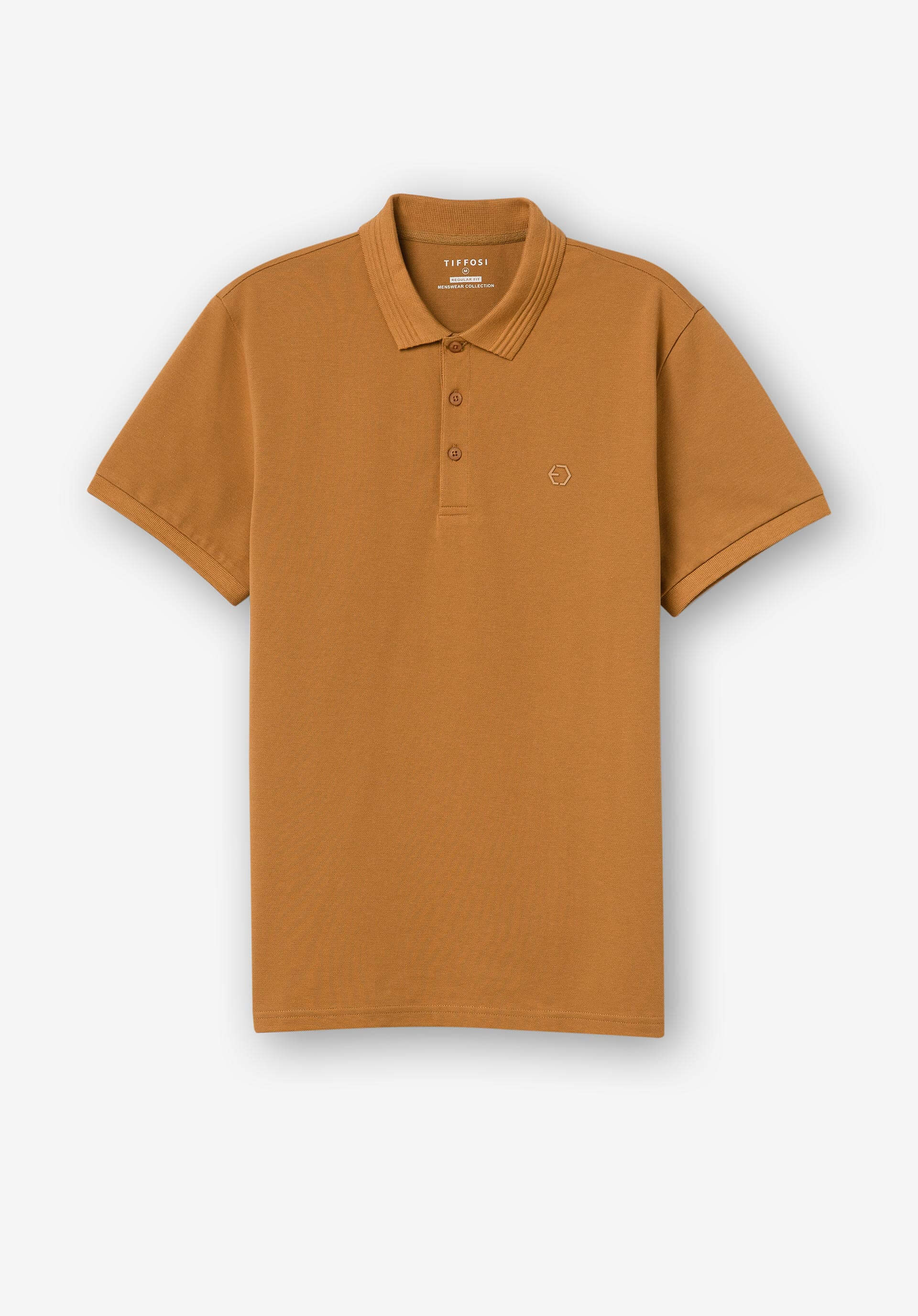 Conhecida por seu estilo urbano e design incomum, a Tiffosi incorpora detalhes inovadores. Combinados com silhuetas inspiradas em streetwear e uma estética jovial. Assim é este polo amarelo torrado da Tiffosi. Tem manga curta, gola e carcela com três botões. Para parte de baixo combina na perfeição com jeans, mas dentro do mesmo estilo. O modelo está a vestir o M.