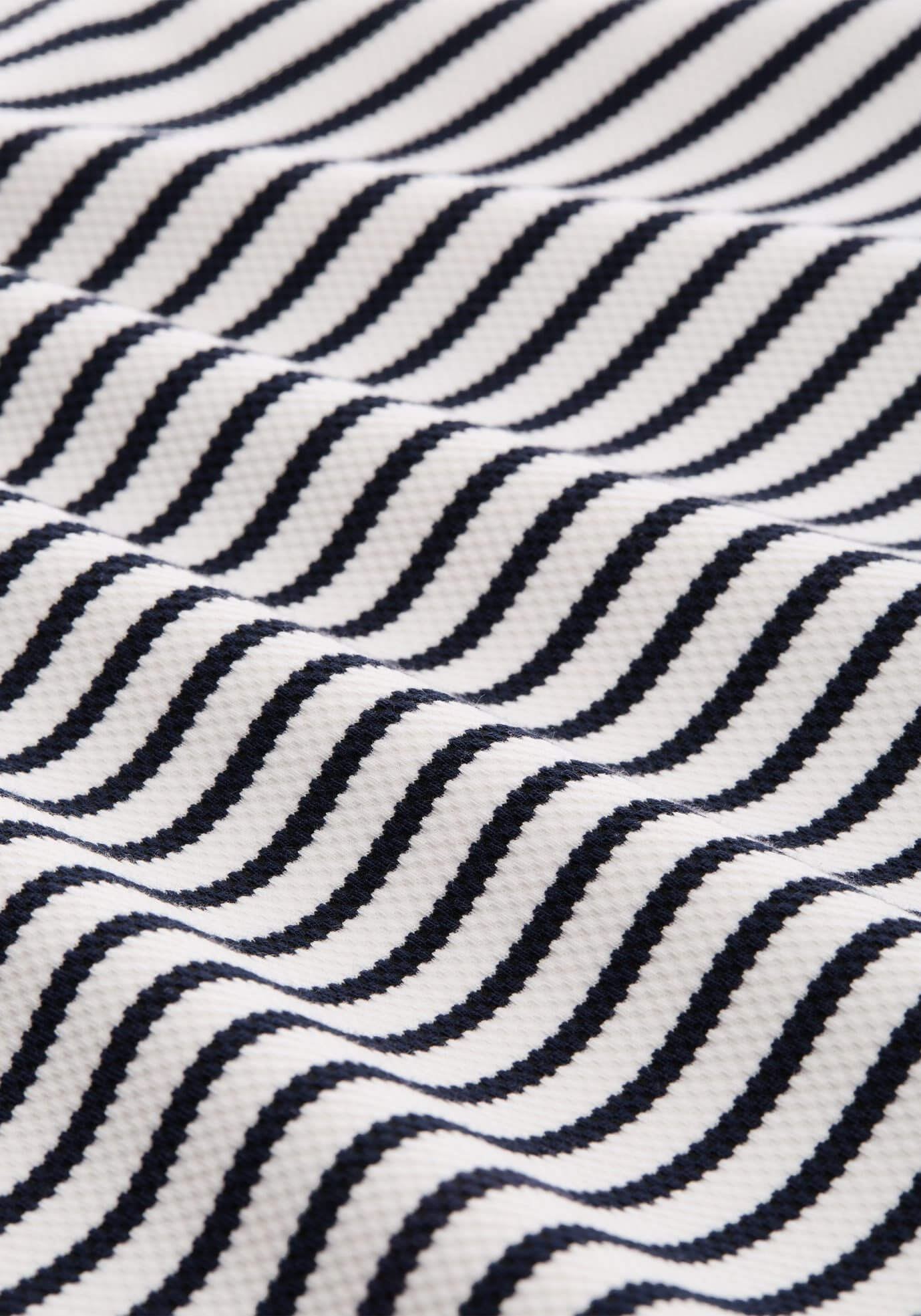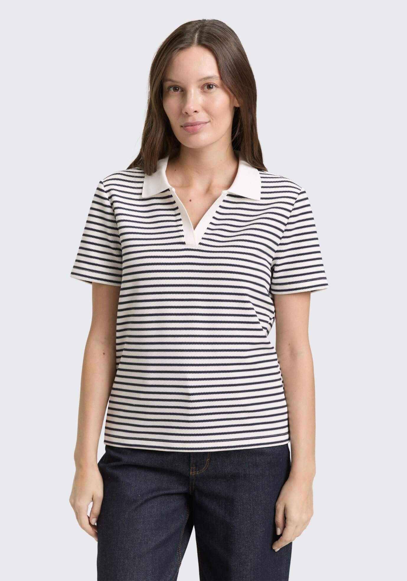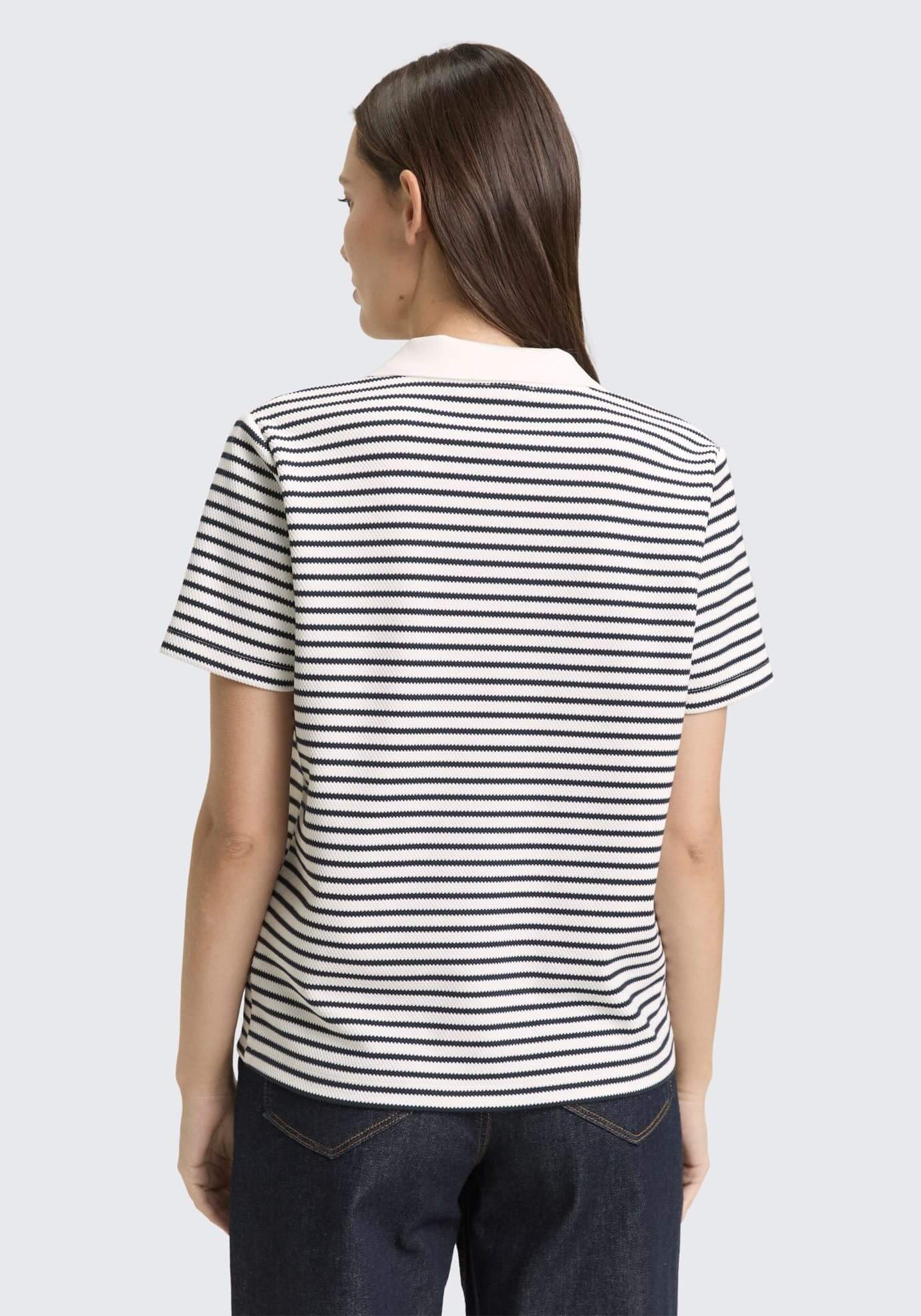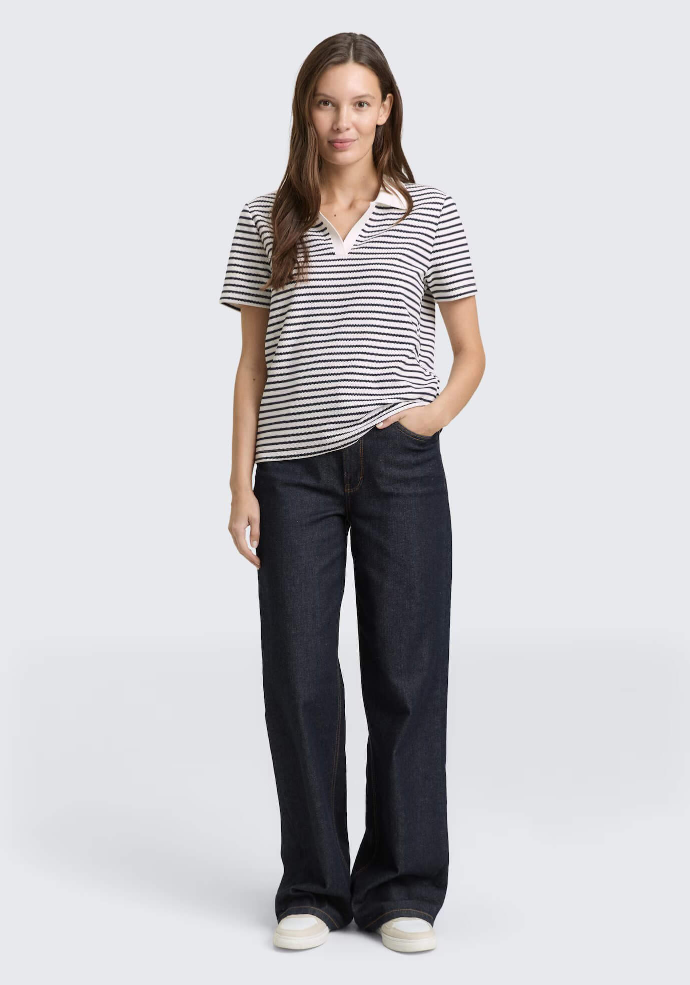 Conhecida por seu estilo urbano e design incomum, a Tom Tailor incorpora detalhes inovadores. Combinados com silhuetas inspiradas em streetwear e uma estética jovial. Assim é este polo azul c/ riscas da Tom Tailor. Apresenta gola de bico e manga curta. Para parte de baixo combina na perfeição com calça, mas dentro do mesmo estilo. A modelo está a vestir o tamanho S.