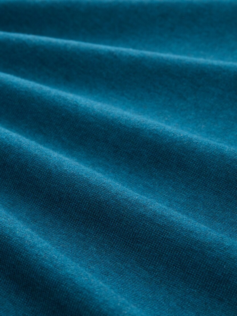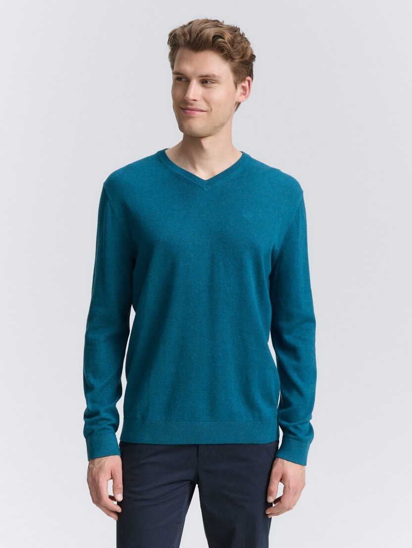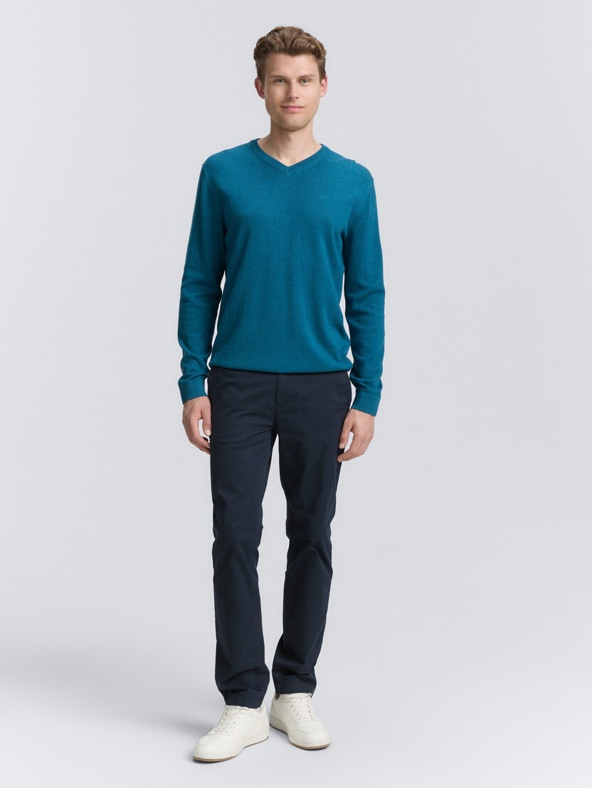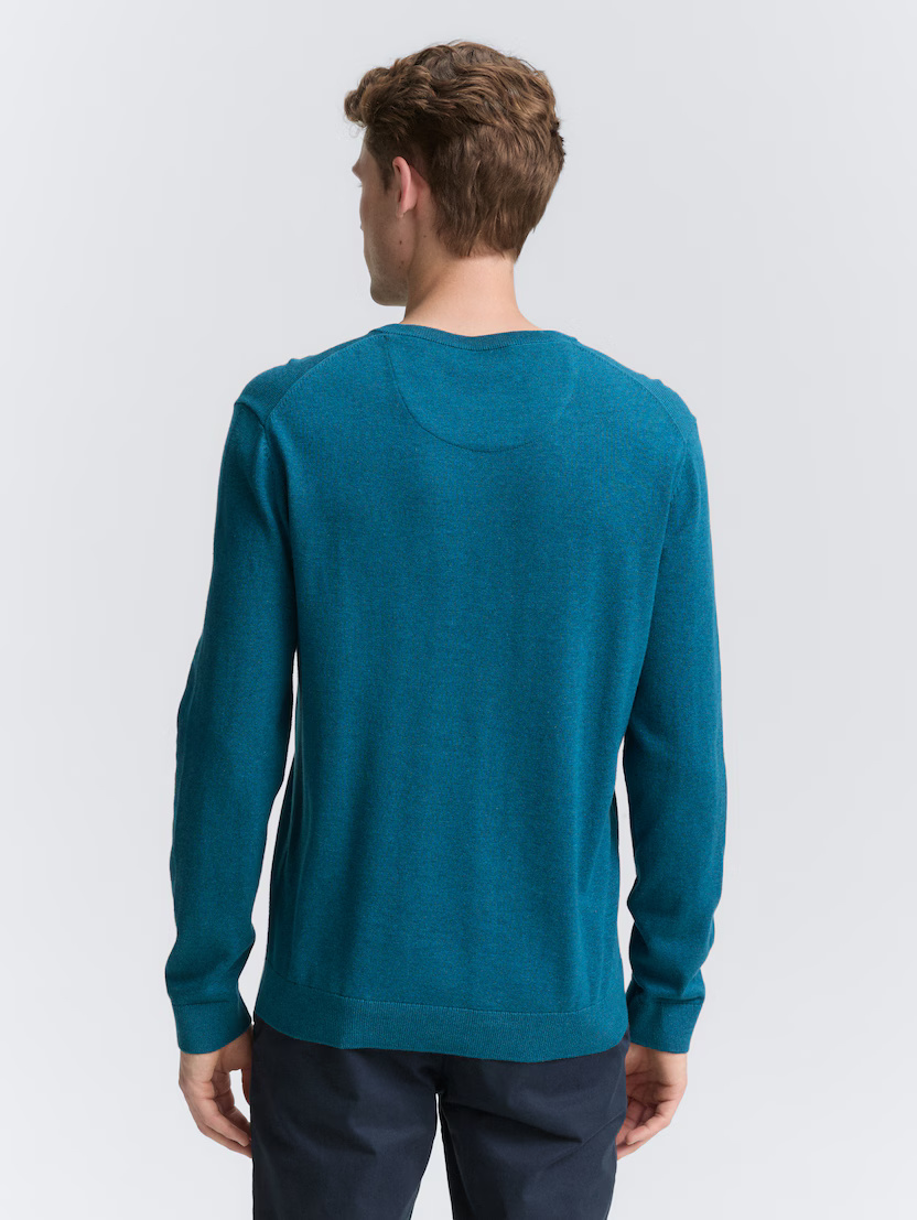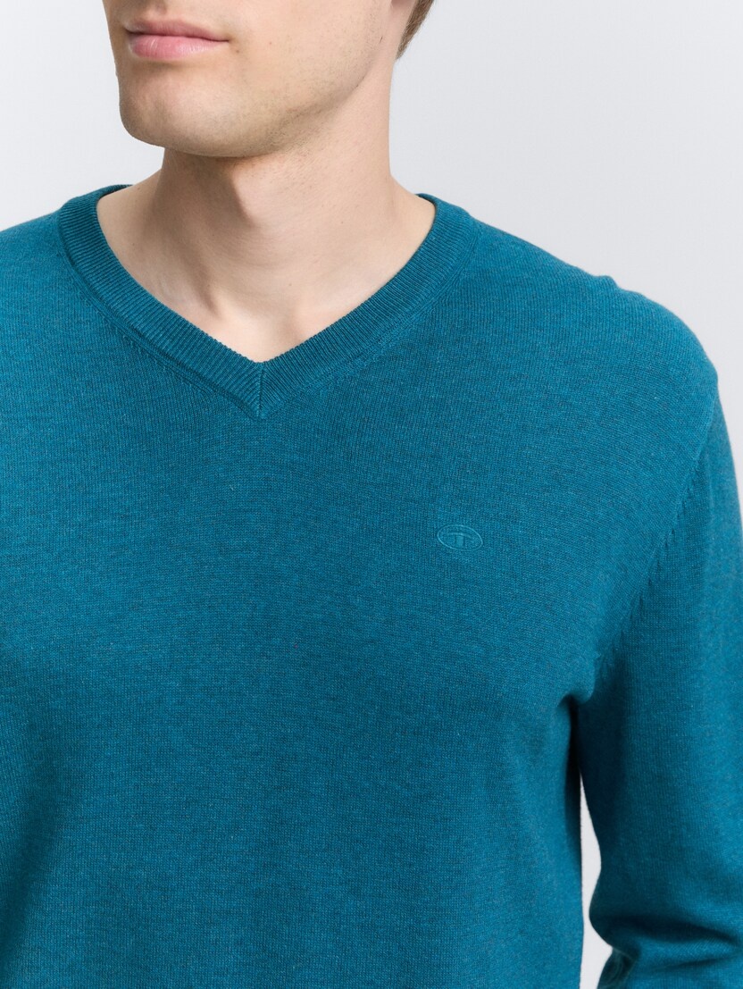 Conhecida por seu estilo urbano e design incomum, a Tom Tailor incorpora detalhes inovadores. Combinados com silhuetas inspiradas em streetwear e uma estética jovial. Assim é este pullover azul médio da Tom Tailor. Apresenta mangas compridas e decote em bico. Para parte de baixo combina na perfeição com jeans, mas dentro do mesmo estilo. O modelo está a vestir o tamanho S.