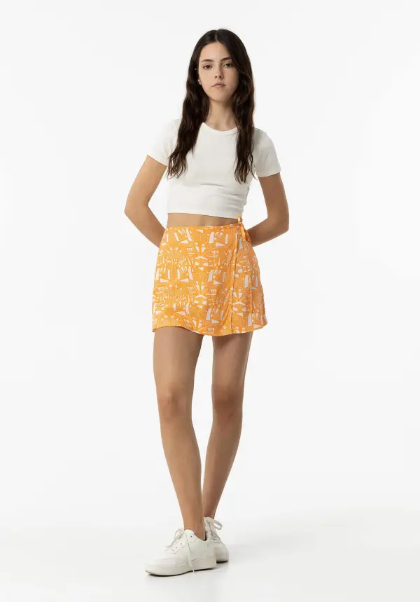 Pense em silhuetas dos anos 80, painéis pesados, denim super skinny e estampas de bandana. Pois bem essa era voltou aos dias de hoje. Conhecida por seu estilo urbano e design incomum, a Tiffosi incorpora detalhes nativos portugueses. Assim é esta saia / calção laranja da Tiffosi. Tem elástico no cós e atilho na frente. Para parte de cima combina na perfeição com casaco mas a dar com o tom. A imagem está no tamanho XS /152 cm.