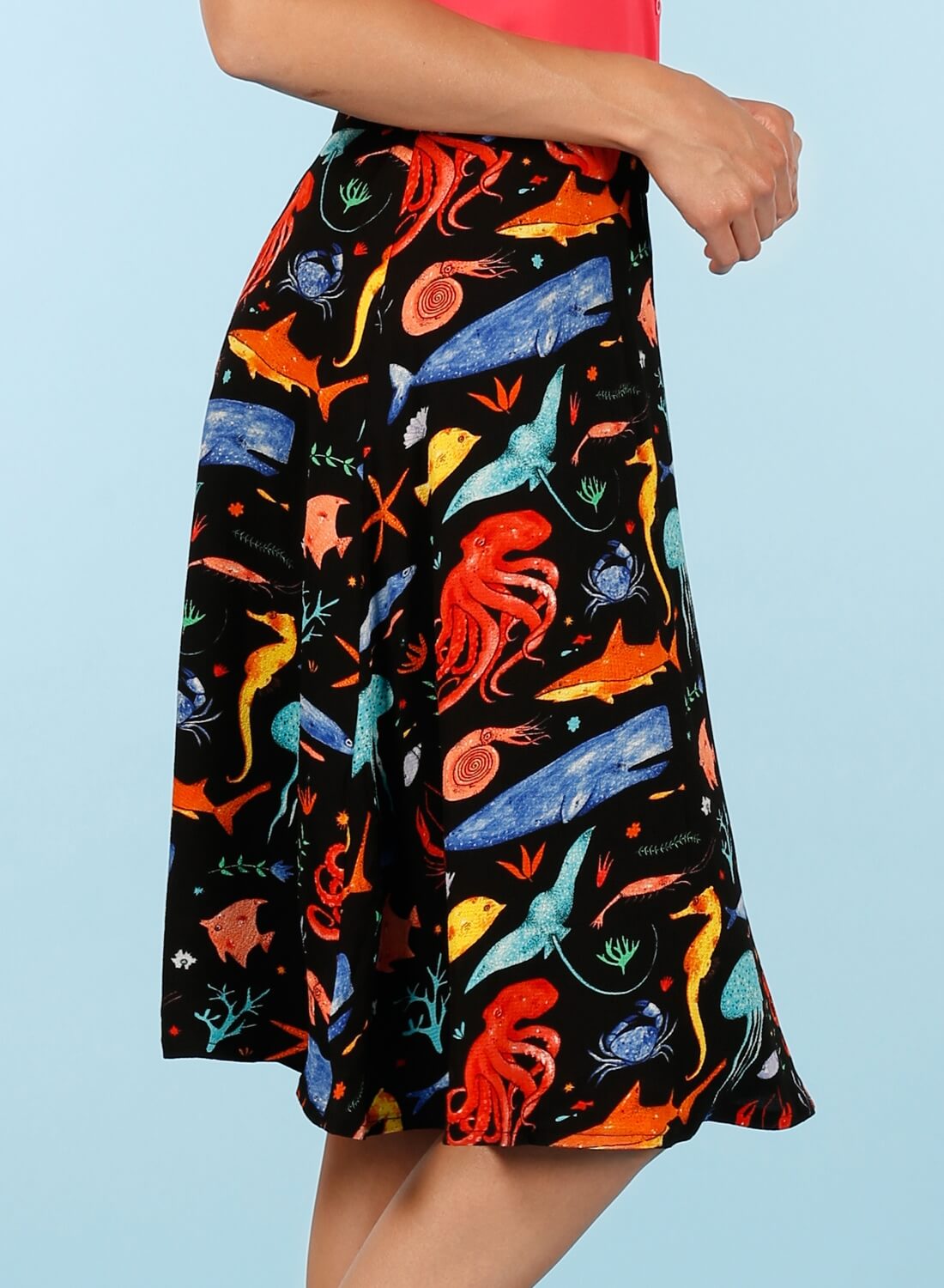 Carregada do espírito alegre dos anos setenta, a casa de moda Minueto combina o romantismo com a feminilidade. Pois prova que a marca vive de telas com formas arrojadas prints únicos e extravagantes. Elaborada em tela de poliéster, assim é esta saia com print animais marinhos. Tem vários cortes ao alto, cos virado para fora e com um comprimento pelo joelho. O fundo é preto e os animais marinhos como os tubarões, mantas, polvos, entre outros, são de várias cores. A parte de trás é lisa com fecho invisível de correr. Pode combinar com sapatilhas e camisa lisa para cima. A manequim está a vestir o tamanho S.