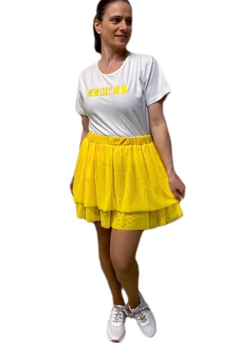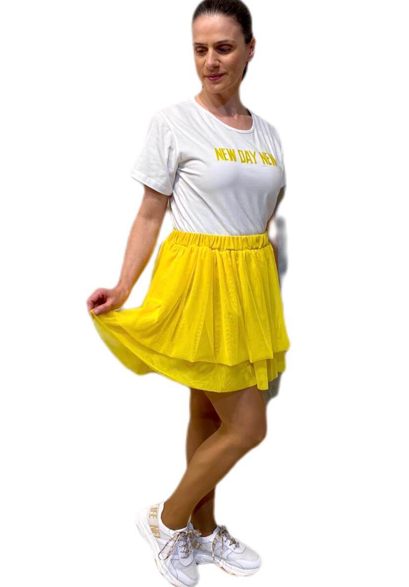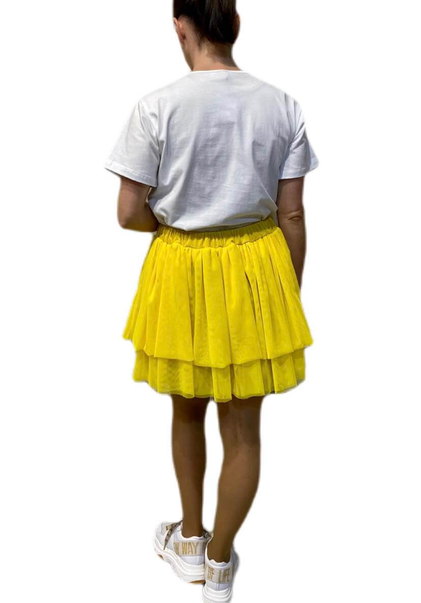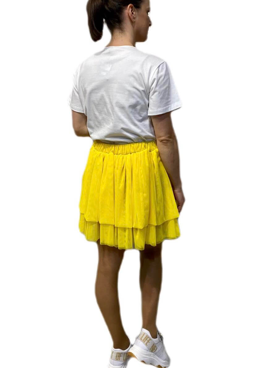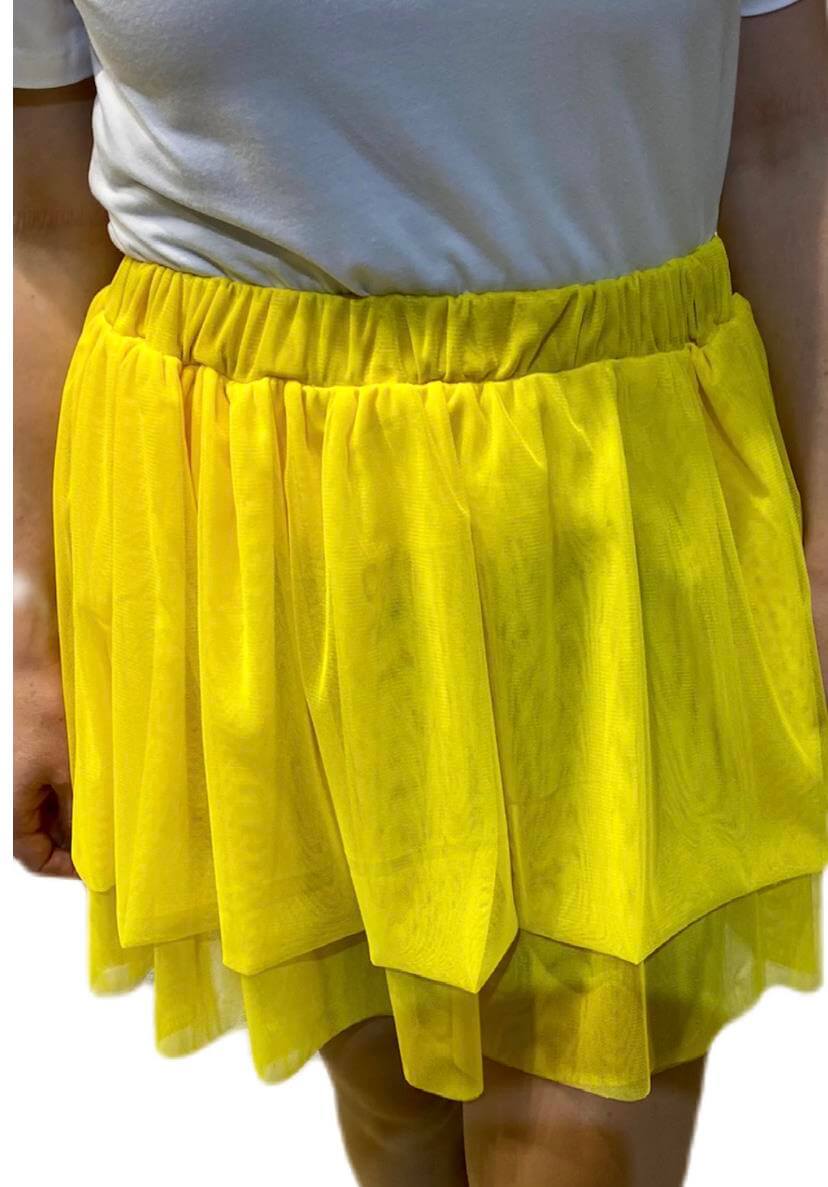 As suas coleções produzem uma seleção forte de roupas de dia a dia com um toque arrojado. Assim é esta saia de tule amarelo da Gusi. Com folhos e elástico na cintura. Combina para parte de cima com t-shirt mas dentro do mesmo estilo. A modelo está a vestir o tamanho S.