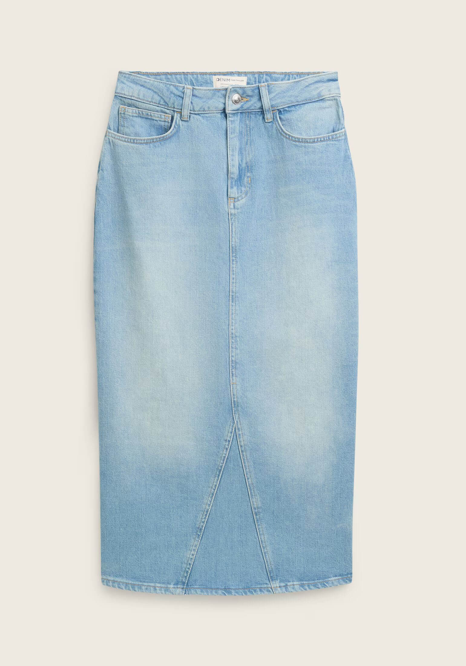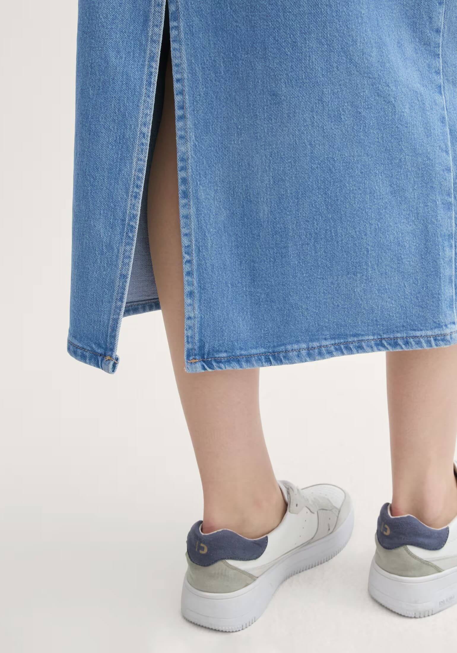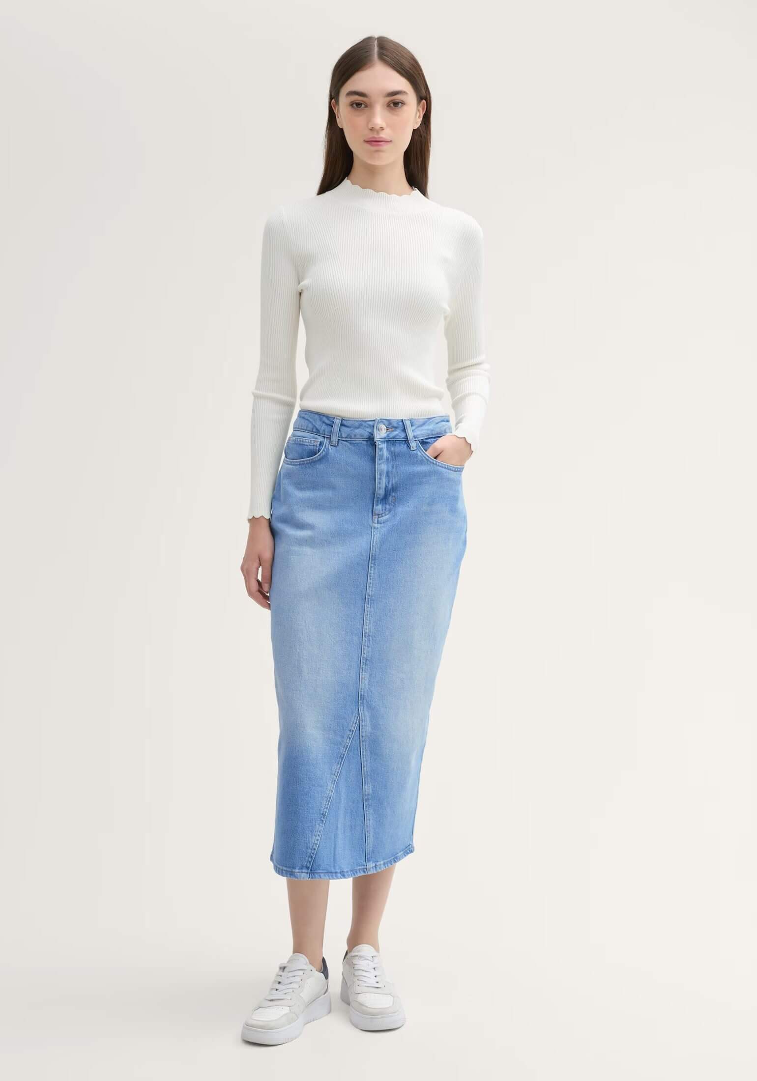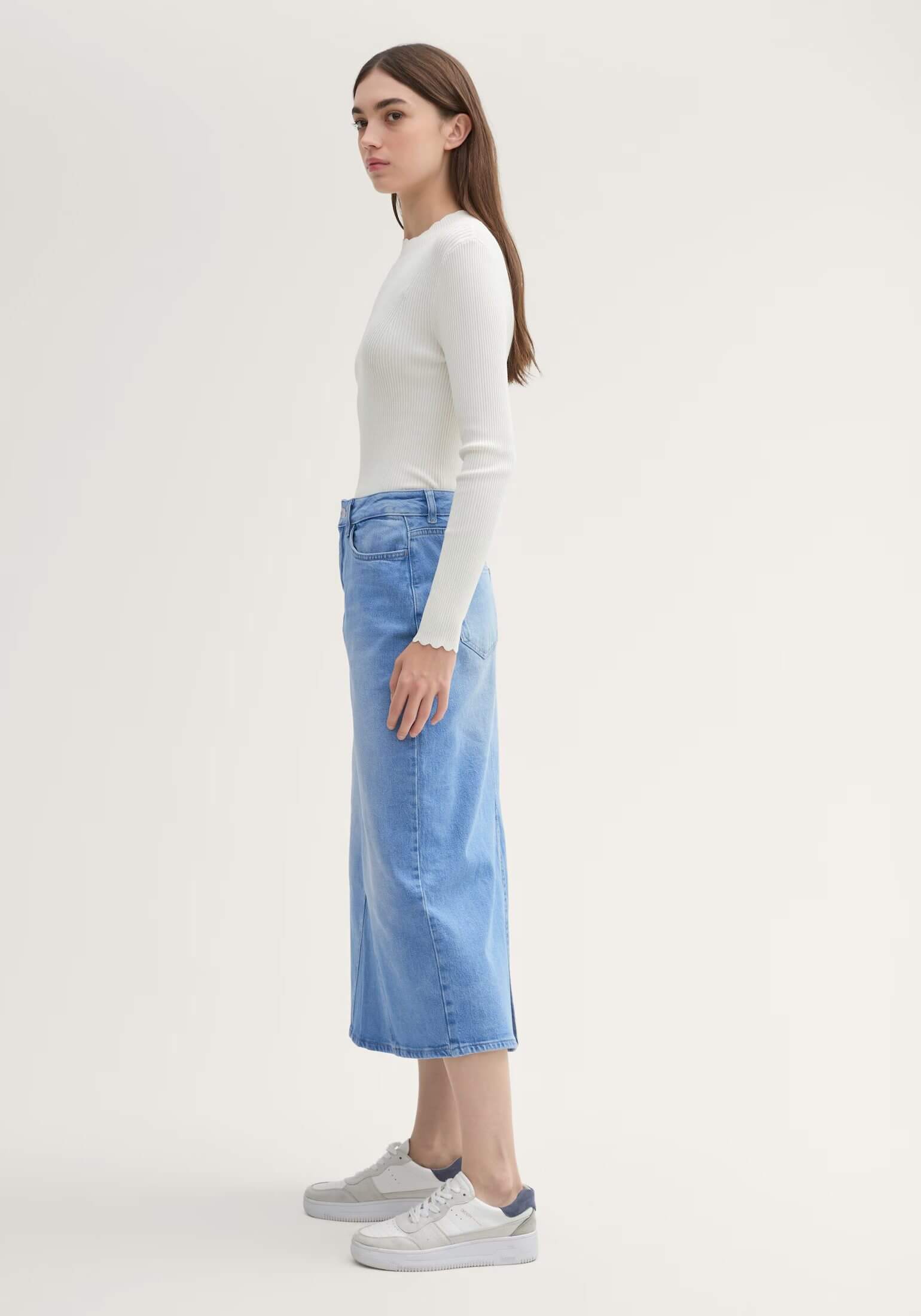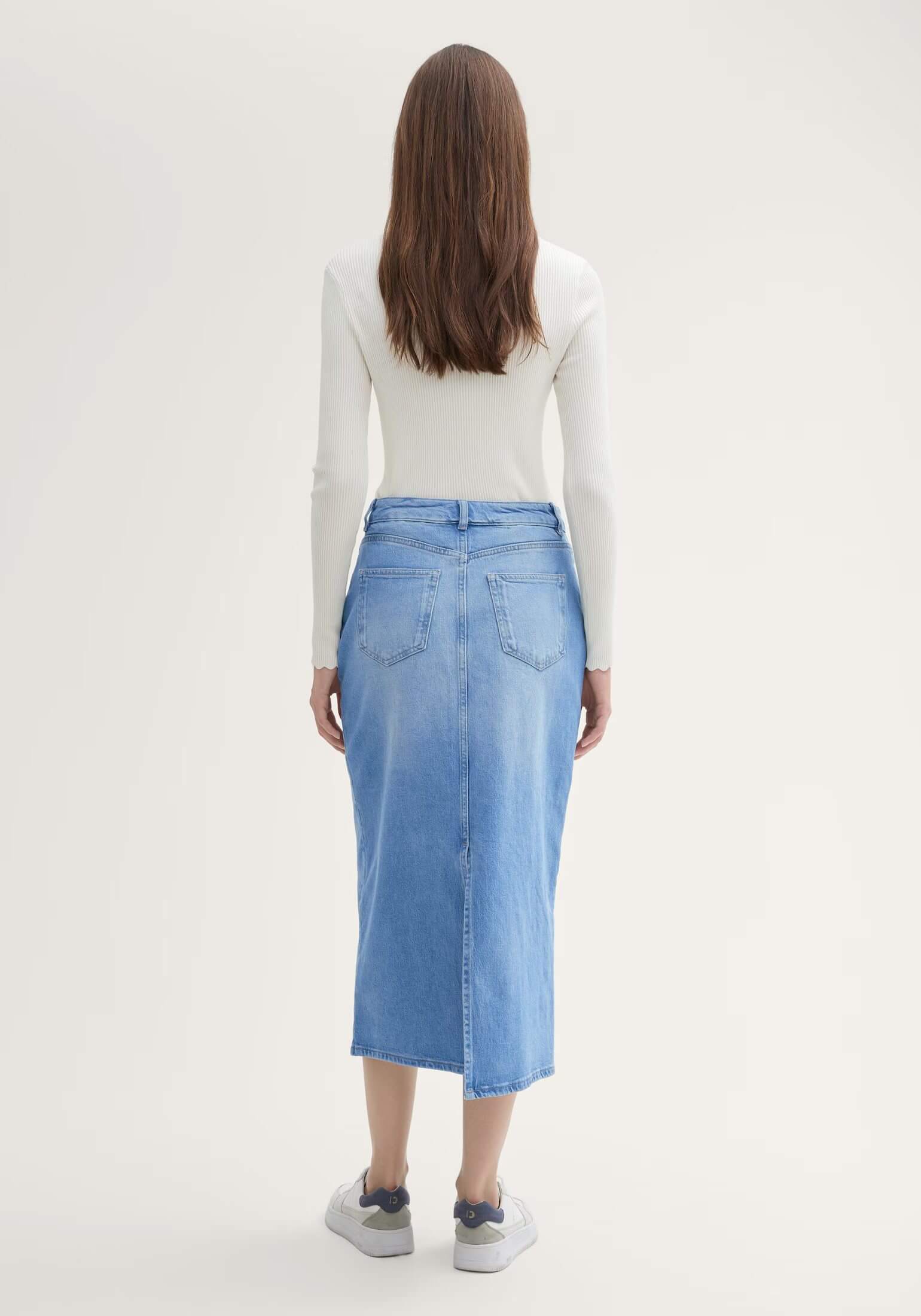 Conhecida por seu estilo urbano e design incomum, a Tom Tailor incorpora detalhes inovadores. Combinados com silhuetas inspiradas em streetwear e uma estética jovial. Assim é esta saia mídi de ganga da Tom Tailor. Apresenta corte com cinco bolsos, tem botões no cós e fecho na breguilha. Para parte de cima combina na perfeição com casaco de ganga, mas dentro do mesmo estilo. A modelo está a vestir o tamanho S.