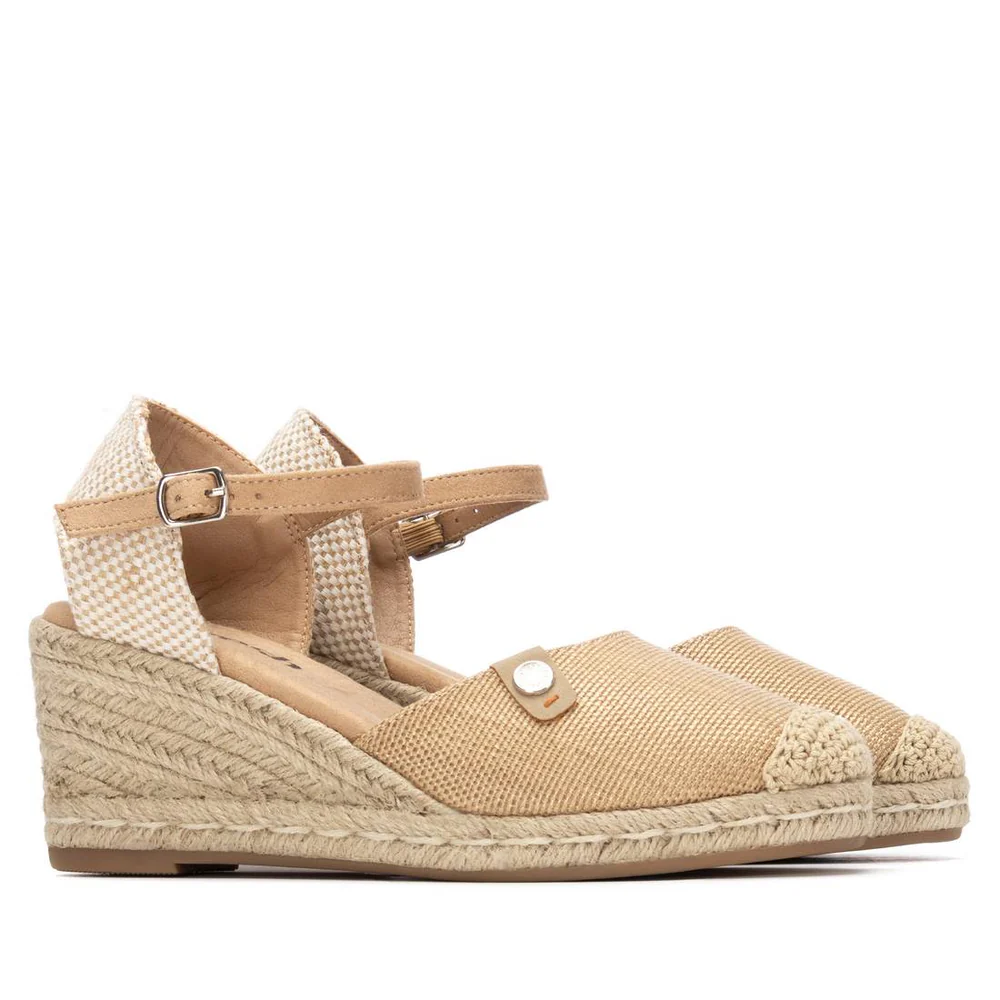 Conhecida por seu estilo urbano e design incomum, a Refresh incorpora detalhes inovadores. Combinados com silhuetas inspiradas em streetwear e uma estética jovial. Assim são estas sandálias beges de corda da Refresh. Apresenta cunha e fivela. Combina na perfeição com vestidos, mas dentro do mesmo estilo. O modelo está no tamanho 37.