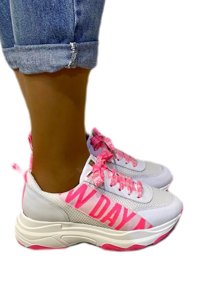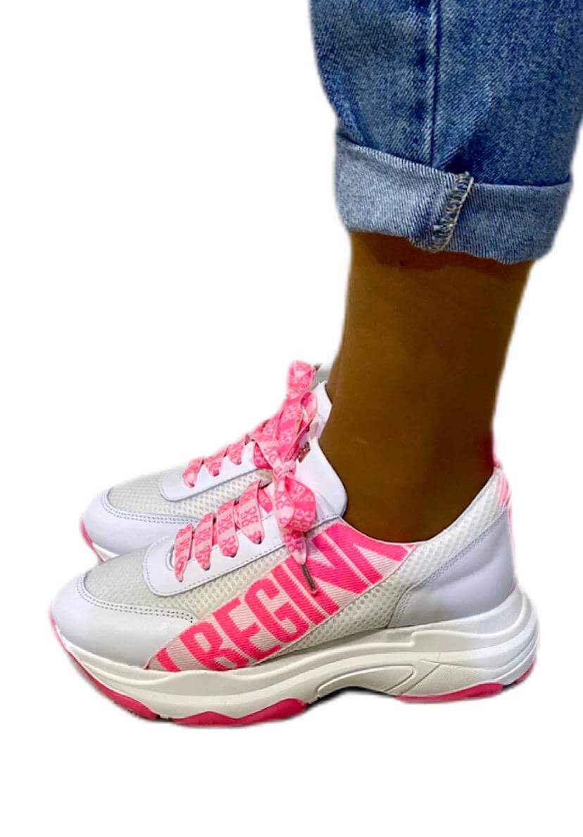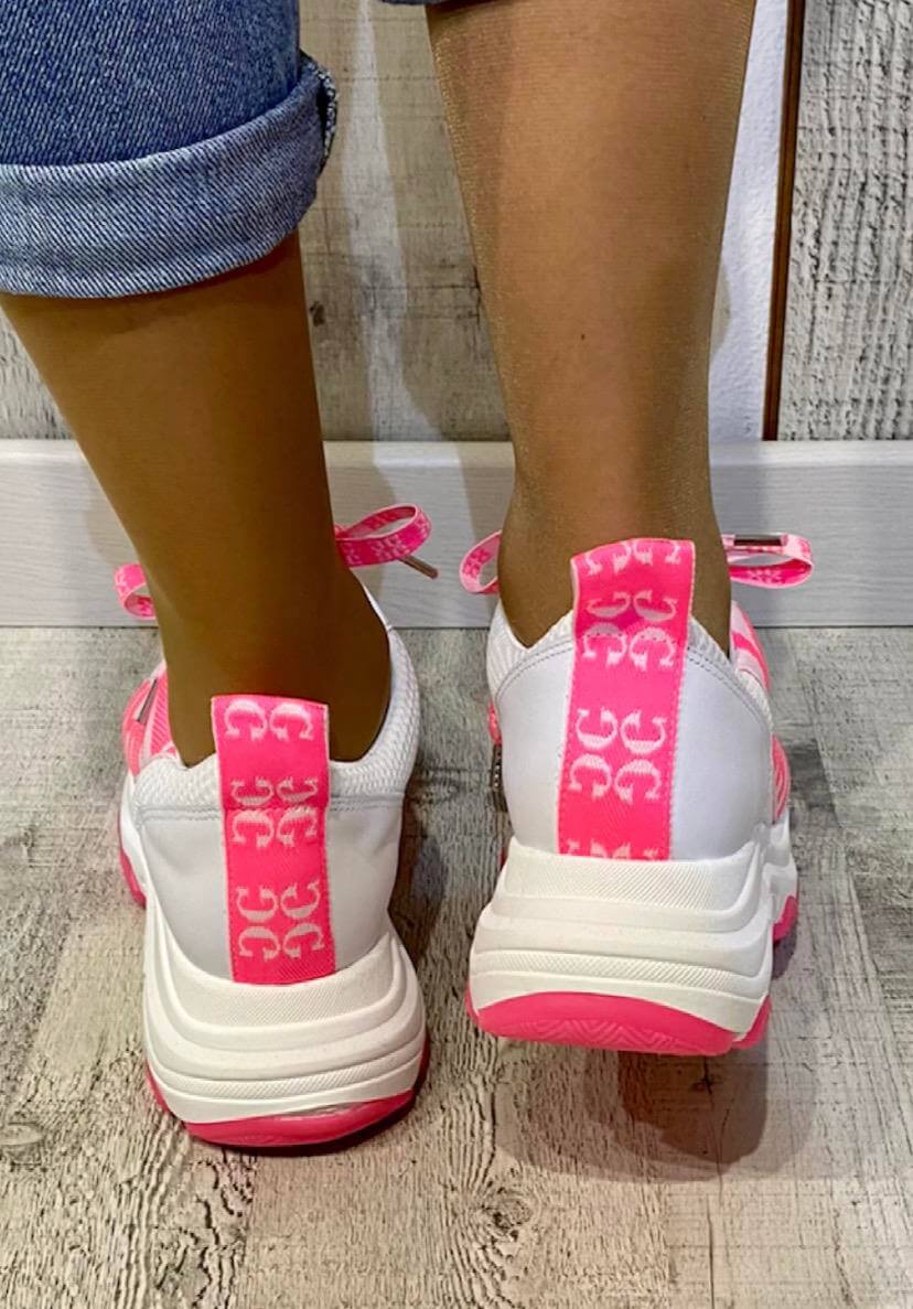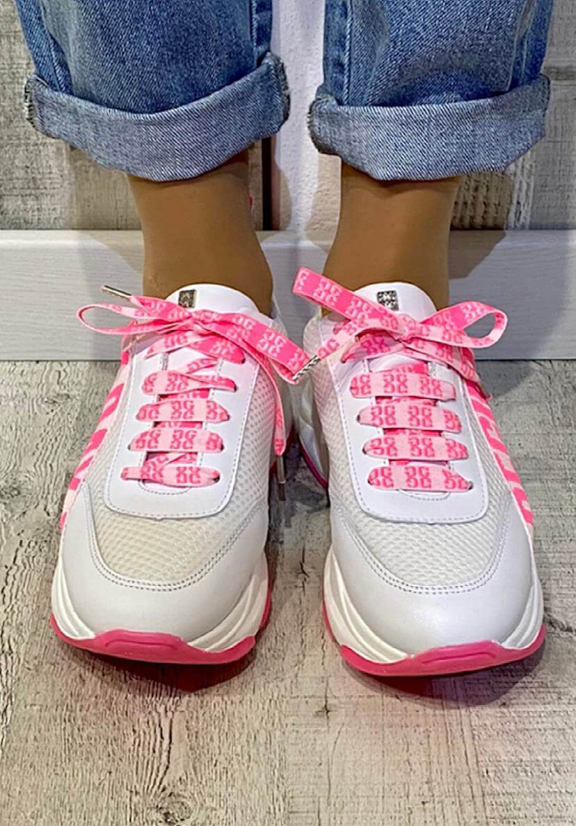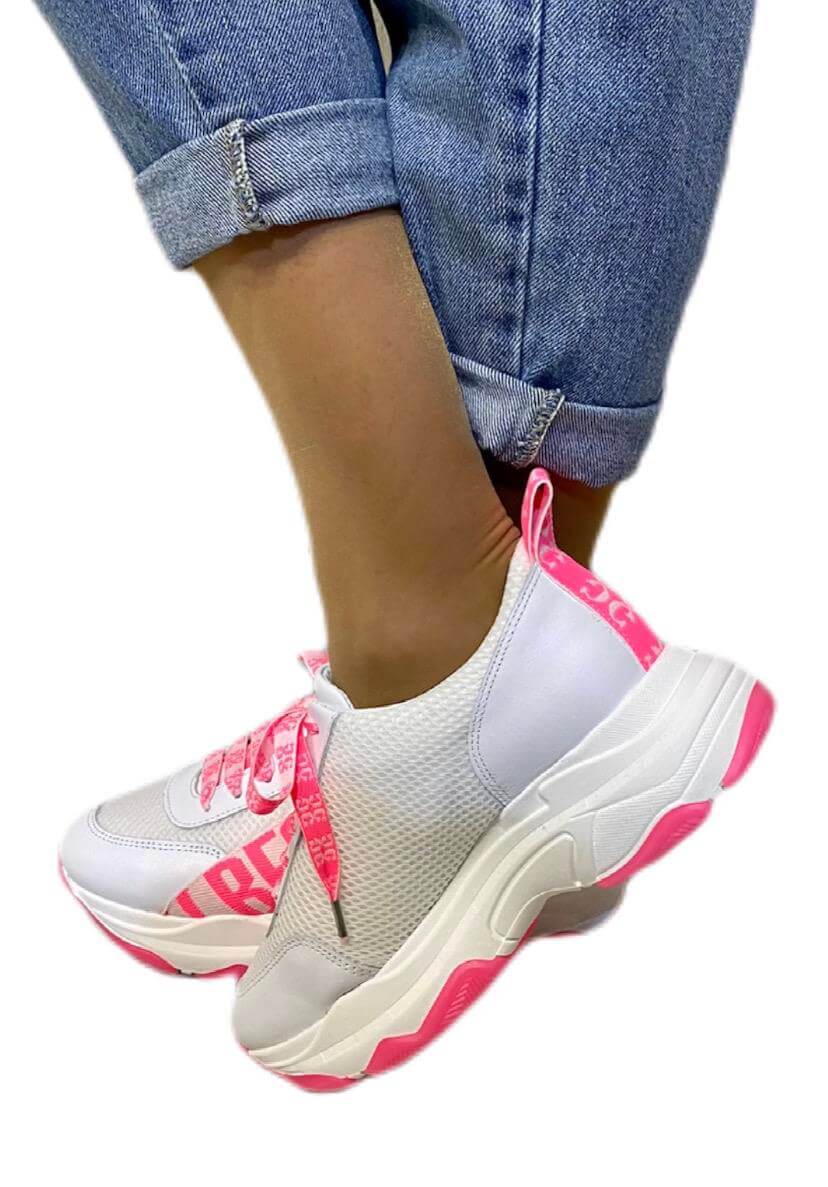 As suas coleções produzem uma seleção forte de roupas de dia a dia com um toque arrojado. Assim são estas sapatilhas brancas c/ rosa da Gusi. Com atacadores e rasto em borracha. Combina para parte de baixo com jeans mas dentro do mesmo estilo. A modelo está a calçar o tamanho 38.