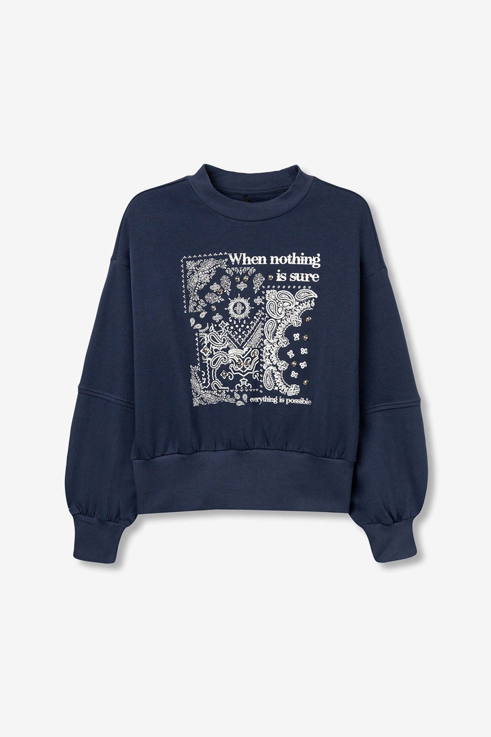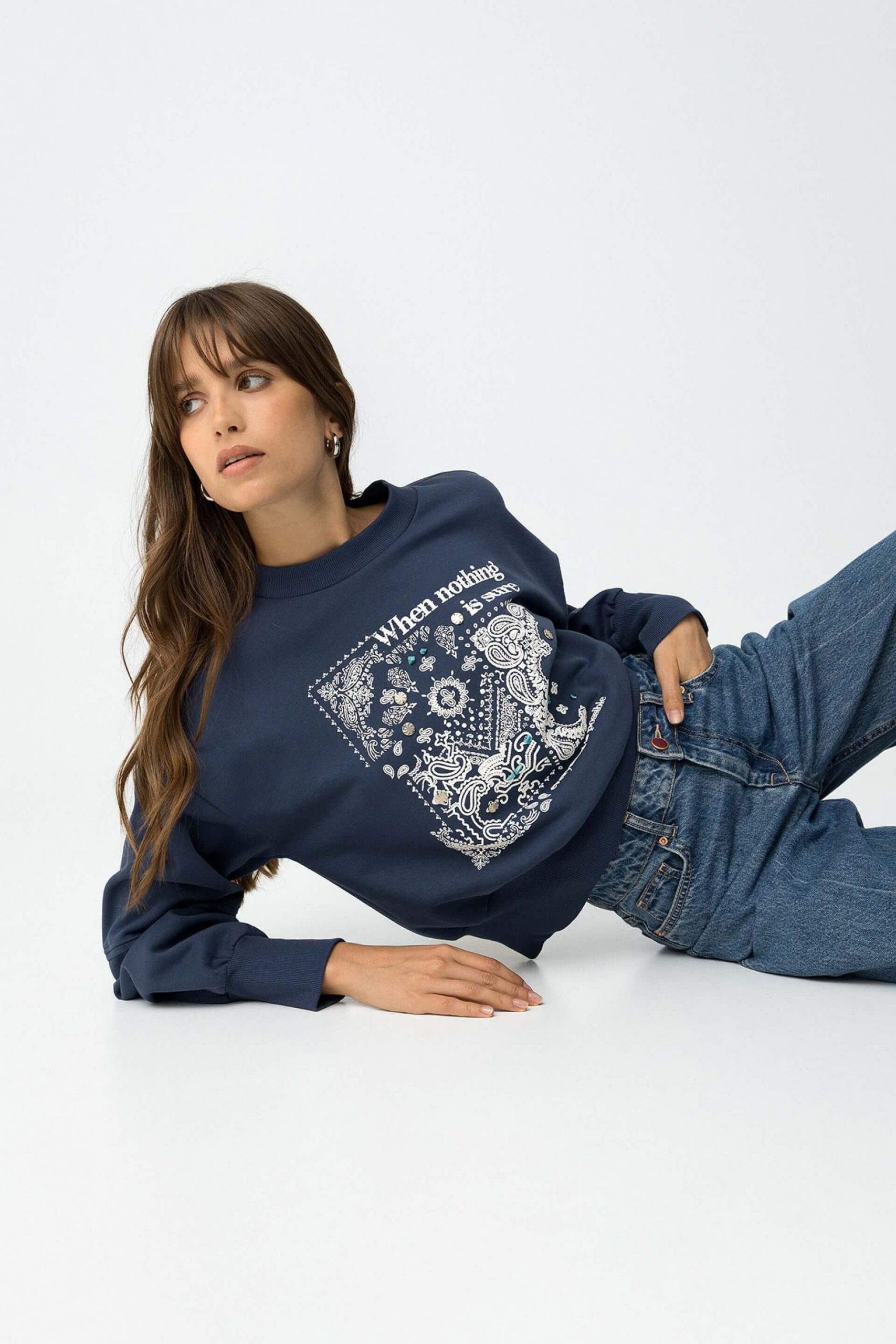 Pense em silhuetas dos anos 80, painéis pesados, denim super skinny e estampas de bandana. Pois bem essa era voltou aos dias de hoje. Assim é esta sweat regular azul c/ estampa da Tiffosi. Apresenta decote redondo e manga comprida. Para parte de baixo combina na perfeição com jeans mas a dar com o tom. A manequim está a vestir o tamanho S.