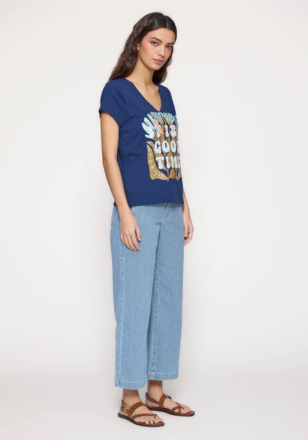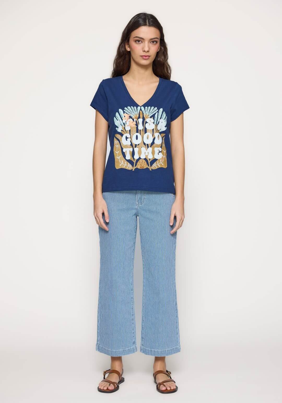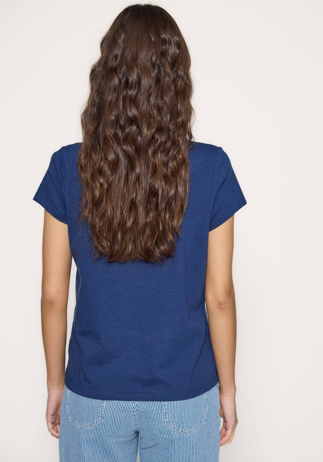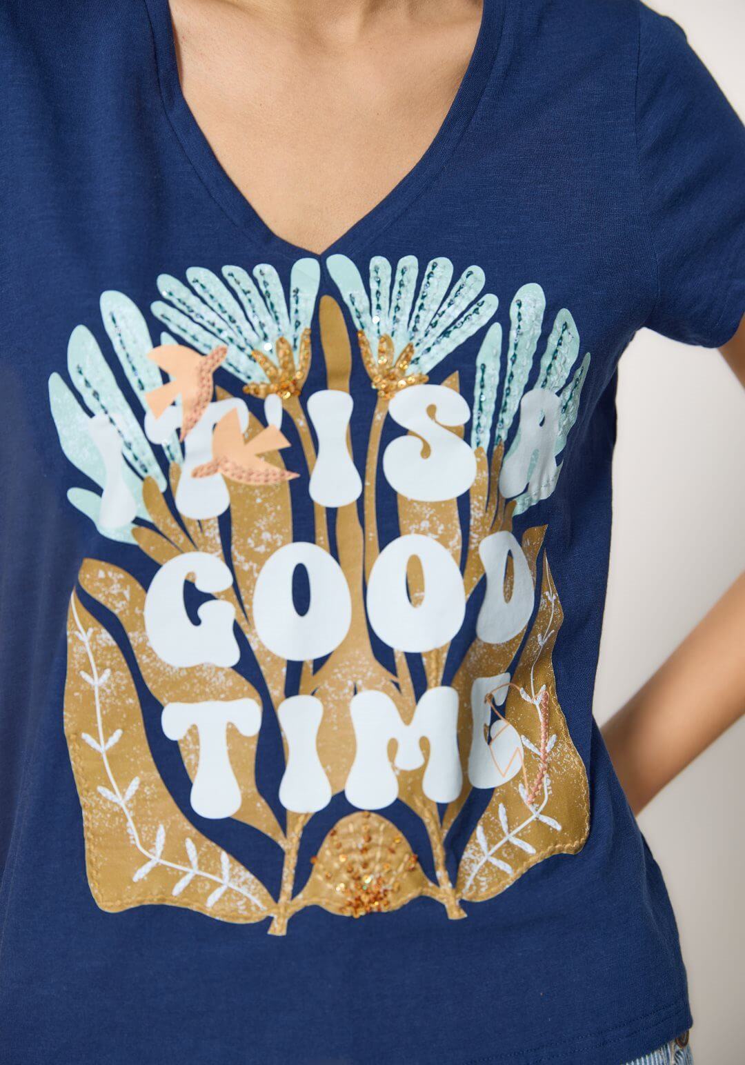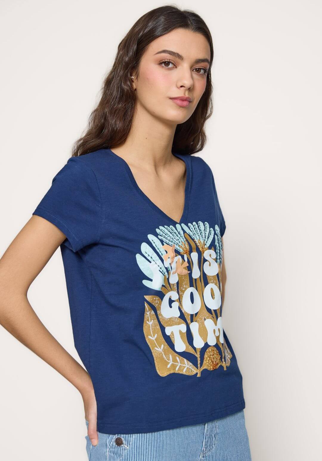 Projetado pela Md`m para mulheres decididas e atraentes, inspira-se nesta coleção em viagens ao redor do mundo. Pense em roupas brilhantes e bonitas, com prints únicos. Bordados inconfundíveis, que a levarão bela até ao final da jornada de trabalho. Assim é esta t-shirt azul c/ decote em bico da Md`m. Apresenta decote e bico e manga curta. Pode ser usado com calça para baixo, além disso, pode combinar com sapato alto. A modelo está a vestir o tamanho S.
