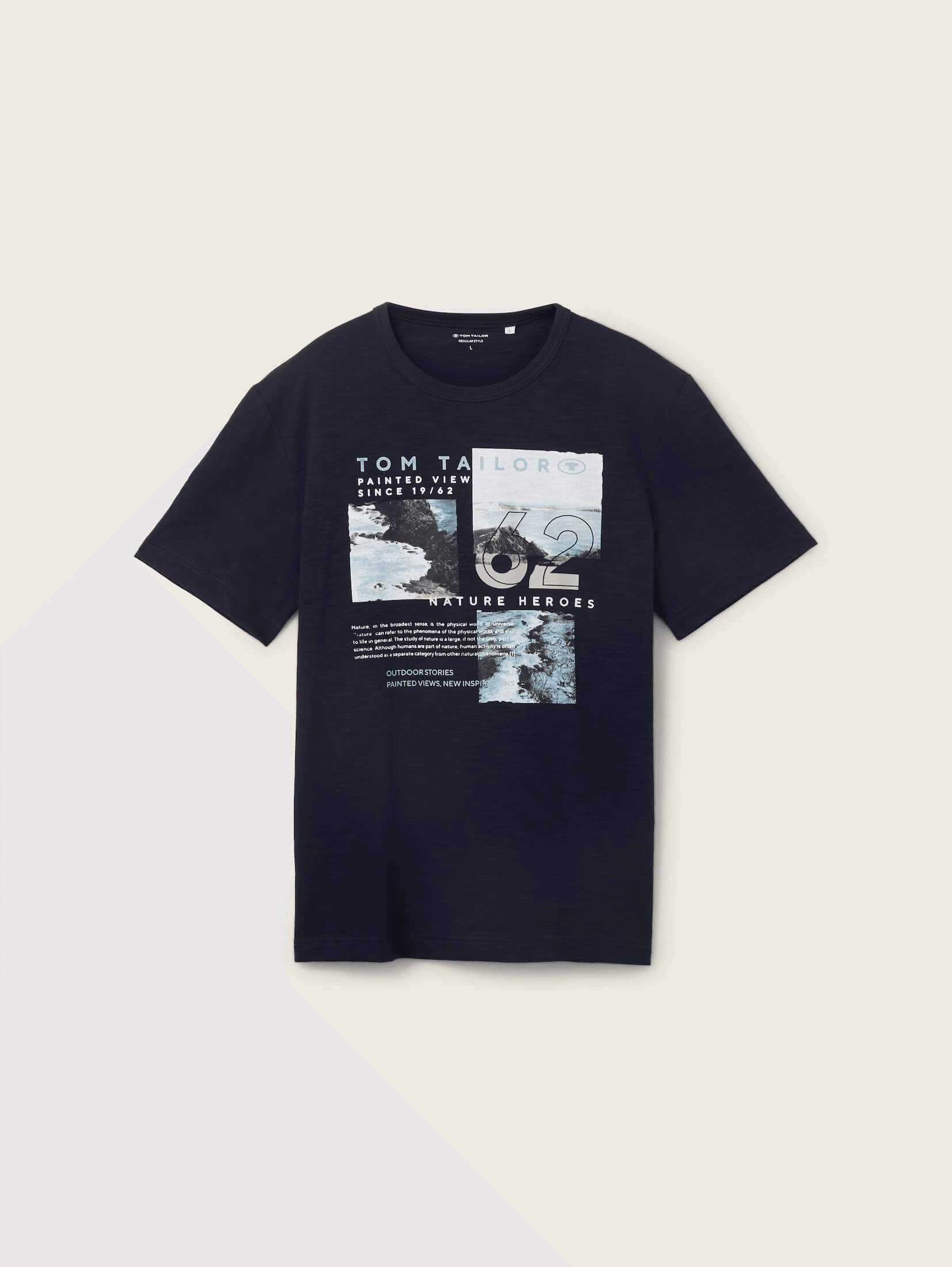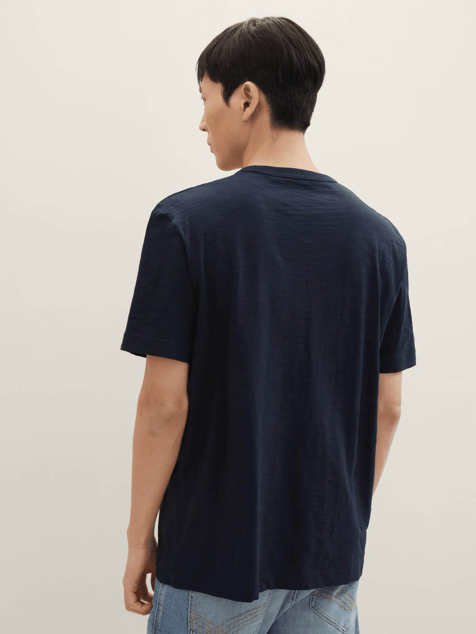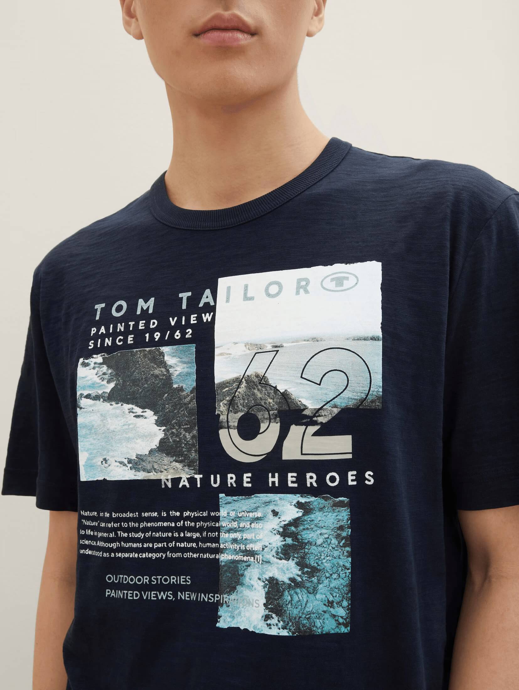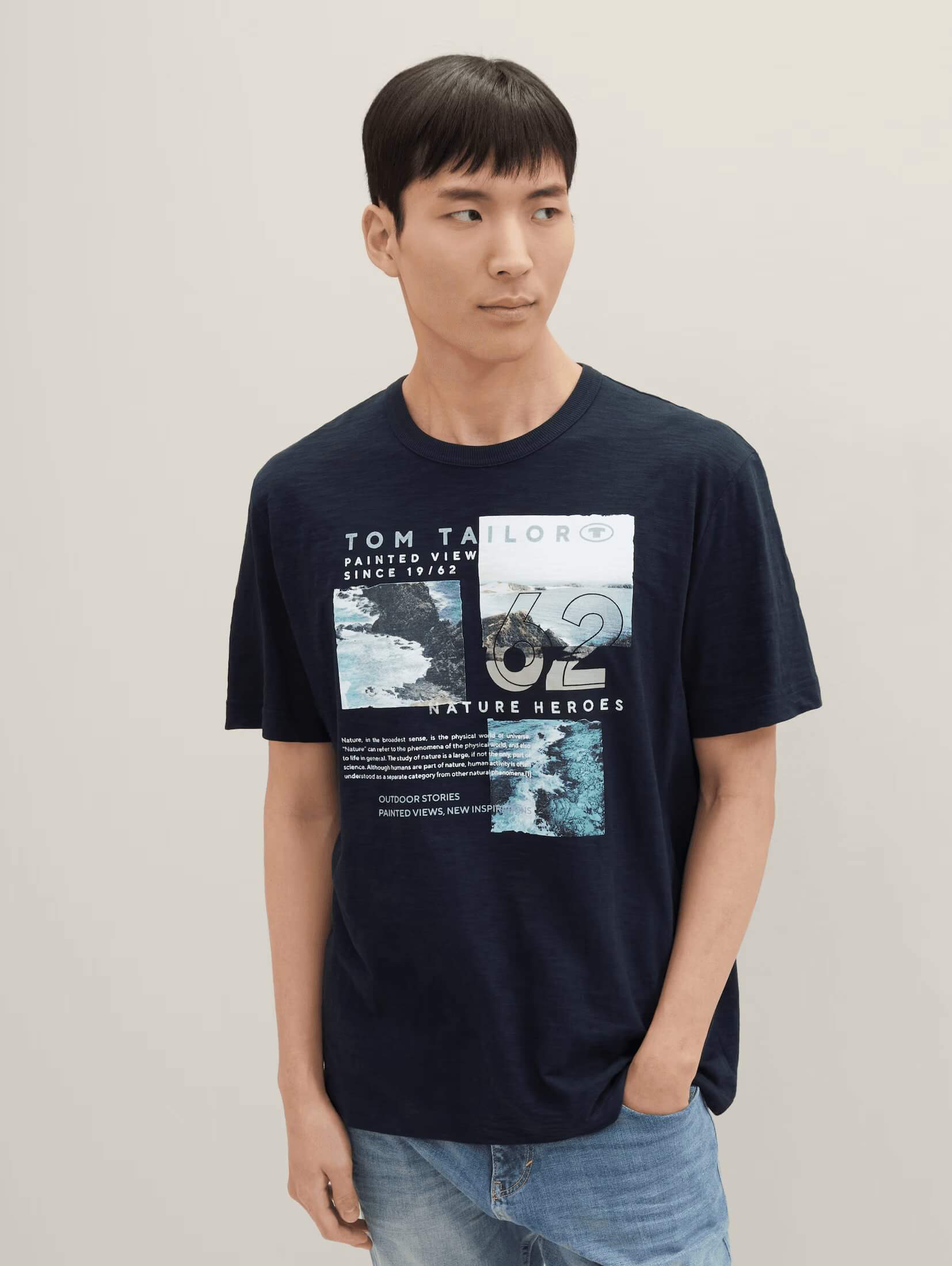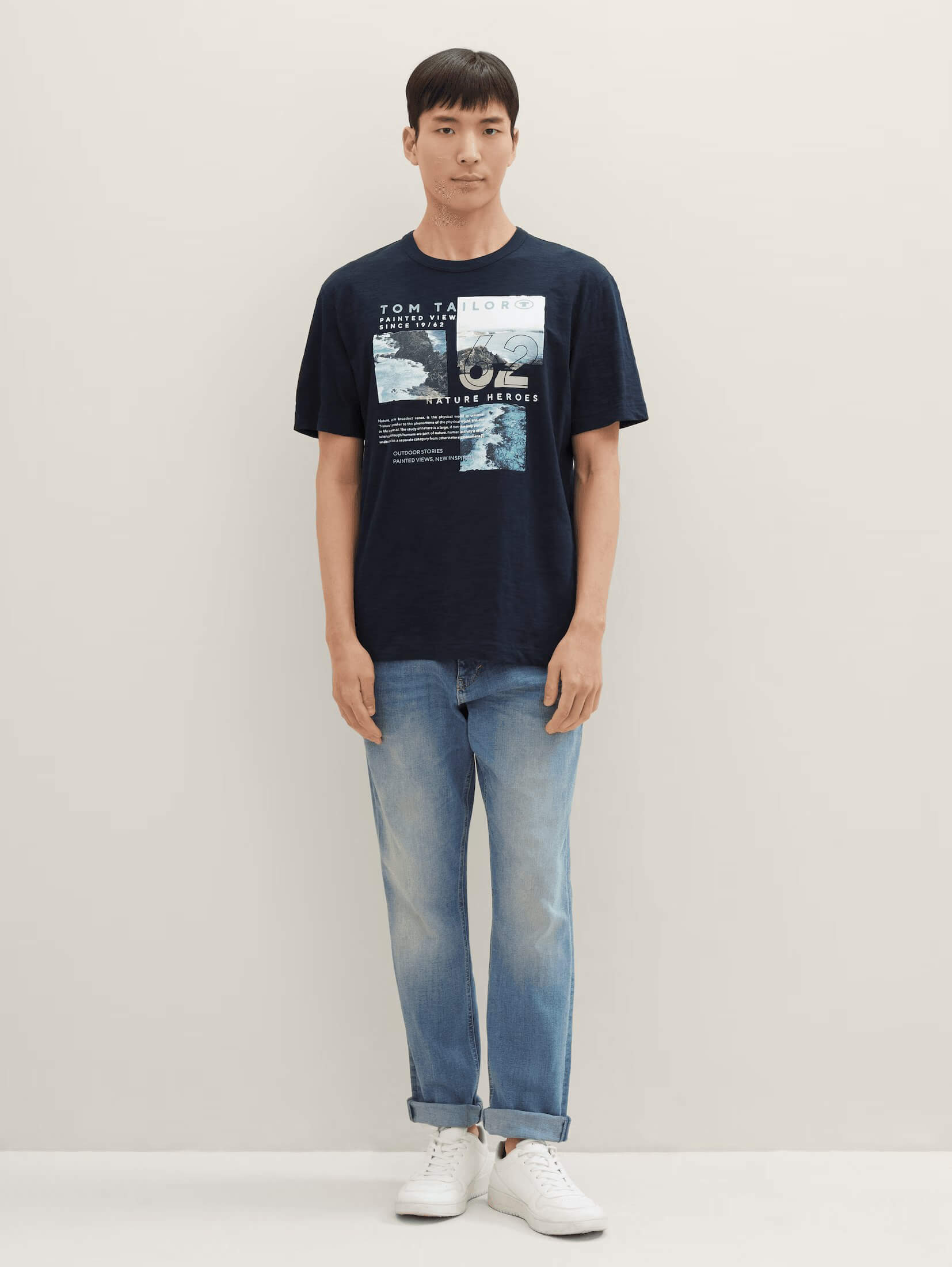 Conhecida por seu estilo urbano e design incomum, a Tom Tailor incorpora detalhes inovadores. Combinados com silhuetas inspiradas em streetwear e uma estética jovial. Assim é esta t-shirt azul escuro c/ estampa da Tom Tailor. Apresenta manga curta e decote redondo. Para parte de baixo combina na perfeição com jeans, mas dentro do mesmo estilo. O modelo está a vestir o tamanho S.